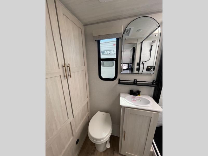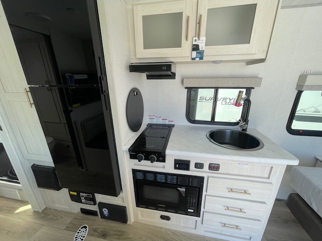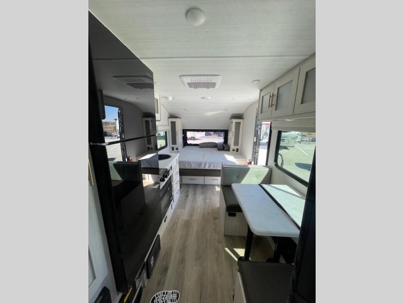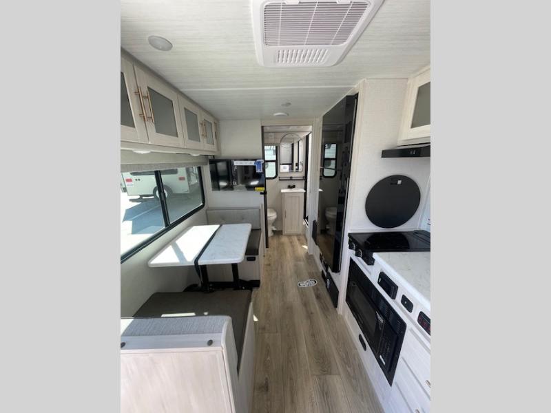 You're going to love all of the conveniences and versatility of this travel trailer! The front Murphy bed can fold away to reveal a sofa which gives you a comfortable place to sit during the day and to sleep at night too. The rear full bath features everything you will need to get squeaky clean each morning, as well as a large wardrobe for you to store your linens. After you have whipped up your best meal with the two-burner cooktop or an airy fryer microwave, you can head to the booth dinette and enjoy eating it there comfortably.