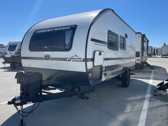 With any R-Pod travel trailer by Forest River, you will enjoy affordable luxury at the lowest tow weight in its class! There is a sealed underbelly with forced heat, a curved dual-pane acrylic front window with a bug screen and night shade, plus a large roof mounted solar panel for off-grid capabilities. The 15K A/C unit will keep you comfortable during the summer camping months, and the tankless water heater will provide endless hot showers after hiking, biking, swimming and more! Each model also includes a black glass friction hinge entrance door, roof ladder prep, exterior motion lighting, plus a hot and cold exterior spray port to wash off sand from the beach. Inside, you'll enjoy seamless Surf-X kitchen countertops, blackout roller shades, and a central vacuum system for hassle-free cleaning!