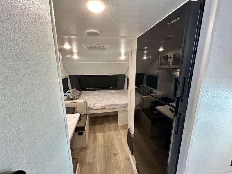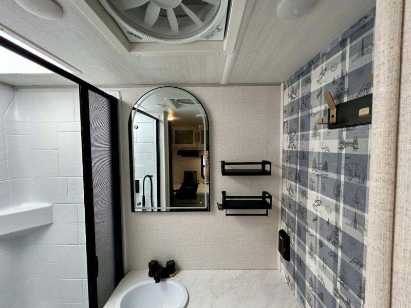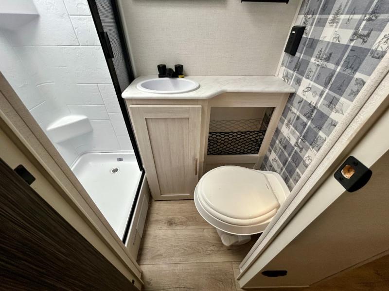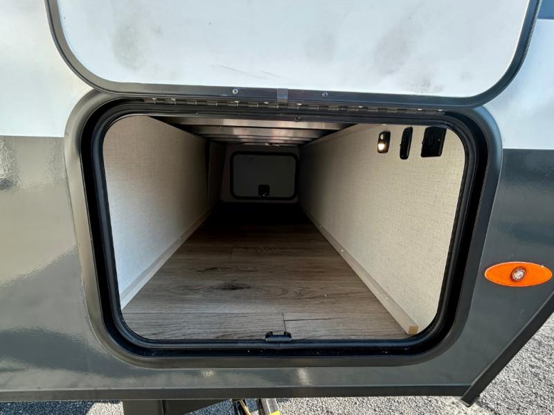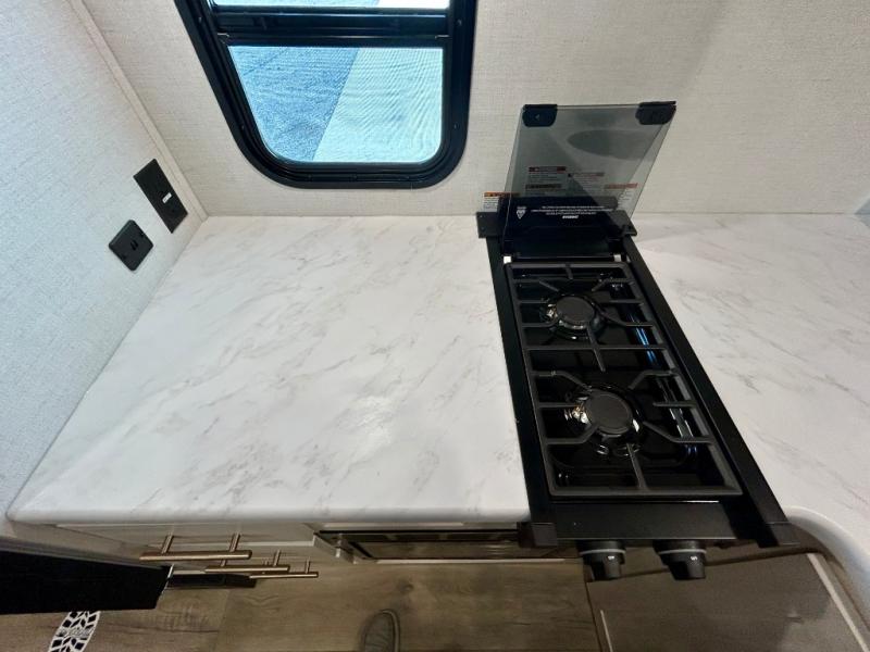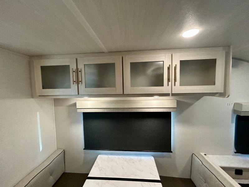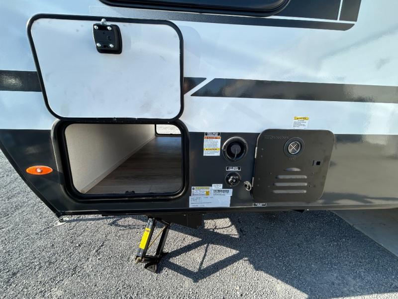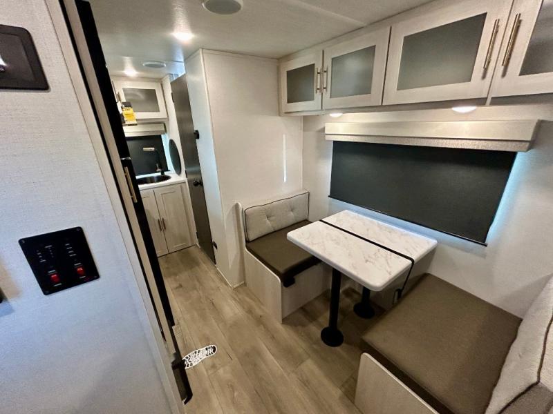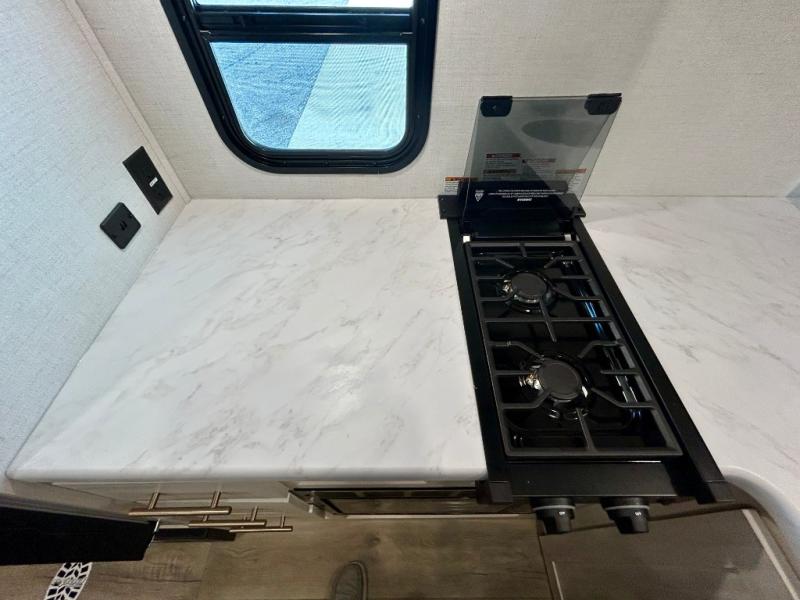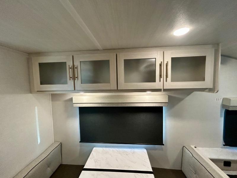 This travel trailer is the perfect couple's trailer with sleeping space for an overnight guest on the booth dinette. You will enjoy the front queen bed for a great night's rest, and there is a full bath on board to clean up each day. A two burner cooktop in the kitchen will let you cook meals inside instead of over a fire outside, and there is ample counter space to set out the meal. After dinner is cleaned up, head outdoors to relax under the 11' power awning!