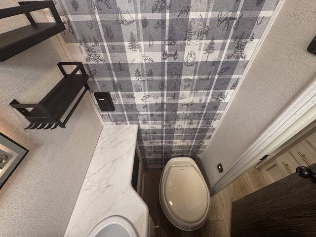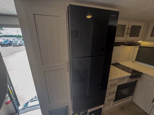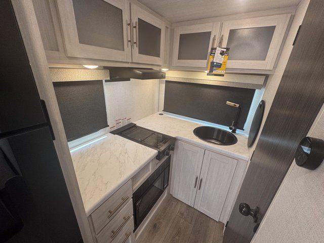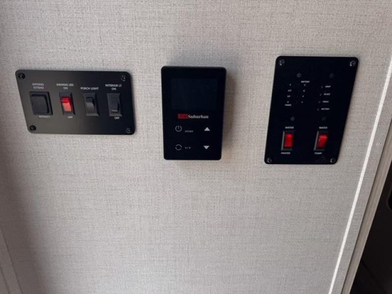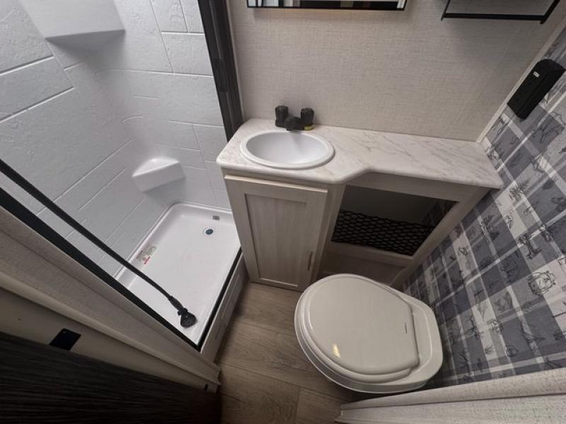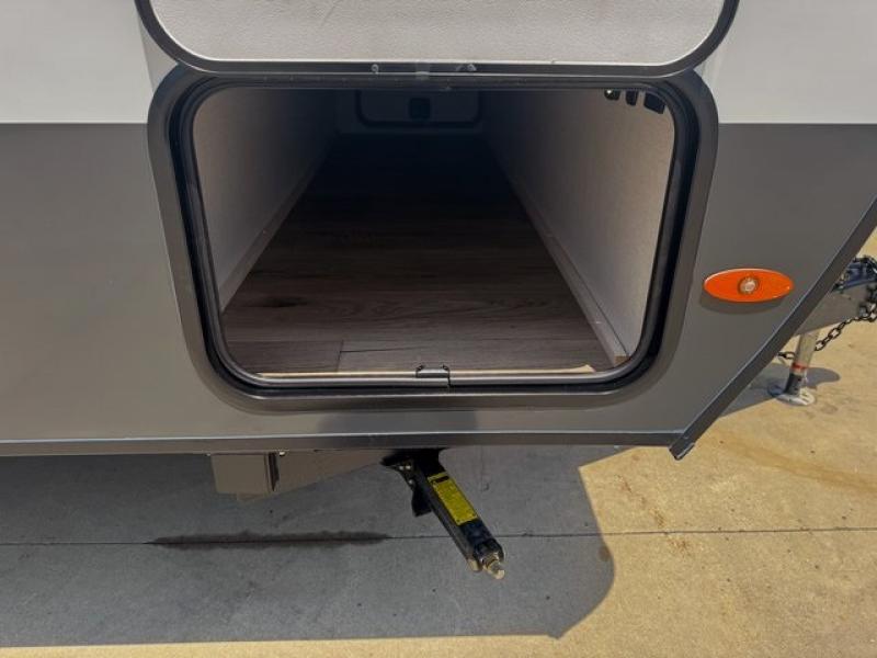 This travel trailer is the perfect couple's trailer with sleeping space for an overnight guest on the booth dinette. You will enjoy the front queen bed for a great night's rest, and there is a full bath on board to clean up each day. A two burner cooktop in the kitchen will let you cook meals inside instead of over a fire outside, and there is ample counter space to set out the meal. After dinner is cleaned up, head outdoors to relax under the 11' power awning!