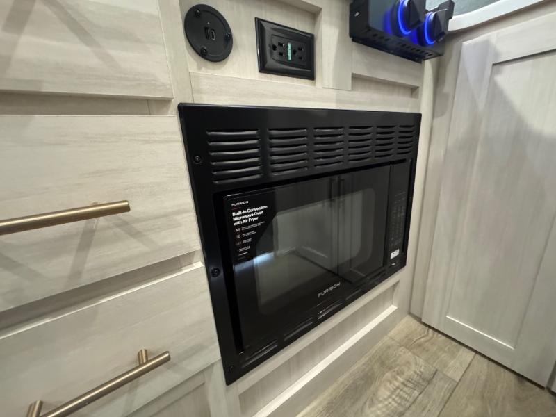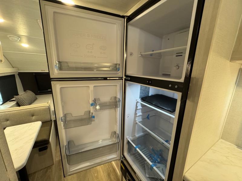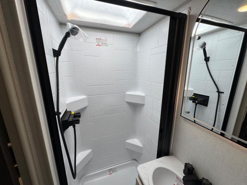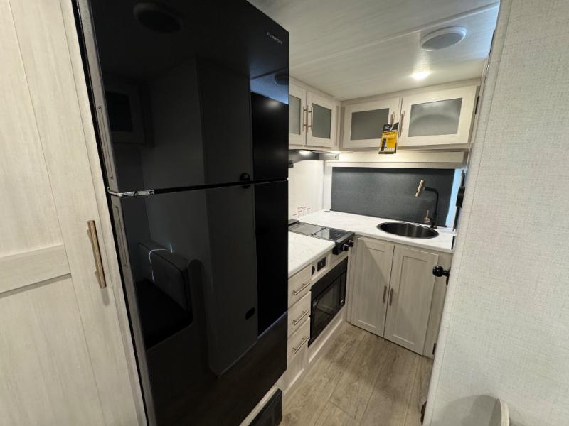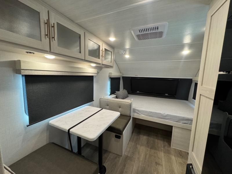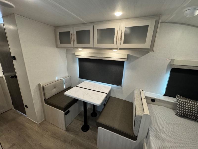 This travel trailer is the perfect couple's trailer with sleeping space for an overnight guest on the booth dinette. You will enjoy the front queen bed for a great night's rest, and there is a full bath on board to clean up each day. A two burner cooktop in the kitchen will let you cook meals inside instead of over a fire outside, and there is ample counter space to set out the meal. After dinner is cleaned up, head outdoors to relax under the 11' power awning!