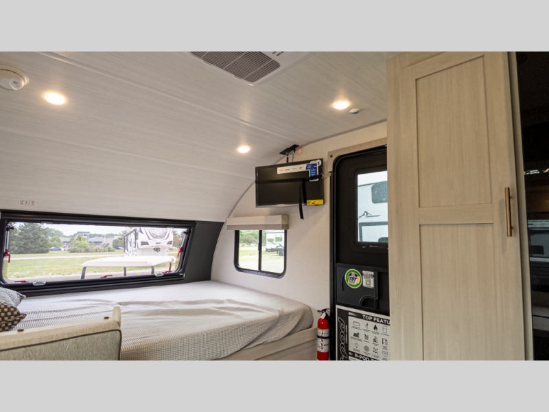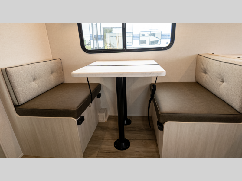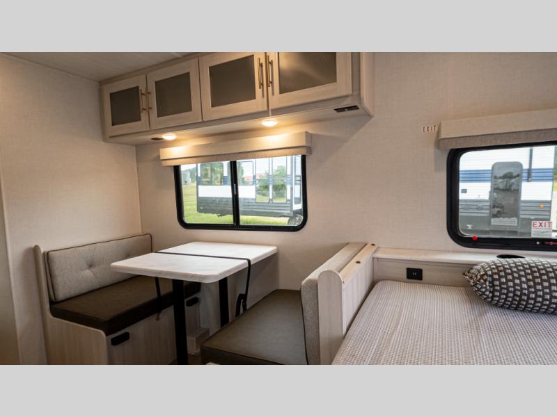- Efficient layout: Murphy-style queen bed up front converts, booth dinette sleeps extra guest