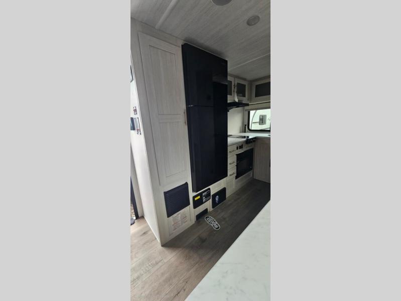 This travel trailer is the perfect couple's trailer with sleeping space for an overnight guest on the booth dinette. You will enjoy the front queen bed for a great night's rest, and there is a full bath on board to clean up each day. A two burner cooktop in the kitchen will let you cook meals inside instead of over a fire outside, and there is ample counter space to set out the meal. After dinner is cleaned up, head outdoors to relax under the 11' power awning!