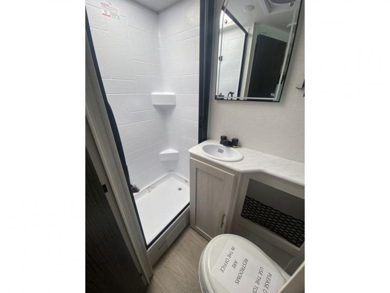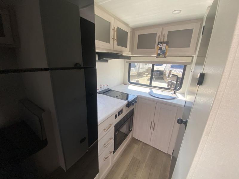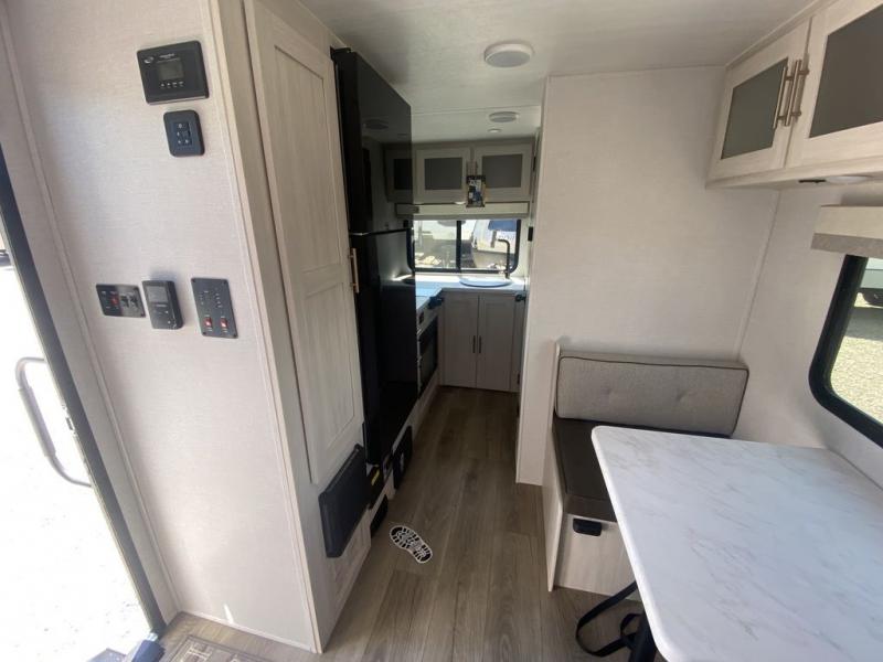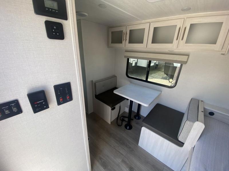 This travel trailer is the perfect couple's trailer with sleeping space for an overnight guest on the booth dinette. You will enjoy the front queen bed for a great night's rest, and there is a full bath on board to clean up each day. A two burner cooktop in the kitchen will let you cook meals inside instead of over a fire outside, and there is ample counter space to set out the meal. After dinner is cleaned up, head outdoors to relax under the 11' power awning!