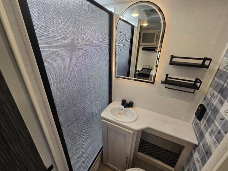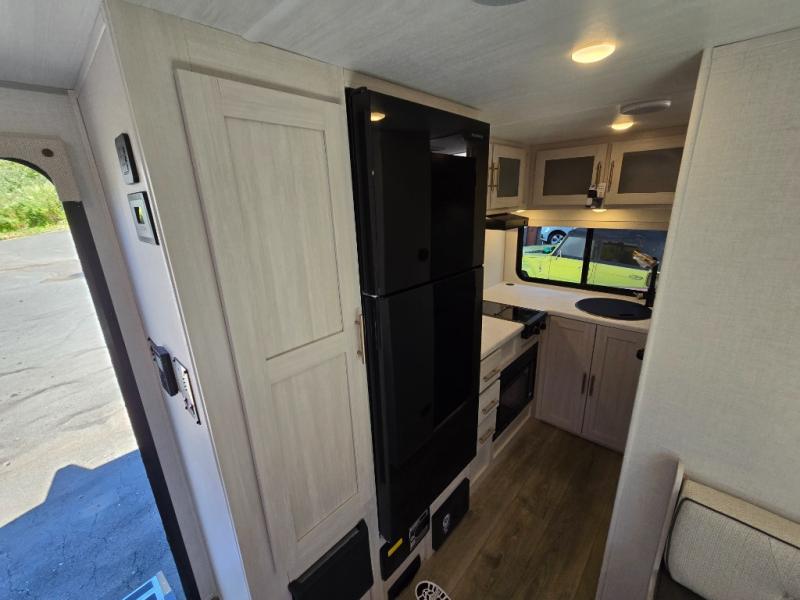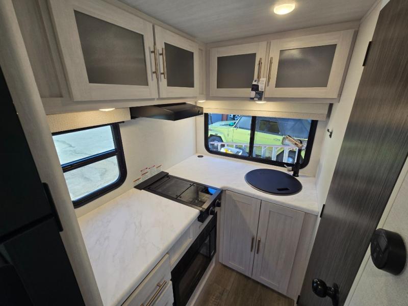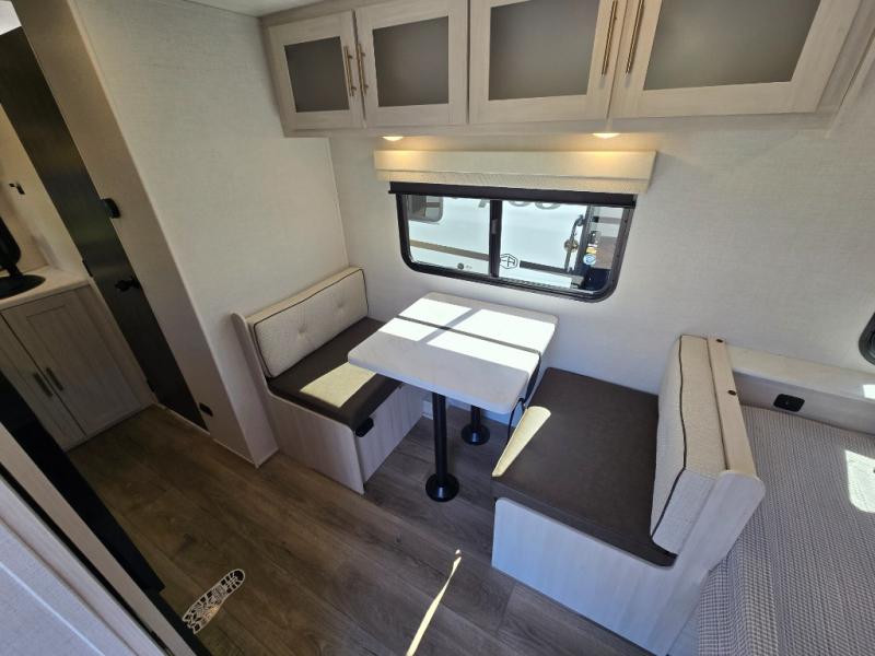 This travel trailer is the perfect couple's trailer with sleeping space for an overnight guest on the booth dinette. You will enjoy the front queen bed for a great night's rest, and there is a full bath on board to clean up each day. A two burner cooktop in the kitchen will let you cook meals inside instead of over a fire outside, and there is ample counter space to set out the meal. After dinner is cleaned up, head outdoors to relax under the 11' power awning!
