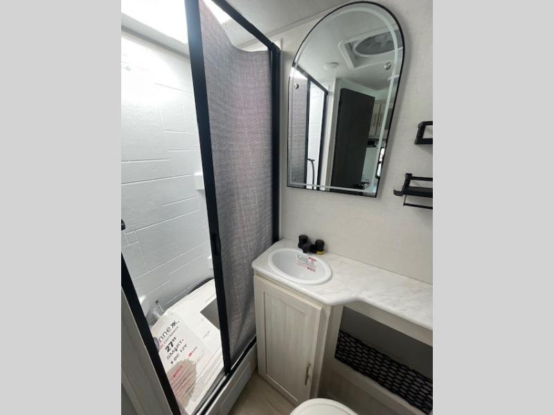 This travel trailer is the perfect couple's trailer with sleeping space for an overnight guest on the booth dinette. You will enjoy the front queen bed for a great night's rest, and there is a full bath on board to clean up each day. A two burner cooktop in the kitchen will let you cook meals inside instead of over a fire outside, and there is ample counter space to set out the meal. After dinner is cleaned up, head outdoors to relax under the 11' power awning!