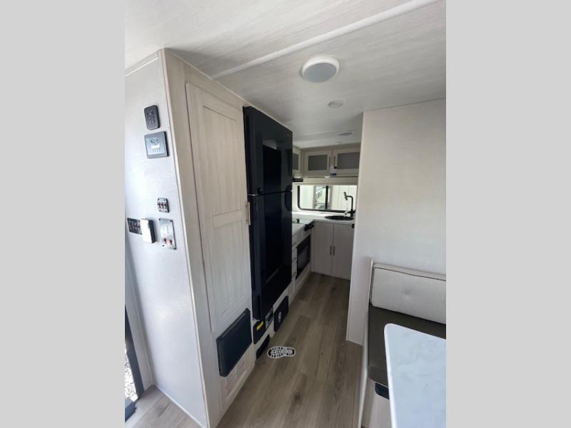 This travel trailer is the perfect couple's trailer with sleeping space for an overnight guest on the booth dinette. You will enjoy the front queen bed for a great night's rest, and there is a full bath on board to clean up each day. A two burner cooktop in the kitchen will let you cook meals inside instead of over a fire outside, and there is ample counter space to set out the meal. After dinner is cleaned up, head outdoors to relax under the 11' power awning!