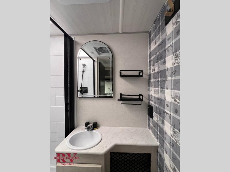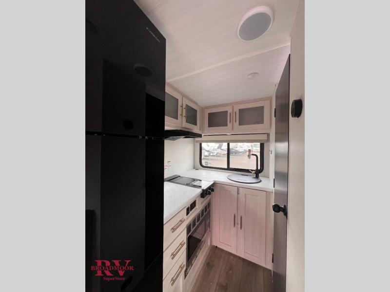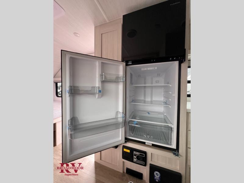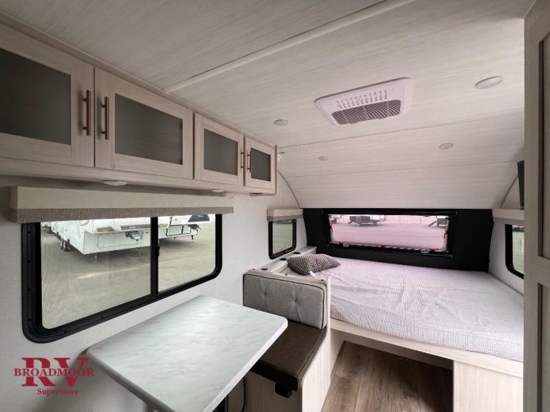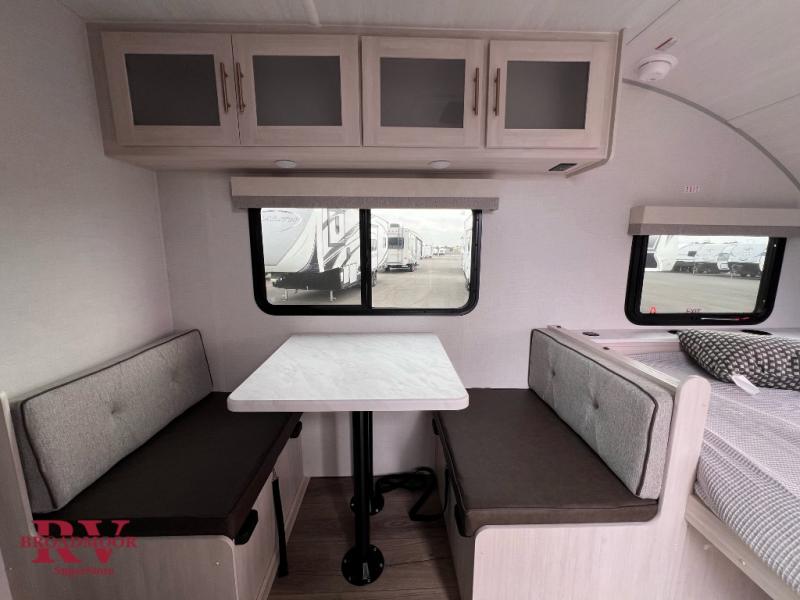 This travel trailer is the perfect couple's trailer with sleeping space for an overnight guest on the booth dinette. You will enjoy the front queen bed for a great night's rest, and there is a full bath on board to clean up each day. A two burner cooktop in the kitchen will let you cook meals inside instead of over a fire outside, and there is ample counter space to set out the meal. After dinner is cleaned up, head outdoors to relax under the 11' power awning!