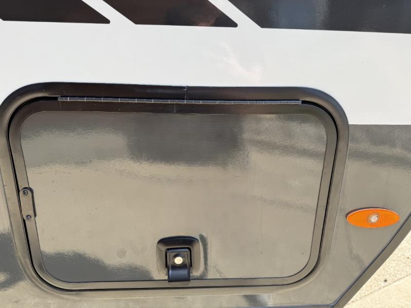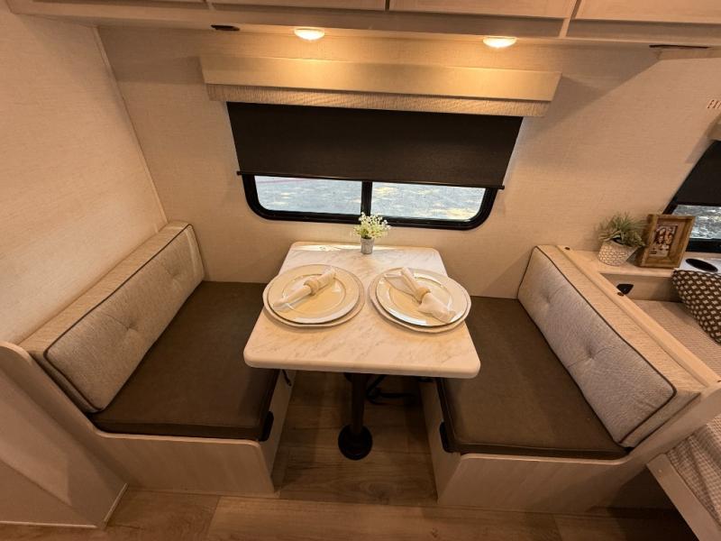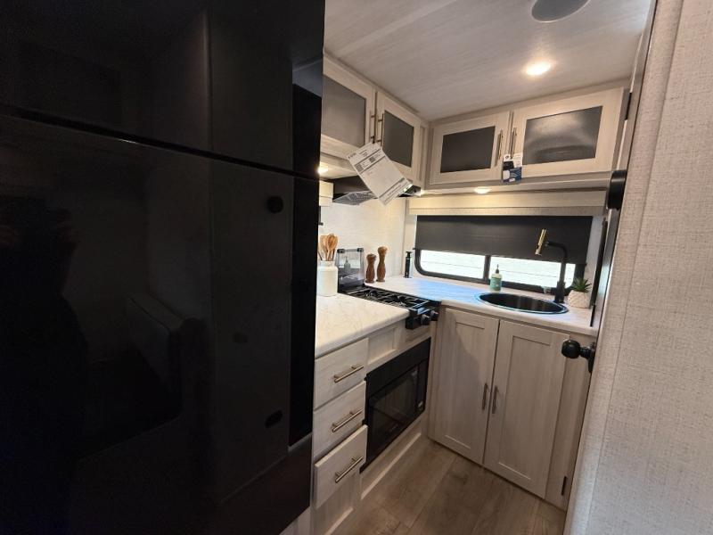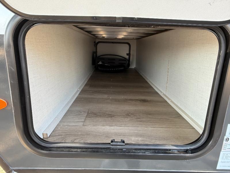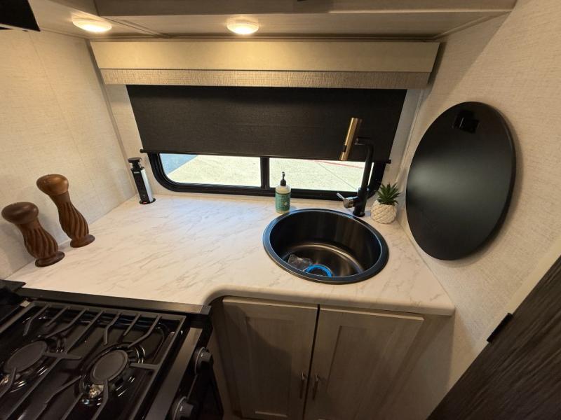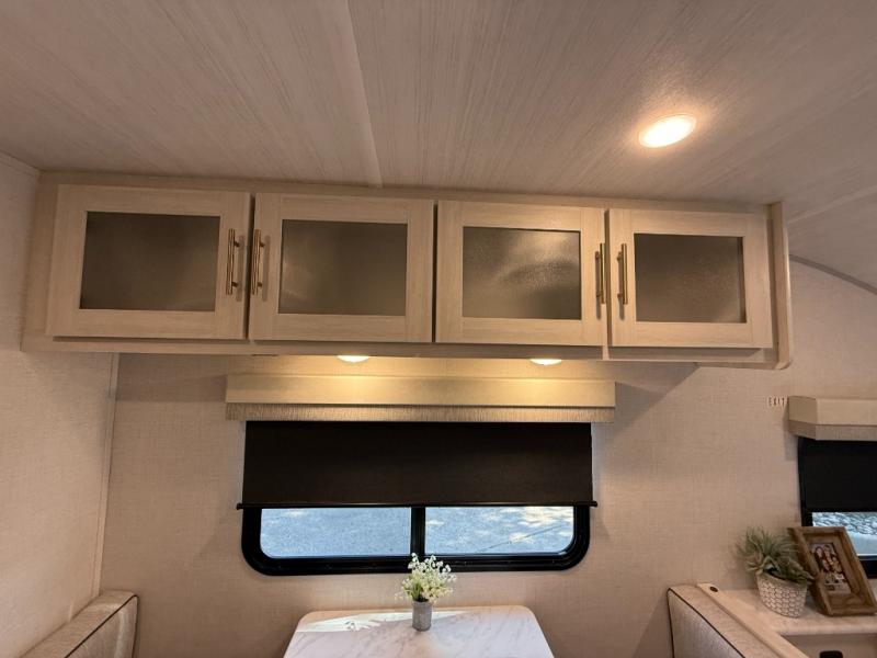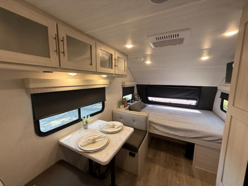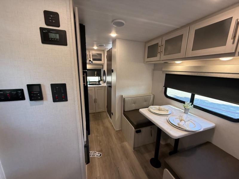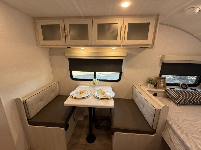This travel trailer is the perfect couple's trailer with sleeping space for an overnight guest on the booth dinette. You will enjoy the front queen bed for a great night's rest, and there is a full bath on board to clean up each day. A two burner cooktop in the kitchen will let you cook meals inside instead of over a fire outside, and there is ample counter space to set out the meal. After dinner is cleaned up, head outdoors to relax under the 11' power awning!