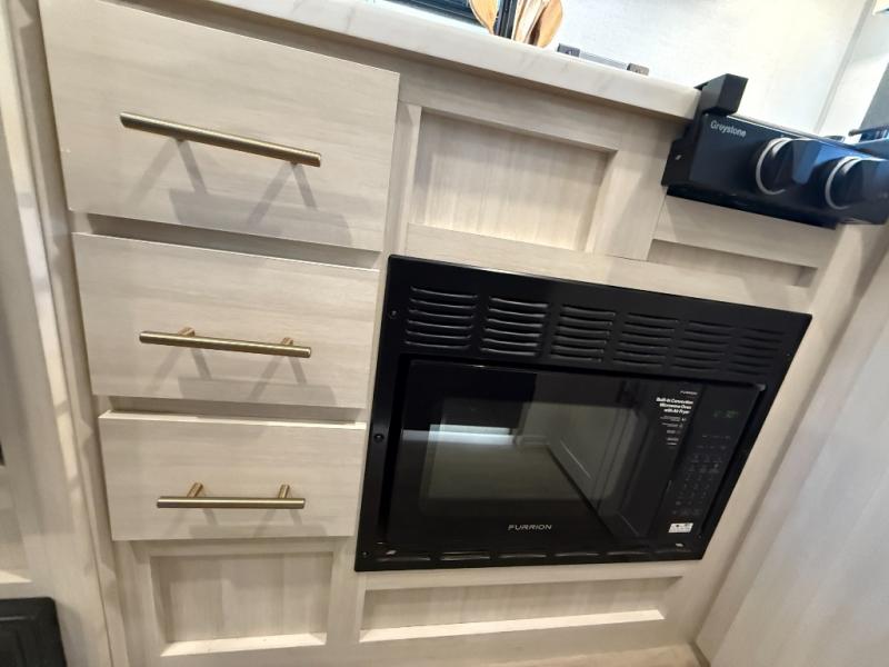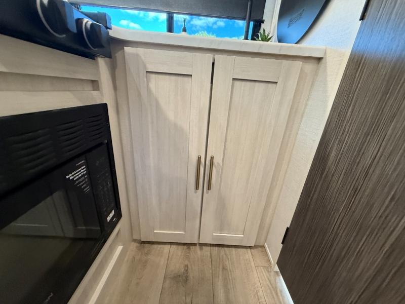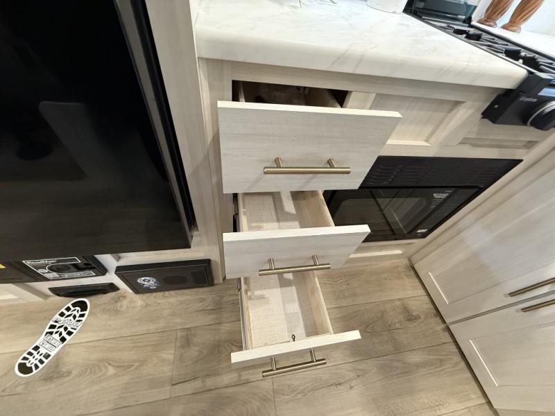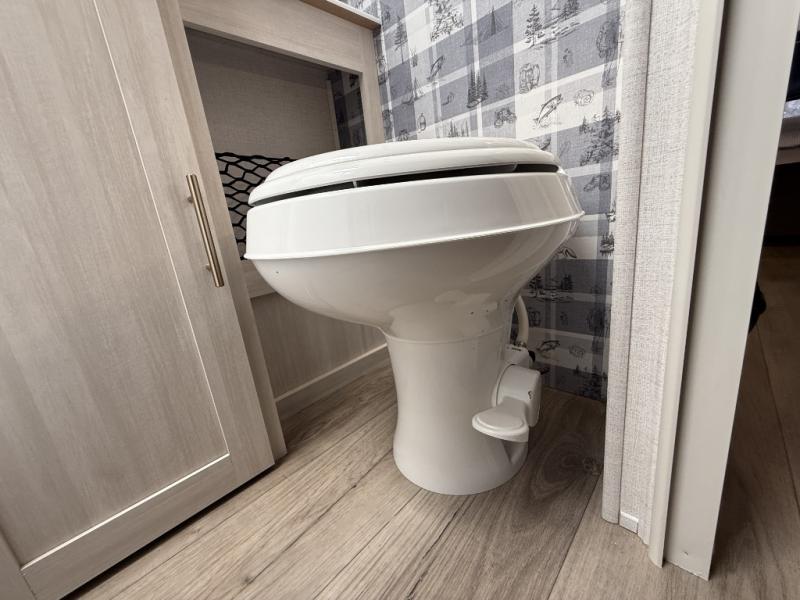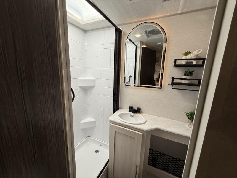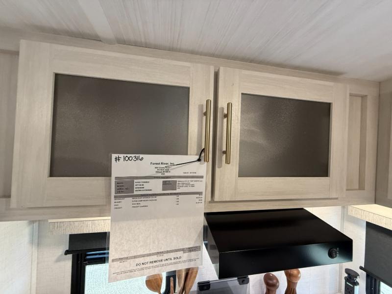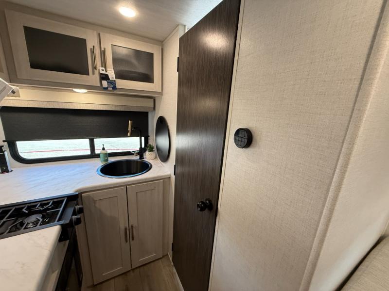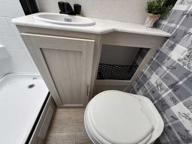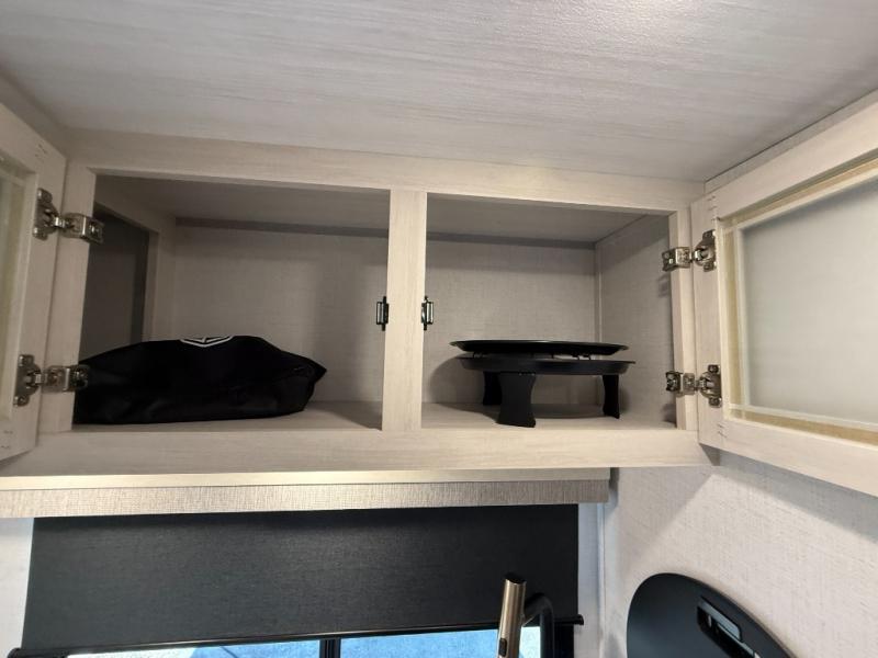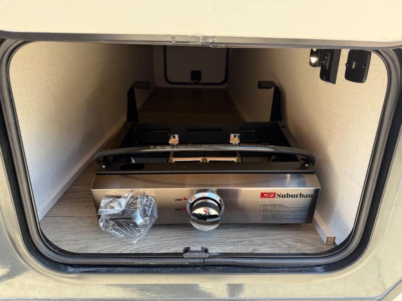 This travel trailer is the perfect couple's trailer with sleeping space for an overnight guest on the booth dinette. You will enjoy the front queen bed for a great night's rest, and there is a full bath on board to clean up each day. A two burner cooktop in the kitchen will let you cook meals inside instead of over a fire outside, and there is ample counter space to set out the meal. After dinner is cleaned up, head outdoors to relax under the 11' power awning!