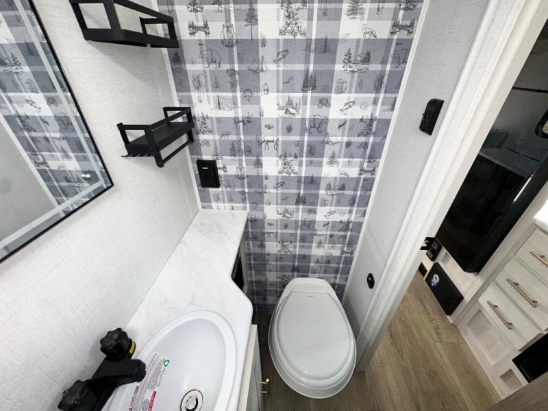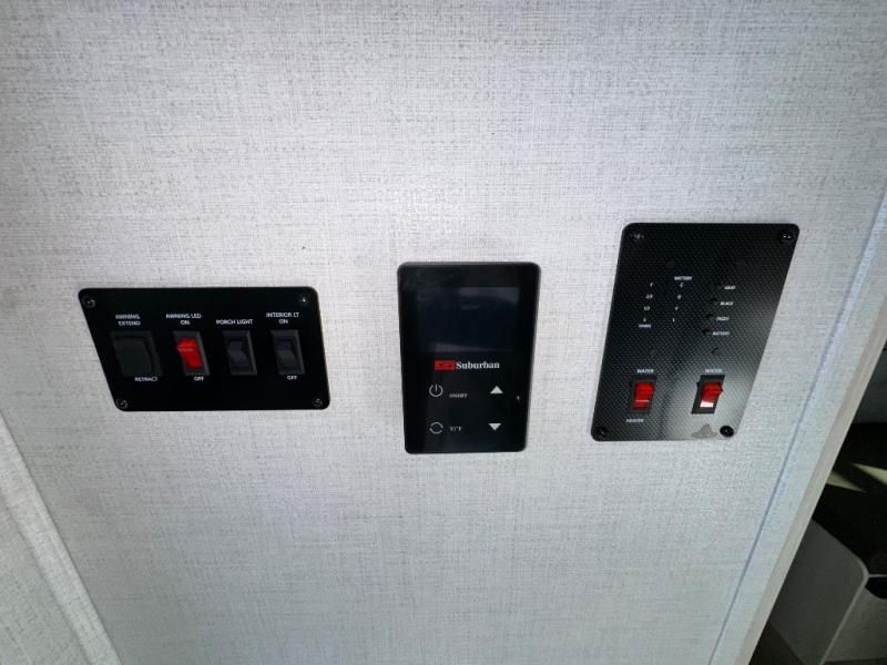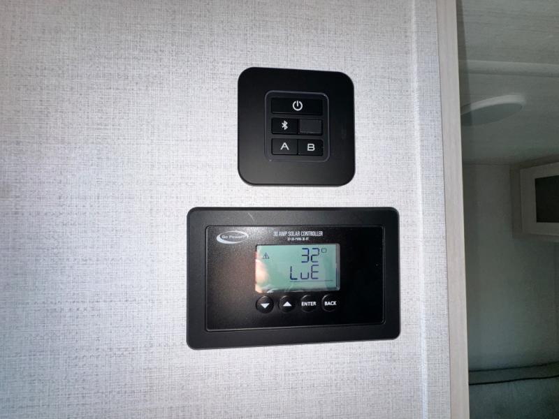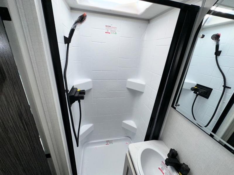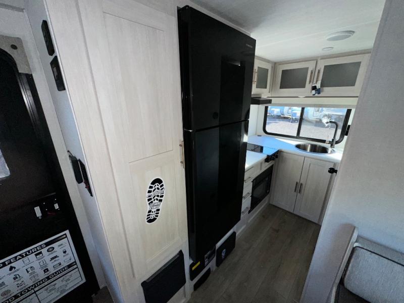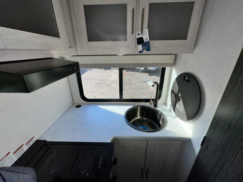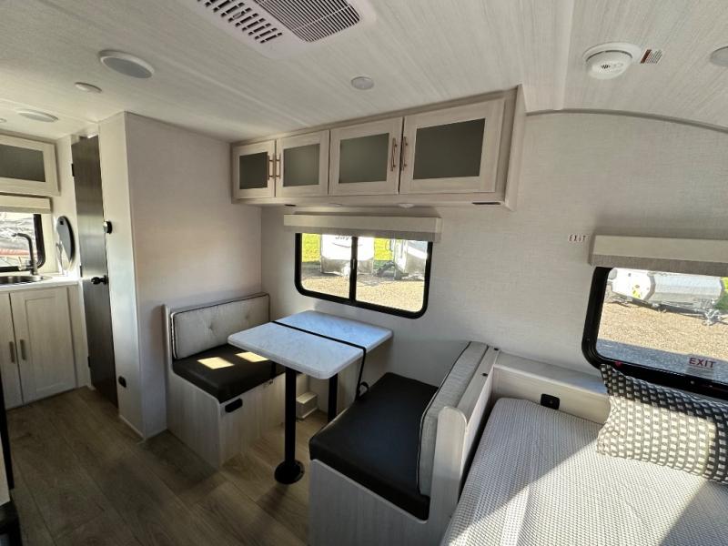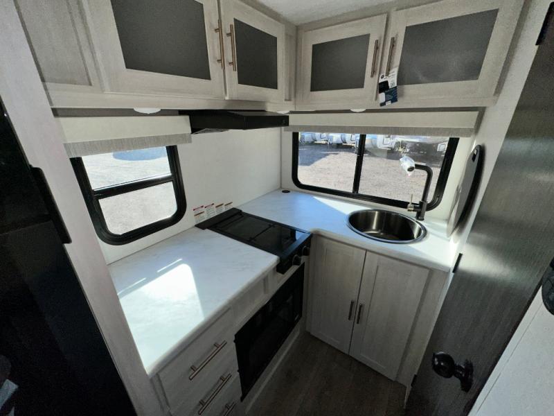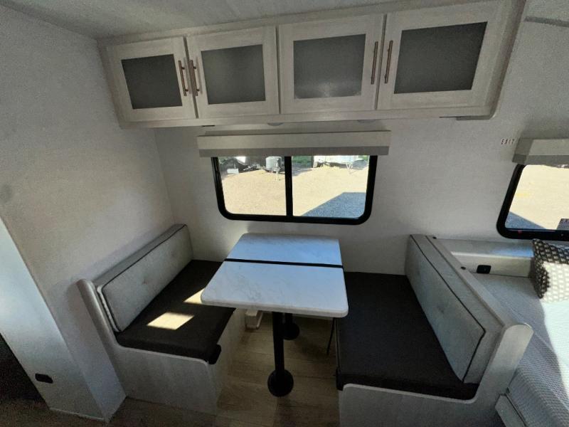 This travel trailer is the perfect couple's trailer with sleeping space for an overnight guest on the booth dinette. You will enjoy the front queen bed for a great night's rest, and there is a full bath on board to clean up each day. A two burner cooktop in the kitchen will let you cook meals inside instead of over a fire outside, and there is ample counter space to set out the meal. After dinner is cleaned up, head outdoors to relax under the 11' power awning!