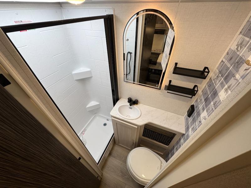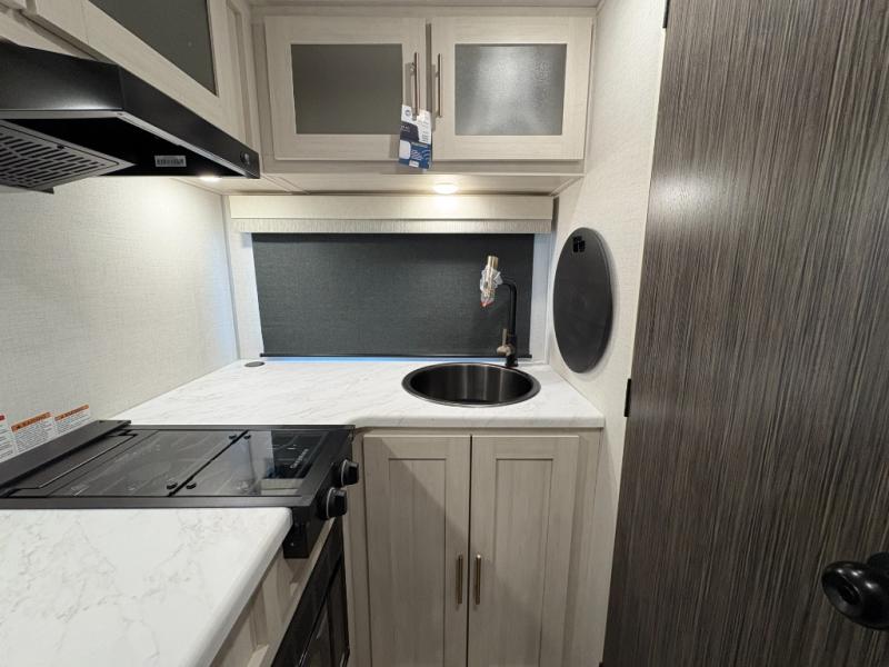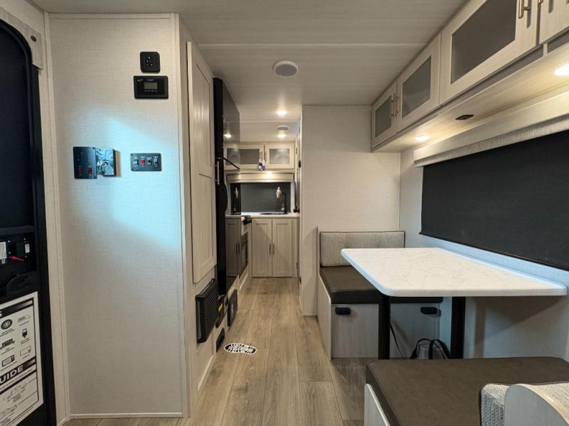 This travel trailer is the perfect couple's trailer with sleeping space for an overnight guest on the booth dinette. You will enjoy the front queen bed for a great night's rest, and there is a full bath on board to clean up each day. A two burner cooktop in the kitchen will let you cook meals inside instead of over a fire outside, and there is ample counter space to set out the meal. After dinner is cleaned up, head outdoors to relax under the 11' power awning!