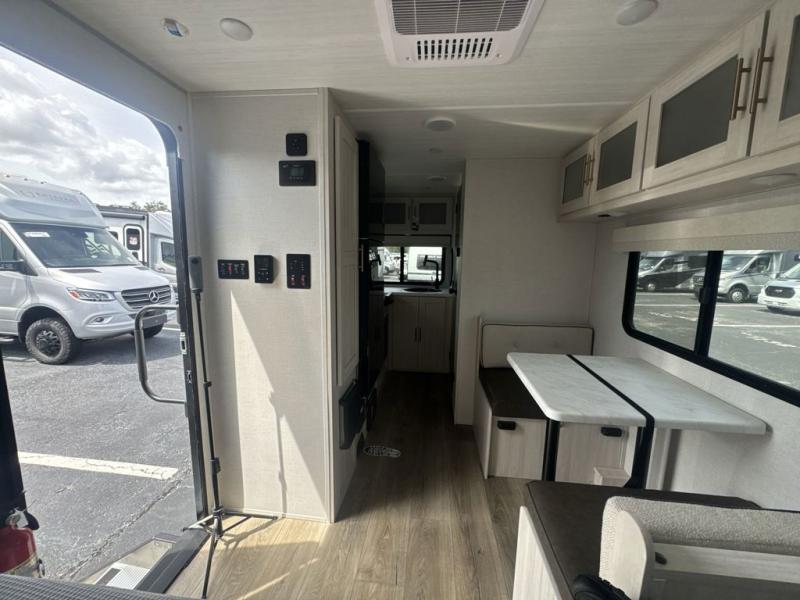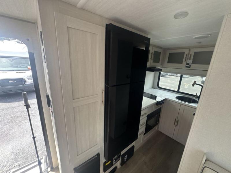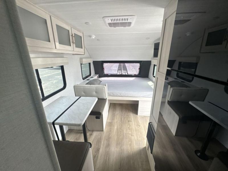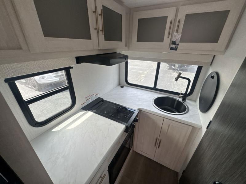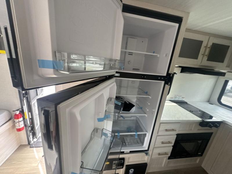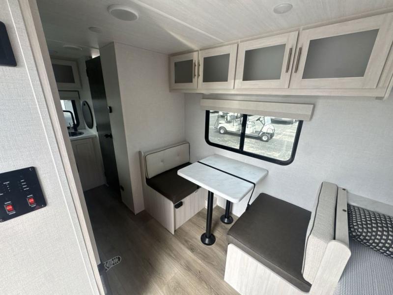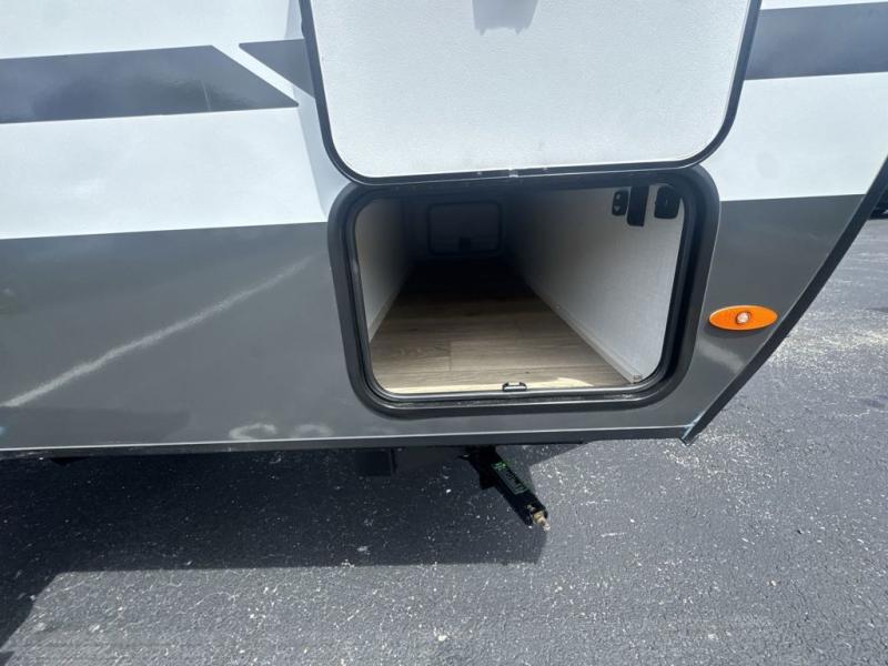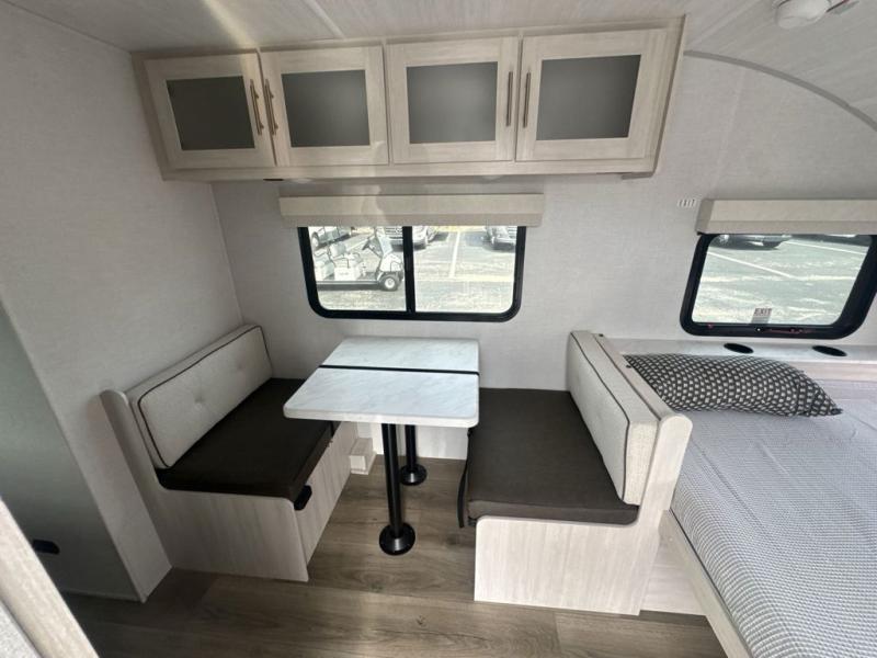 This travel trailer is the perfect couple's trailer with sleeping space for an overnight guest on the booth dinette. You will enjoy the front queen bed for a great night's rest, and there is a full bath on board to clean up each day. A two burner cooktop in the kitchen will let you cook meals inside instead of over a fire outside, and there is ample counter space to set out the meal. After dinner is cleaned up, head outdoors to relax under the 11' power awning!
