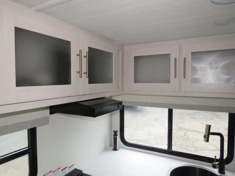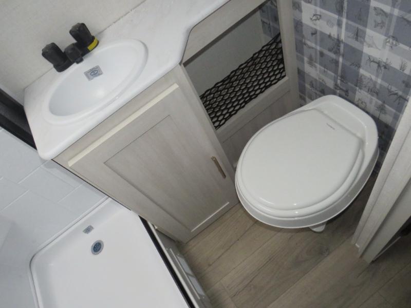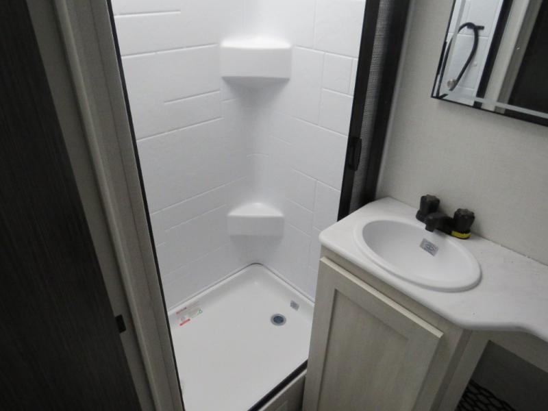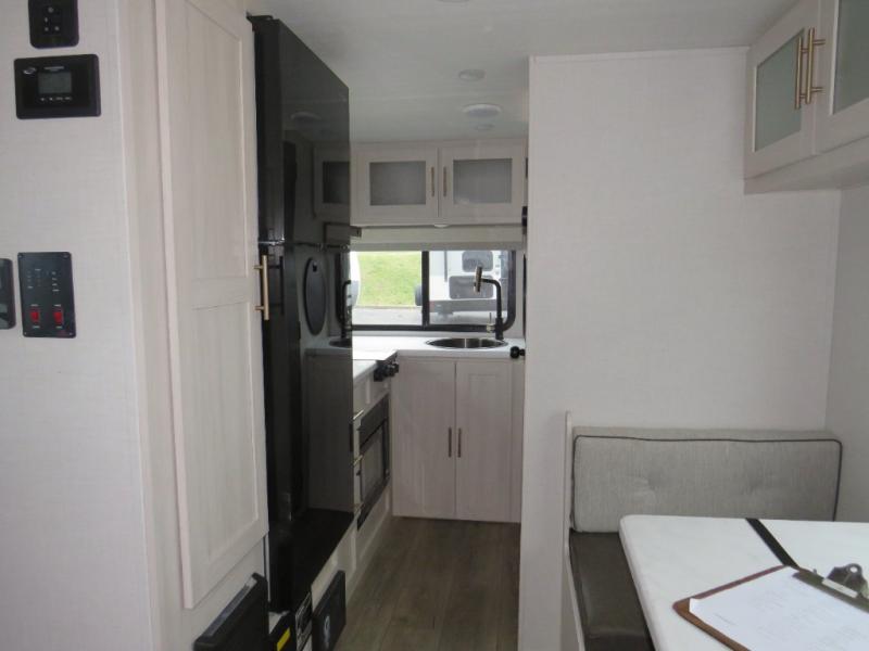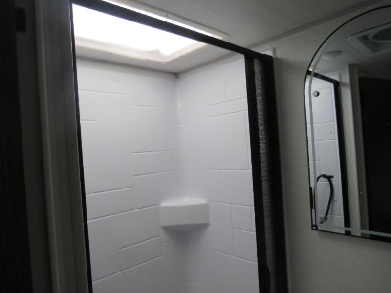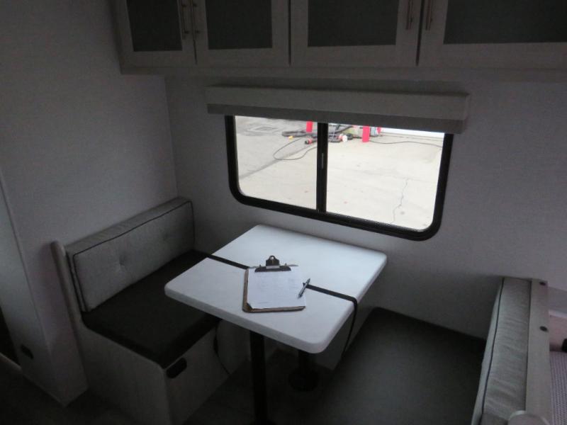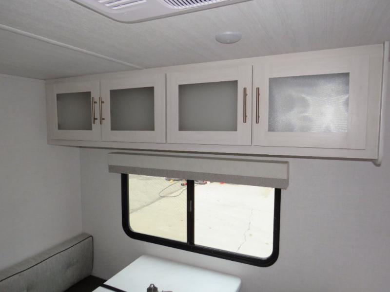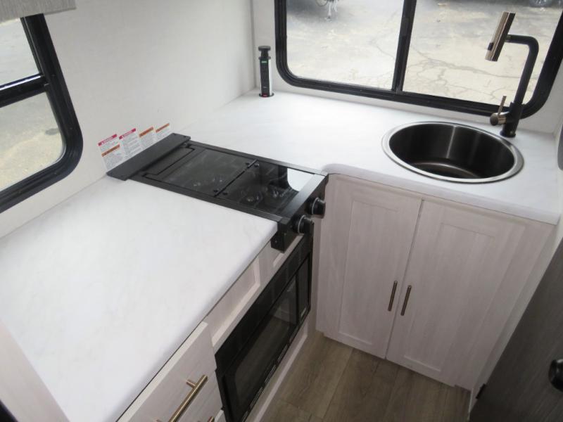 This travel trailer is the perfect couple's trailer with sleeping space for an overnight guest on the booth dinette. You will enjoy the front queen bed for a great night's rest, and there is a full bath on board to clean up each day. A two burner cooktop in the kitchen will let you cook meals inside instead of over a fire outside, and there is ample counter space to set out the meal. After dinner is cleaned up, head outdoors to relax under the 11' power awning!