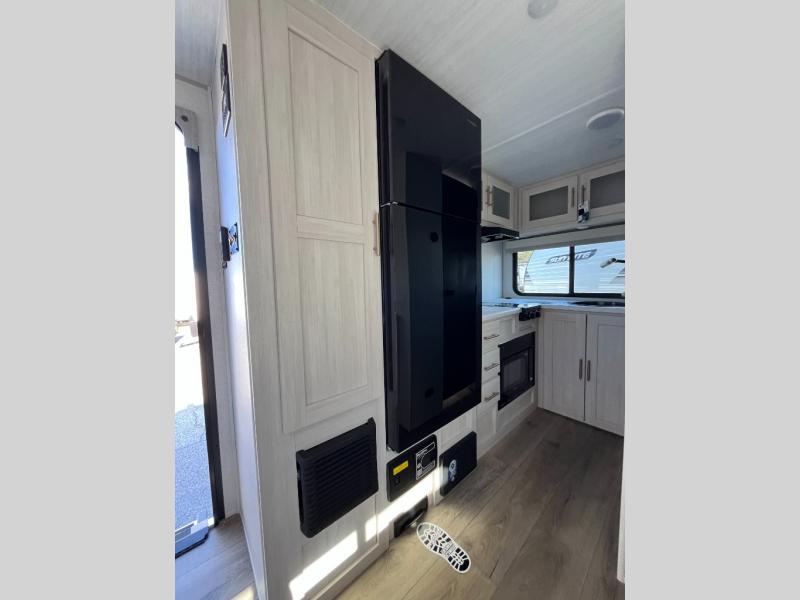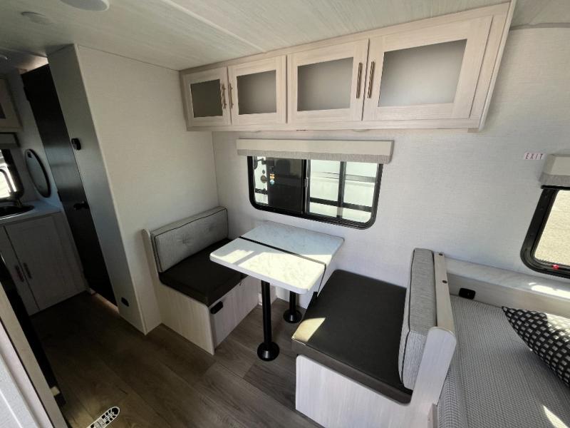 This travel trailer is the perfect couple's trailer with sleeping space for an overnight guest on the booth dinette. You will enjoy the front queen bed for a great night's rest, and there is a full bath on board to clean up each day. A two burner cooktop in the kitchen will let you cook meals inside instead of over a fire outside, and there is ample counter space to set out the meal. After dinner is cleaned up, head outdoors to relax under the 11' power awning!