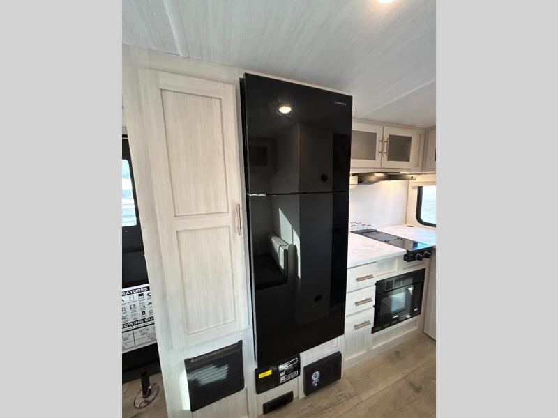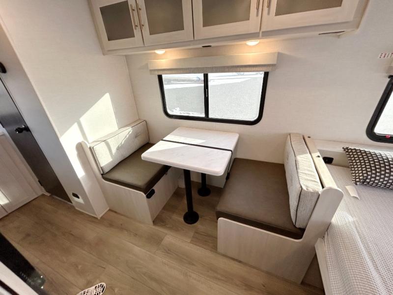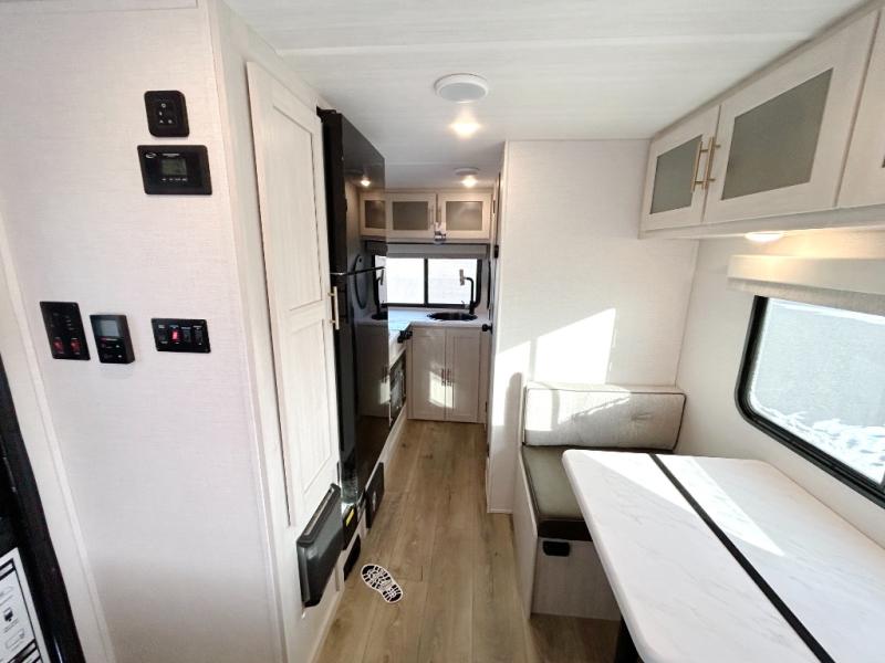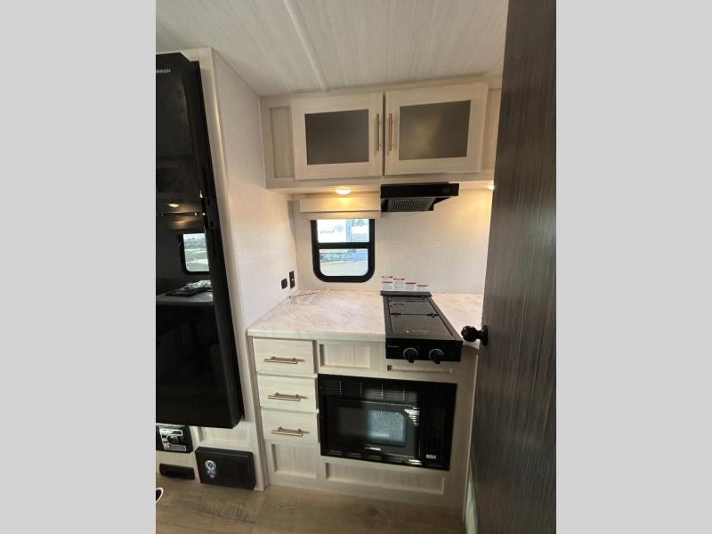 This travel trailer is the perfect couple's trailer with sleeping space for an overnight guest on the booth dinette. You will enjoy the front queen bed for a great night's rest, and there is a full bath on board to clean up each day. A two burner cooktop in the kitchen will let you cook meals inside instead of over a fire outside, and there is ample counter space to set out the meal. After dinner is cleaned up, head outdoors to relax under the 11' power awning!