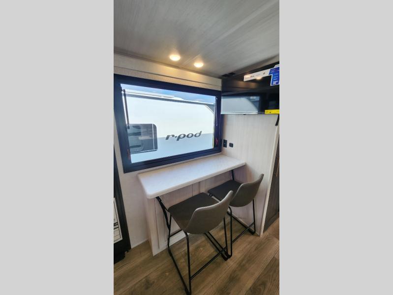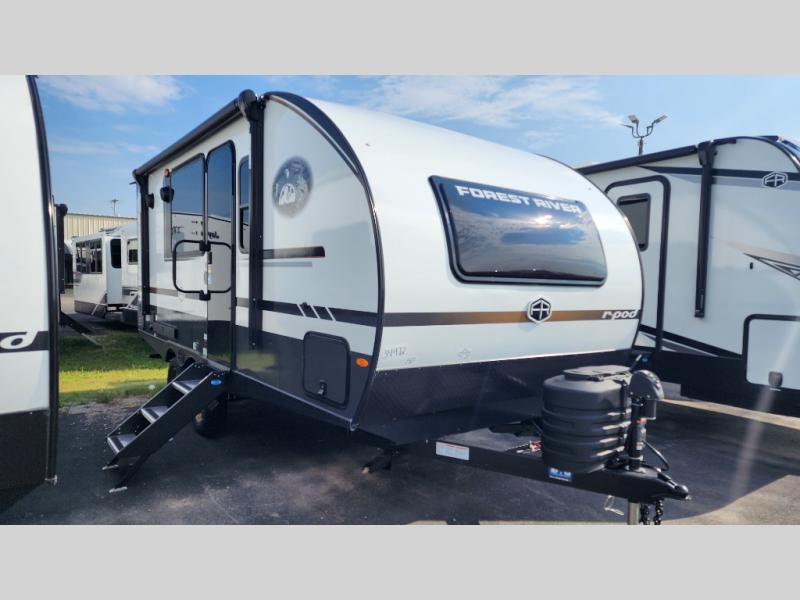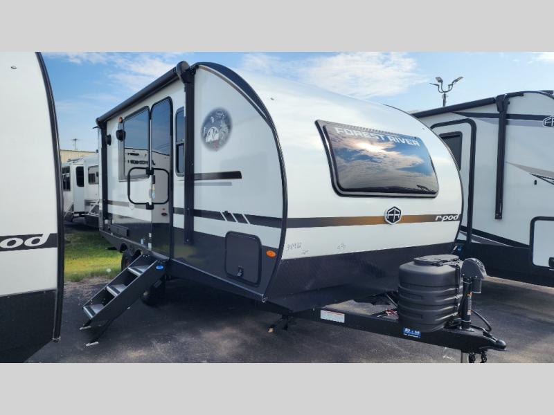 With any R-Pod travel trailer by Forest River, you will enjoy affordable luxury at the lowest tow weight in its class! There is a sealed underbelly with forced heat, a curved dual-pane acrylic front window with a bug screen and night shade, plus a large roof mounted solar panel for off-grid capabilities. The 15K A/C unit will keep you comfortable during the summer camping months, and the tankless water heater will provide endless hot showers after hiking, biking, swimming and more! Each model also includes a black glass friction hinge entrance door, roof ladder prep, exterior motion lighting, plus a hot and cold exterior spray port to wash off sand from the beach. Inside, you'll enjoy seamless Surf-X kitchen countertops, blackout roller shades, and a central vacuum system for hassle-free cleaning!