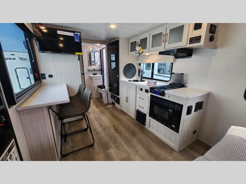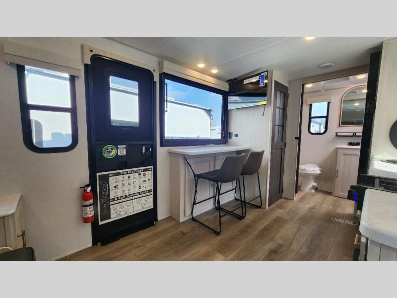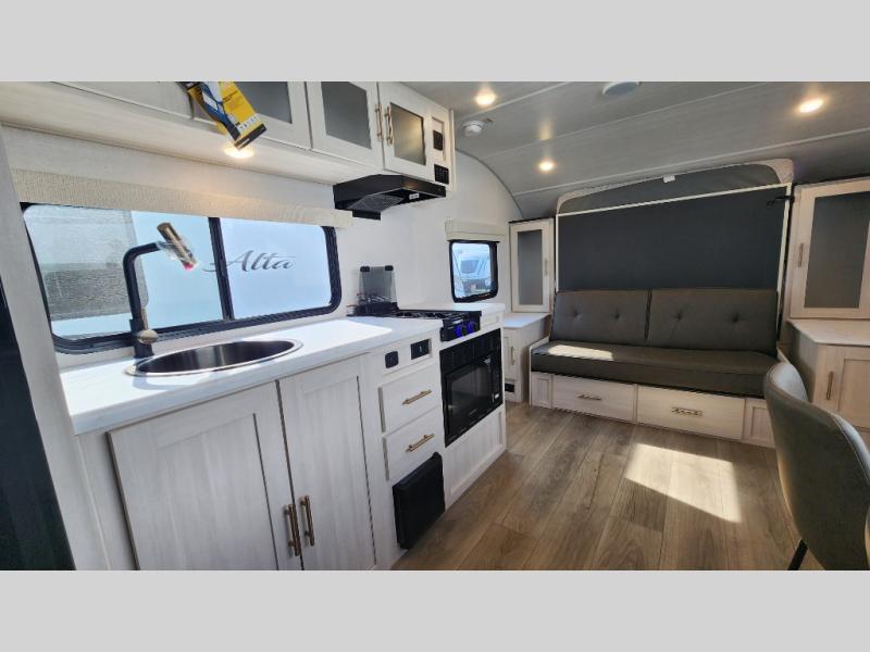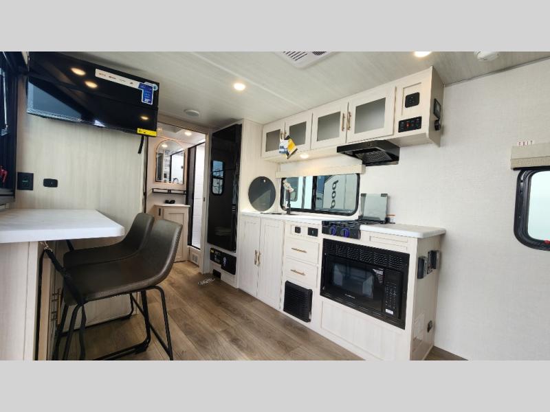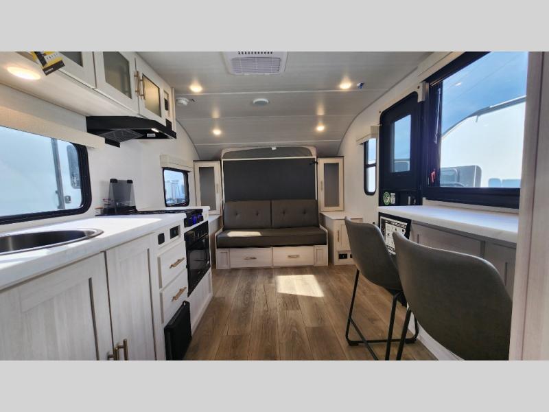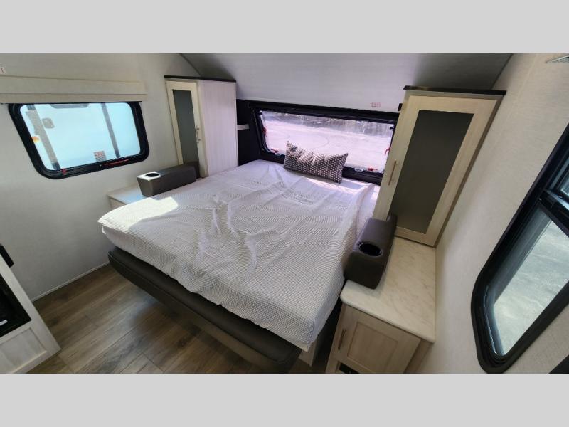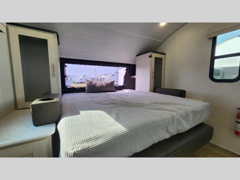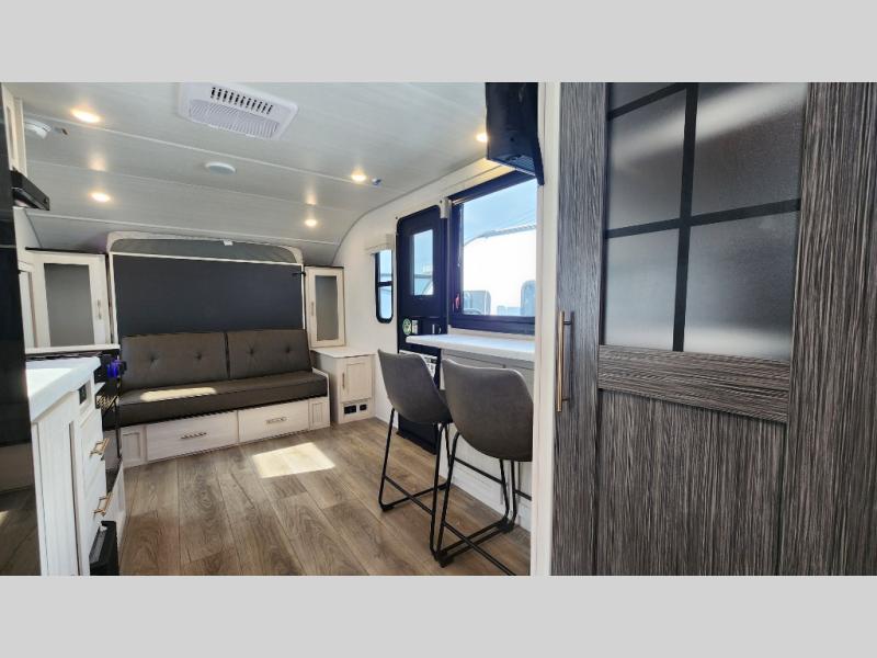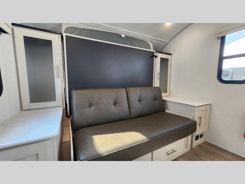 This versatile travel trailer is perfect for two adventure-seeking campers! You will love having a queen-size Murphy bed up front since you can fold it away during the day and relax on the sofa. There are also dual wardrobes to keep your clothes out of the way plus dual end end tables to set your coffee or book on. A full kitchen includes a convection microwave, 12V black glass refrigerator, and a counter with two chairs where you can dine each day. You will also love the flip-up window above the table, along with a 12V TV to keep you entertained, plus a pantry to keep food stocked. Head to the full rear bath that includes a large linen closet, a shower, and a night light for added convenience. The exterior is just as accommodating with its large roof mounted solar panel, rear accessory hitch, slam latch cargo doors, and more!