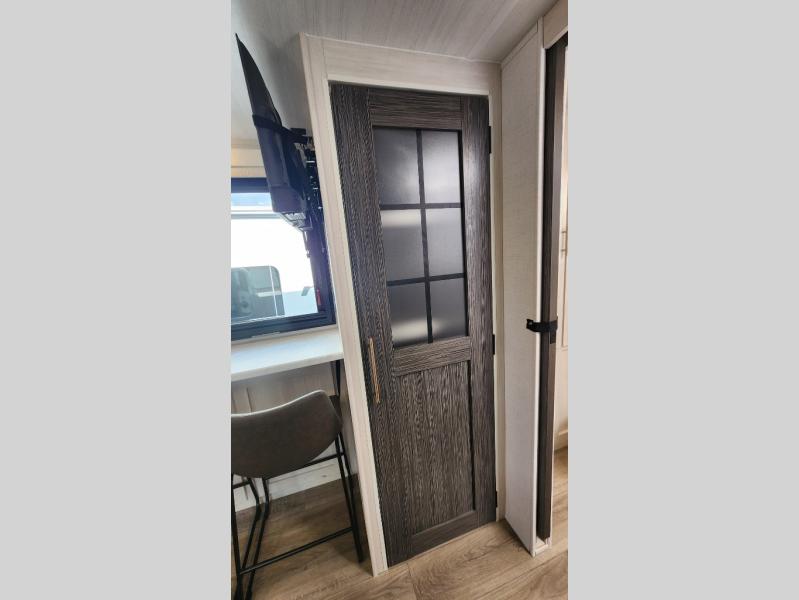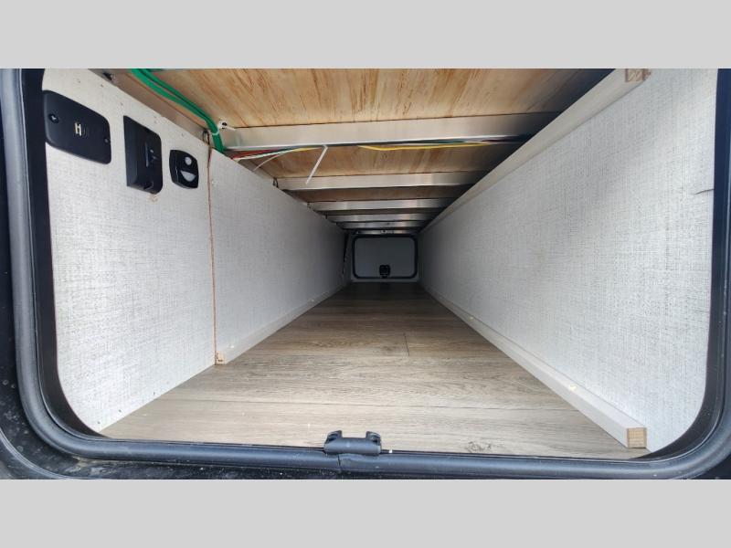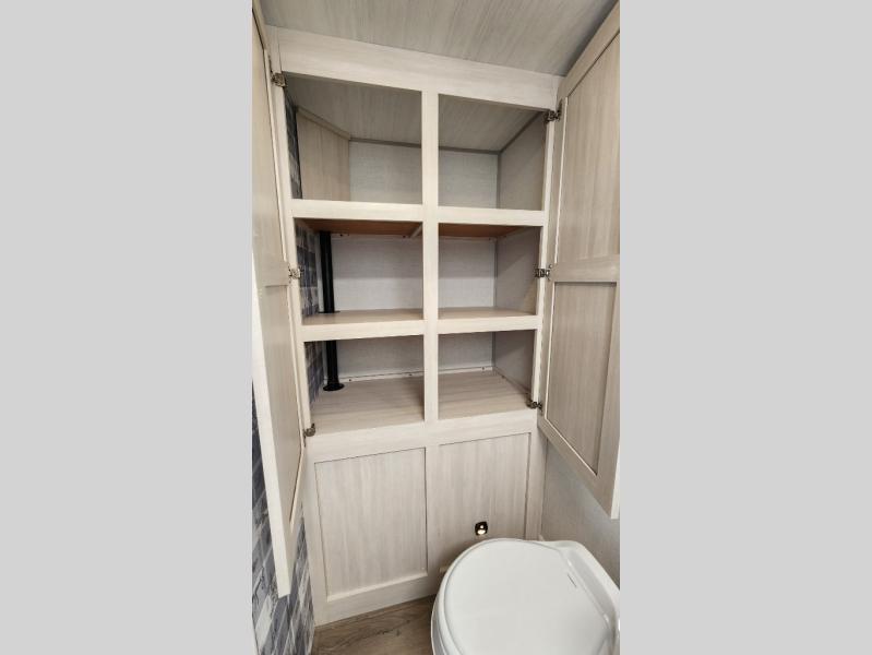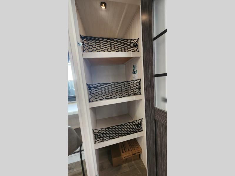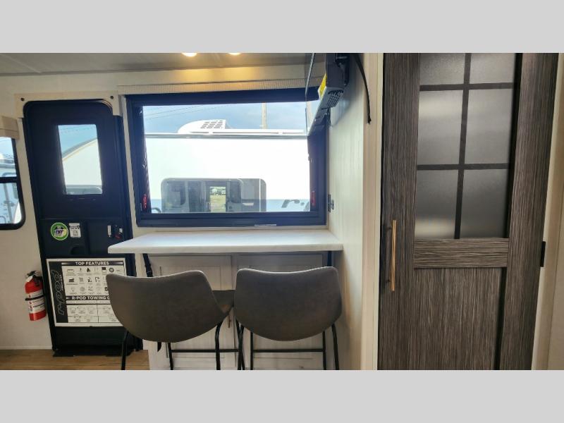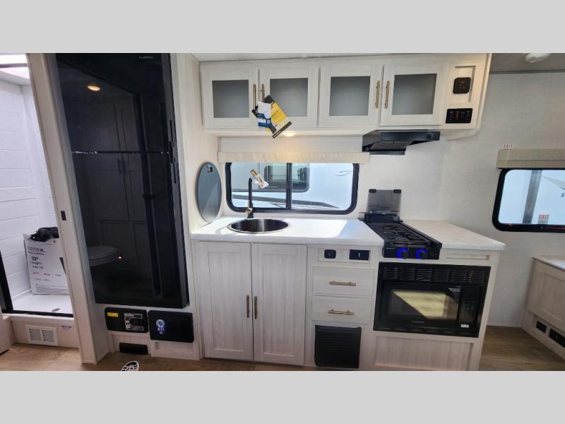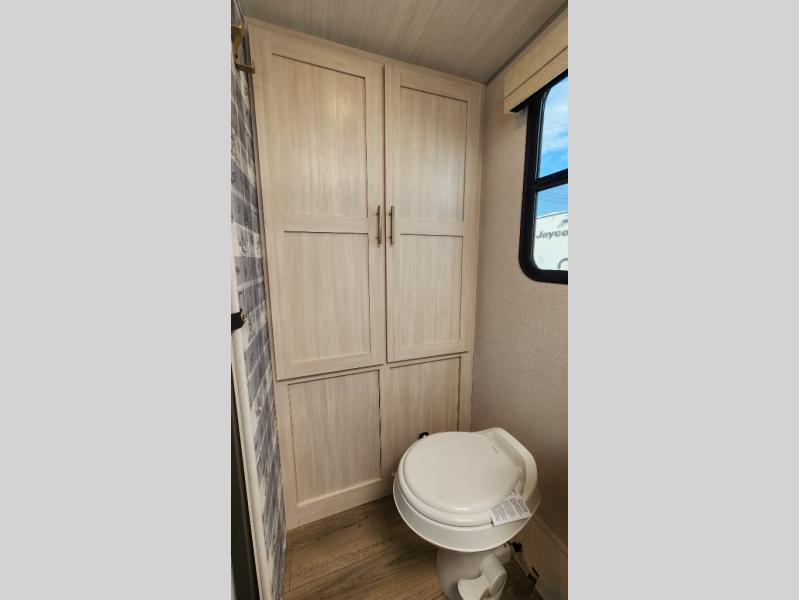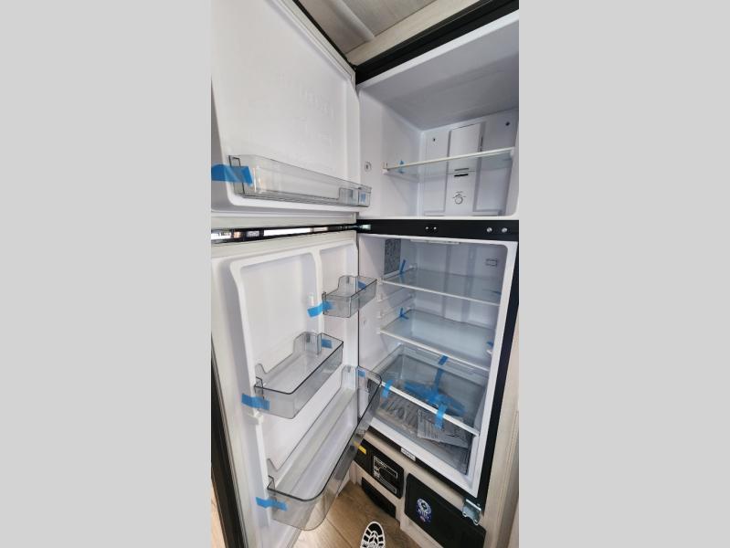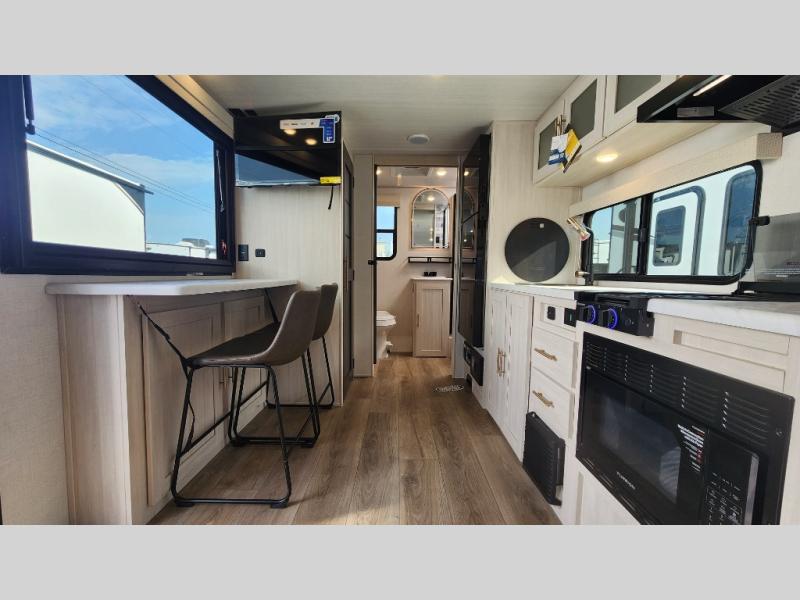 This versatile travel trailer is perfect for two adventure-seeking campers! You will love having a queen-size Murphy bed up front since you can fold it away during the day and relax on the sofa. There are also dual wardrobes to keep your clothes out of the way plus dual end end tables to set your coffee or book on. A full kitchen includes a convection microwave, 12V black glass refrigerator, and a counter with two chairs where you can dine each day. You will also love the flip-up window above the table, along with a 12V TV to keep you entertained, plus a pantry to keep food stocked. Head to the full rear bath that includes a large linen closet, a shower, and a night light for added convenience. The exterior is just as accommodating with its large roof mounted solar panel, rear accessory hitch, slam latch cargo doors, and more!