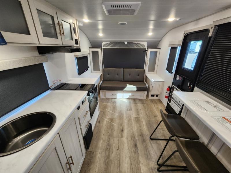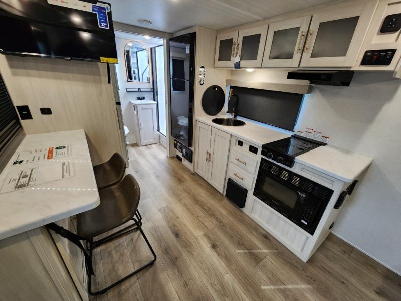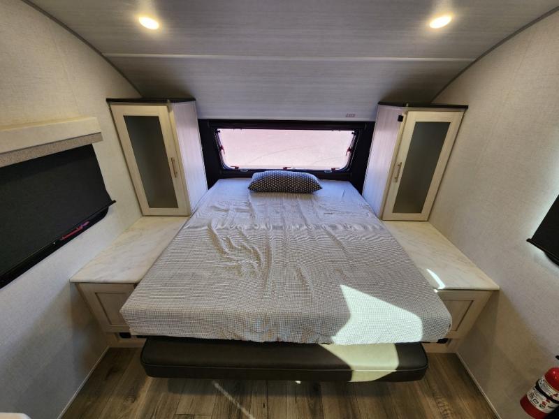 This versatile travel trailer is perfect for two adventure-seeking campers! You will love having a queen-size Murphy bed up front since you can fold it away during the day and relax on the sofa. There are also dual wardrobes to keep your clothes out of the way plus dual end end tables to set your coffee or book on. A full kitchen includes a convection microwave, 12V black glass refrigerator, and a counter with two chairs where you can dine each day. You will also love the flip-up window above the table, along with a 12V TV to keep you entertained, plus a pantry to keep food stocked. Head to the full rear bath that includes a large linen closet, a shower, and a night light for added convenience. The exterior is just as accommodating with its large roof mounted solar panel, rear accessory hitch, slam latch cargo doors, and more!