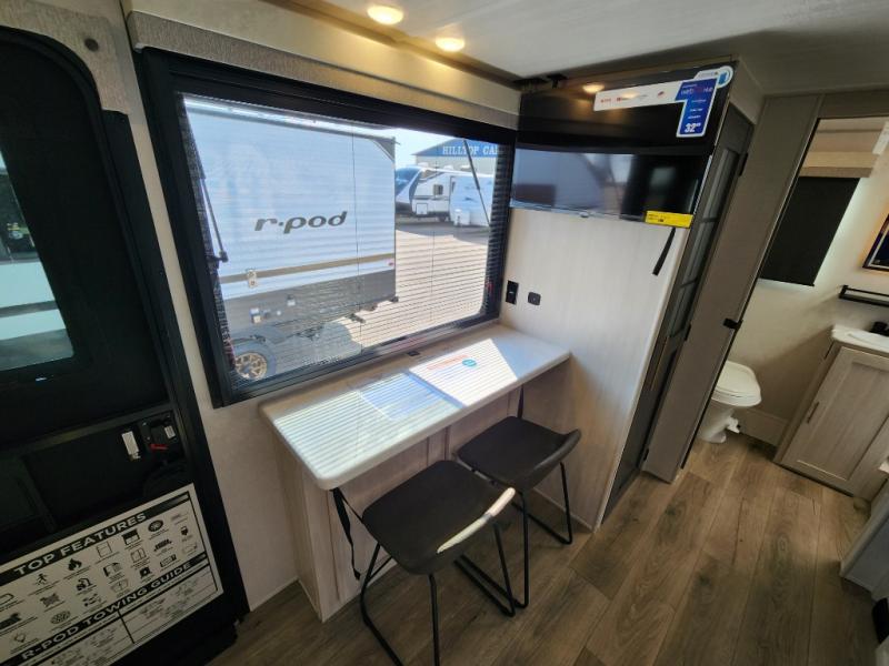 With any R-Pod travel trailer by Forest River, you will enjoy affordable luxury at the lowest tow weight in its class! There is a sealed underbelly with forced heat, a curved dual-pane acrylic front window with a bug screen and night shade, plus a large roof mounted solar panel for off-grid capabilities. The 15K A/C unit will keep you comfortable during the summer camping months, and the tankless water heater will provide endless hot showers after hiking, biking, swimming and more! Each model also includes a black glass friction hinge entrance door, roof ladder prep, exterior motion lighting, plus a hot and cold exterior spray port to wash off sand from the beach. Inside, you'll enjoy seamless Surf-X kitchen countertops, blackout roller shades, and a central vacuum system for hassle-free cleaning!