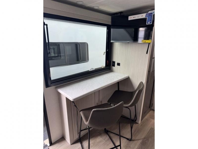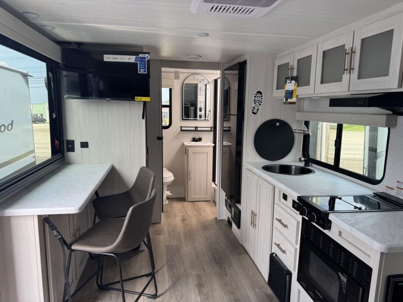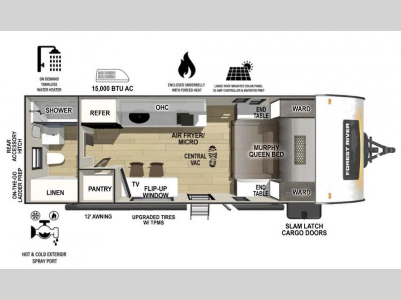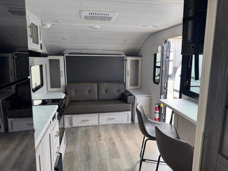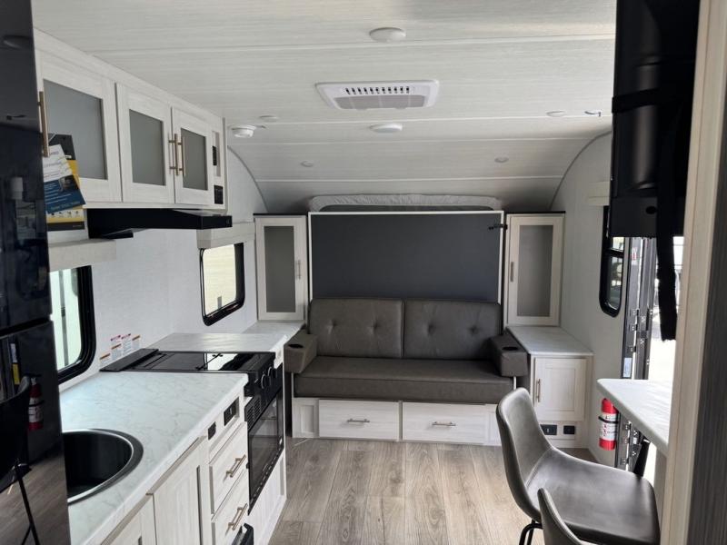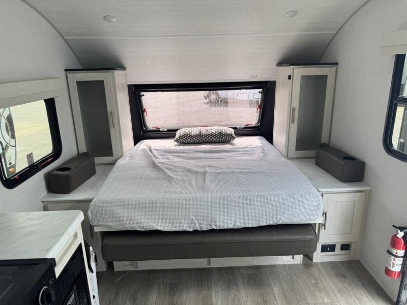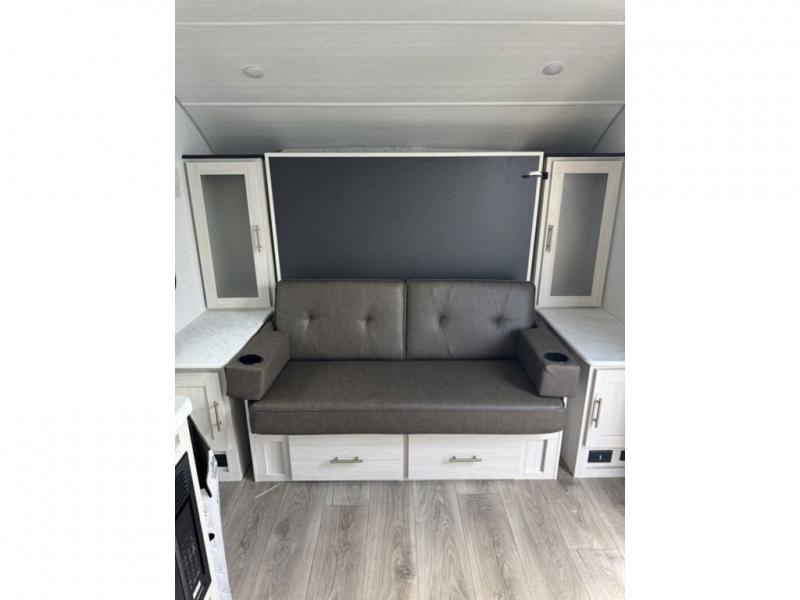 This versatile travel trailer is perfect for two adventure-seeking campers! You will love having a queen-size Murphy bed up front since you can fold it away during the day and relax on the sofa. There are also dual wardrobes to keep your clothes out of the way plus dual end end tables to set your coffee or book on. A full kitchen includes a convection microwave, 12V black glass refrigerator, and a counter with two chairs where you can dine each day. You will also love the flip-up window above the table, along with a 12V TV to keep you entertained, plus a pantry to keep food stocked. Head to the full rear bath that includes a large linen closet, a shower, and a night light for added convenience. The exterior is just as accommodating with its large roof mounted solar panel, rear accessory hitch, slam latch cargo doors, and more!