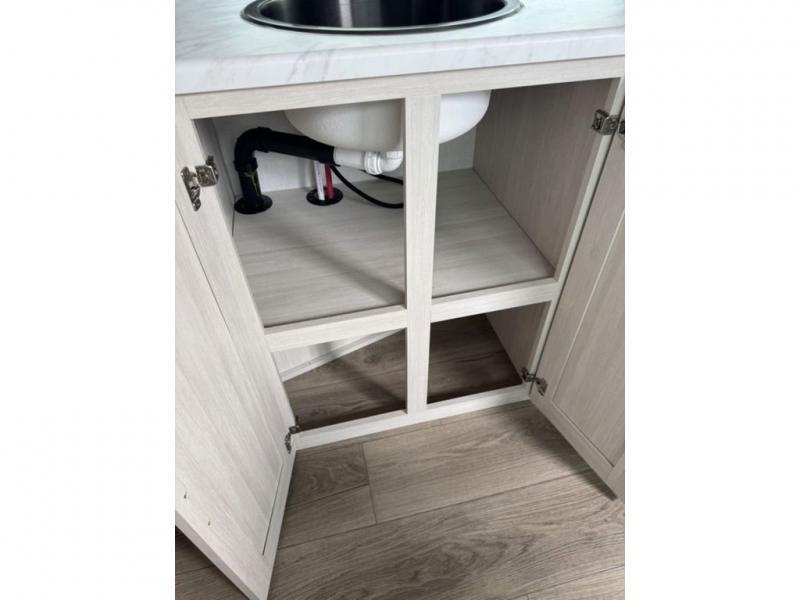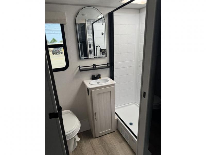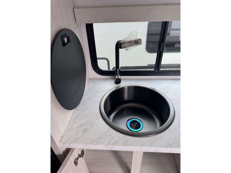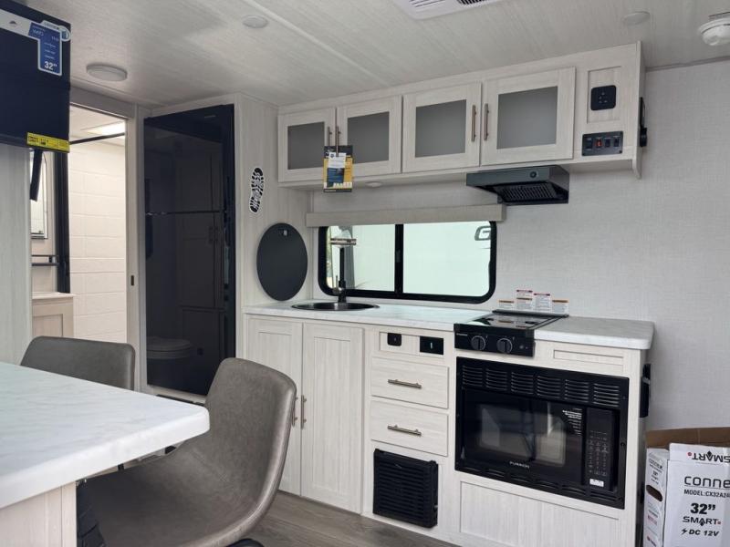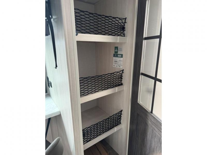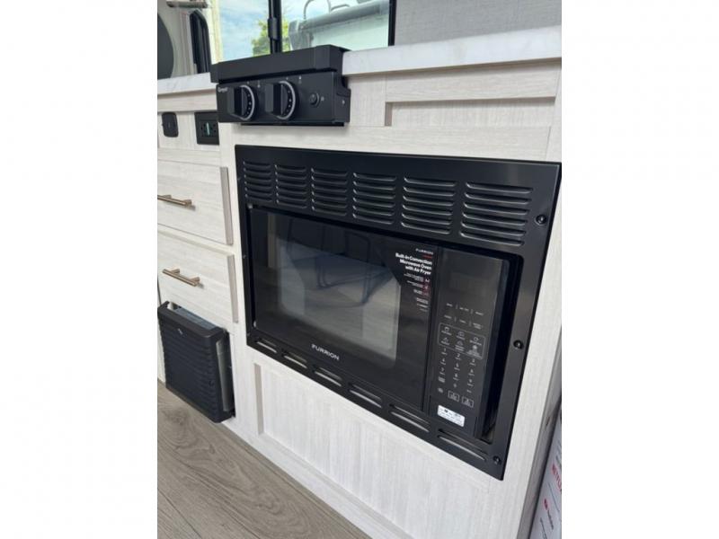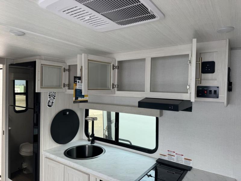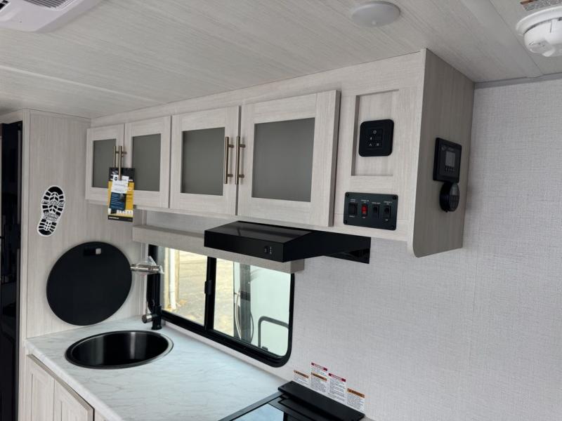 This versatile travel trailer is perfect for two adventure-seeking campers! You will love having a queen-size Murphy bed up front since you can fold it away during the day and relax on the sofa. There are also dual wardrobes to keep your clothes out of the way plus dual end end tables to set your coffee or book on. A full kitchen includes a convection microwave, 12V black glass refrigerator, and a counter with two chairs where you can dine each day. You will also love the flip-up window above the table, along with a 12V TV to keep you entertained, plus a pantry to keep food stocked. Head to the full rear bath that includes a large linen closet, a shower, and a night light for added convenience. The exterior is just as accommodating with its large roof mounted solar panel, rear accessory hitch, slam latch cargo doors, and more!
