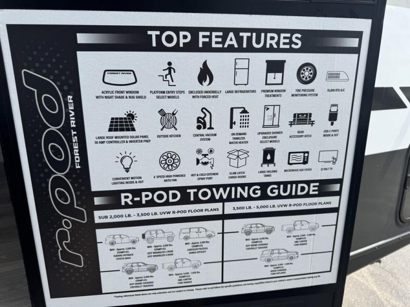 With any R-Pod travel trailer by Forest River, you will enjoy affordable luxury at the lowest tow weight in its class! There is a sealed underbelly with forced heat, a curved dual-pane acrylic front window with a bug screen and night shade, plus a large roof mounted solar panel for off-grid capabilities. The 15K A/C unit will keep you comfortable during the summer camping months, and the tankless water heater will provide endless hot showers after hiking, biking, swimming and more! Each model also includes a black glass friction hinge entrance door, roof ladder prep, exterior motion lighting, plus a hot and cold exterior spray port to wash off sand from the beach. Inside, you'll enjoy seamless Surf-X kitchen countertops, blackout roller shades, and a central vacuum system for hassle-free cleaning!