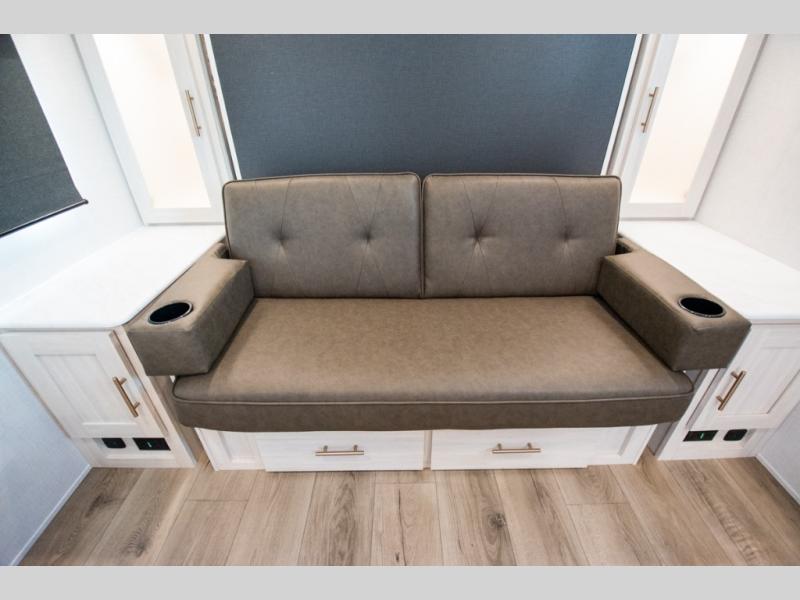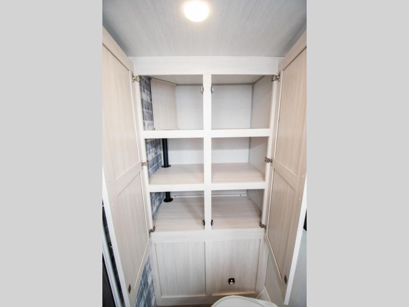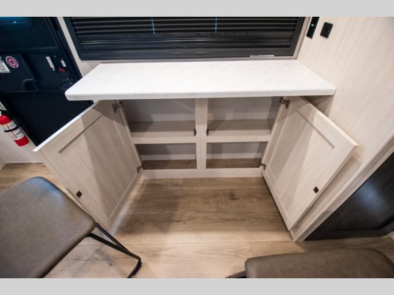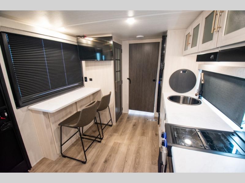 This versatile travel trailer is perfect for two adventure-seeking campers! You will love having a queen-size Murphy bed up front since you can fold it away during the day and relax on the sofa. There are also dual wardrobes to keep your clothes out of the way plus dual end end tables to set your coffee or book on. A full kitchen includes a convection microwave, 12V black glass refrigerator, and a counter with two chairs where you can dine each day. You will also love the flip-up window above the table, along with a 12V TV to keep you entertained, plus a pantry to keep food stocked. Head to the full rear bath that includes a large linen closet, a shower, and a night light for added convenience. The exterior is just as accommodating with its large roof mounted solar panel, rear accessory hitch, slam latch cargo doors, and more!