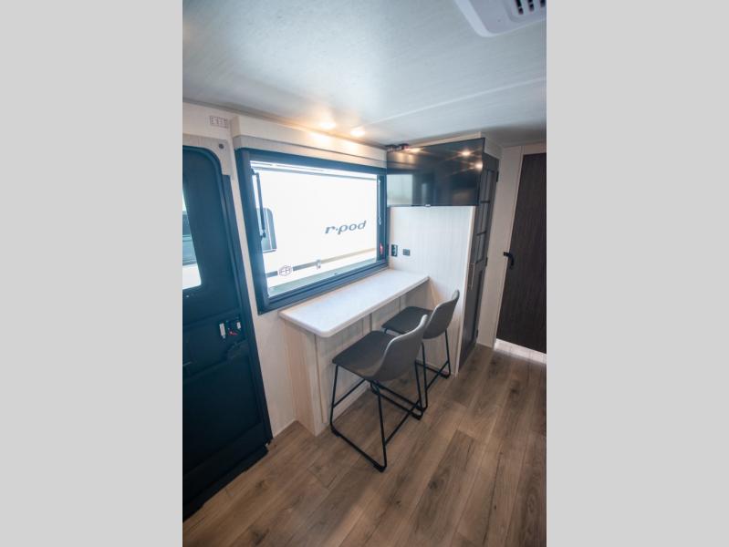 With any R-Pod travel trailer by Forest River, you will enjoy affordable luxury at the lowest tow weight in its class! There is a sealed underbelly with forced heat, a curved dual-pane acrylic front window with a bug screen and night shade, plus a large roof mounted solar panel for off-grid capabilities. The 15K A/C unit will keep you comfortable during the summer camping months, and the tankless water heater will provide endless hot showers after hiking, biking, swimming and more! Each model also includes a black glass friction hinge entrance door, roof ladder prep, exterior motion lighting, plus a hot and cold exterior spray port to wash off sand from the beach. Inside, you'll enjoy seamless Surf-X kitchen countertops, blackout roller shades, and a central vacuum system for hassle-free cleaning!