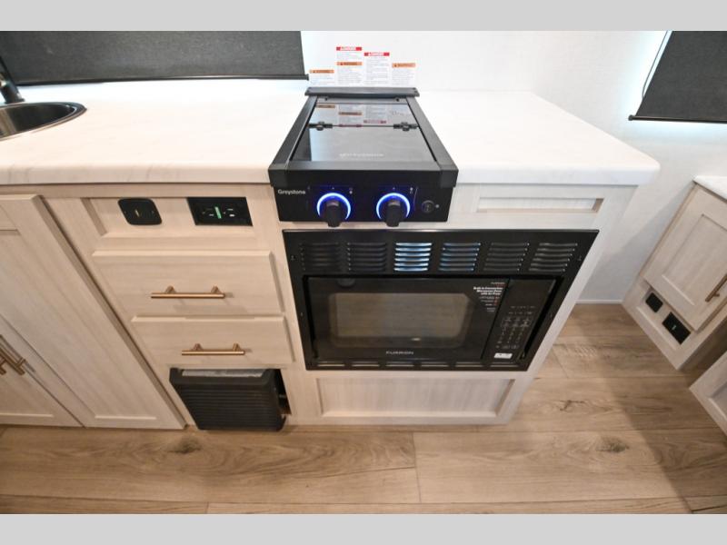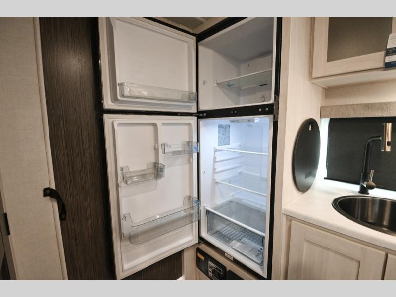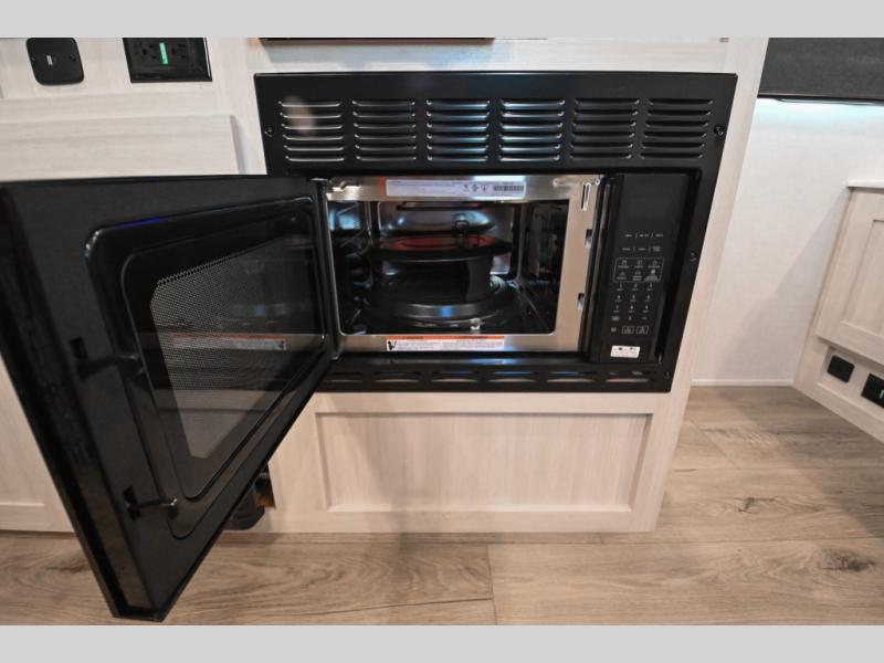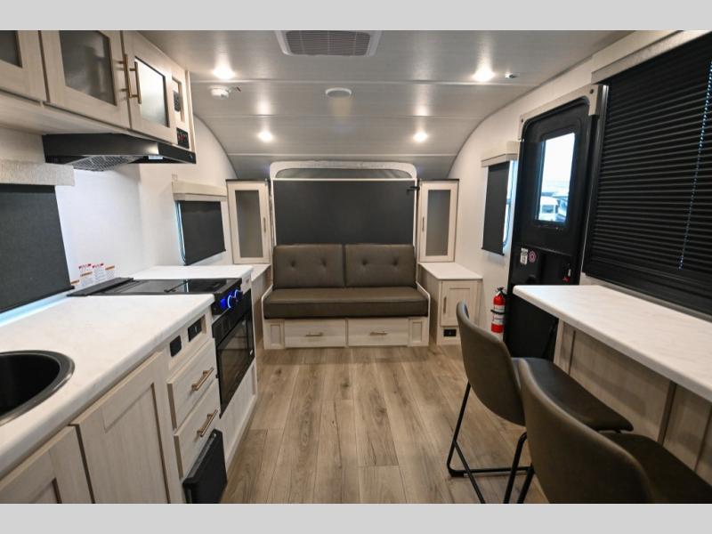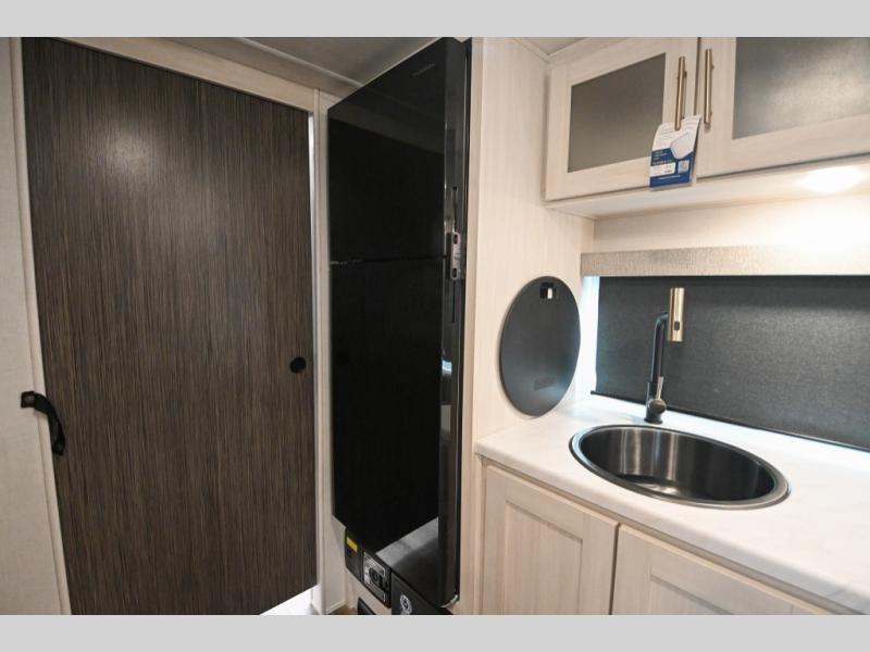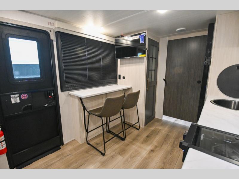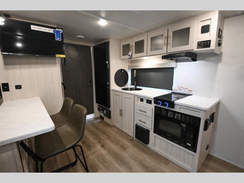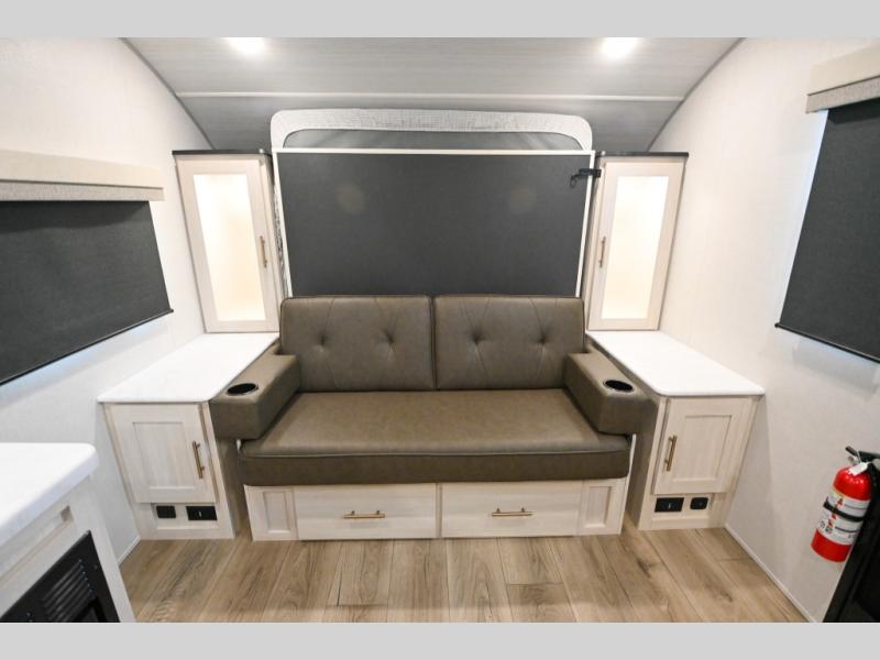 This versatile travel trailer is perfect for two adventure-seeking campers! You will love having a queen-size Murphy bed up front since you can fold it away during the day and relax on the sofa. There are also dual wardrobes to keep your clothes out of the way plus dual end end tables to set your coffee or book on. A full kitchen includes a convection microwave, 12V black glass refrigerator, and a counter with two chairs where you can dine each day. You will also love the flip-up window above the table, along with a 12V TV to keep you entertained, plus a pantry to keep food stocked. Head to the full rear bath that includes a large linen closet, a shower, and a night light for added convenience. The exterior is just as accommodating with its large roof mounted solar panel, rear accessory hitch, slam latch cargo doors, and more!