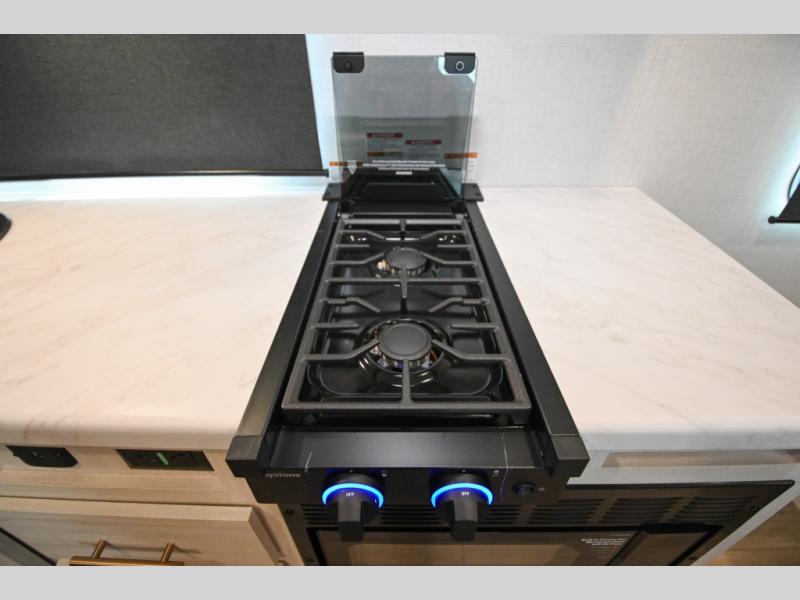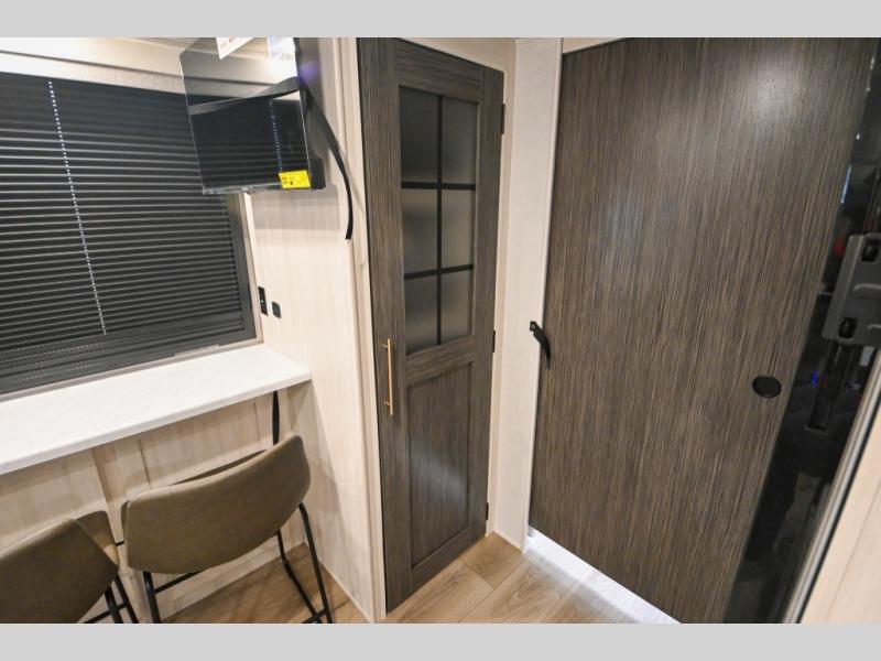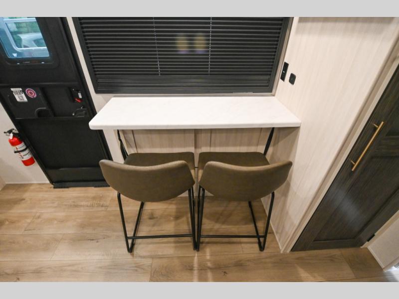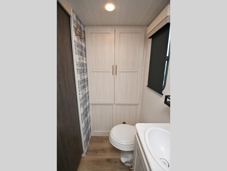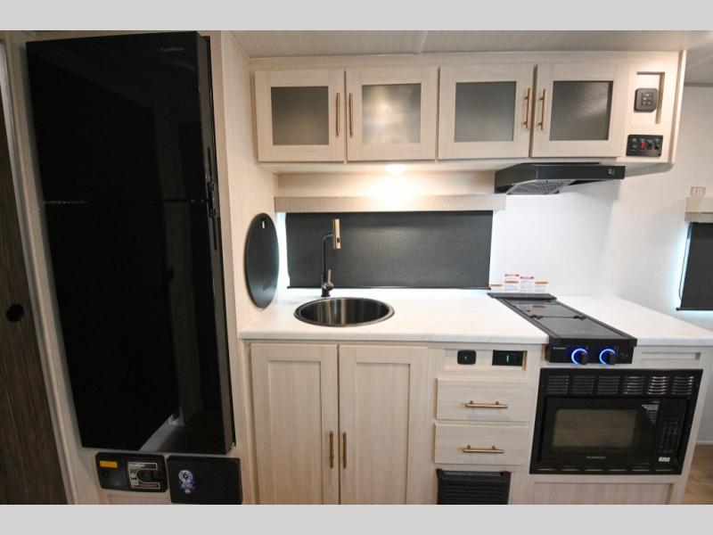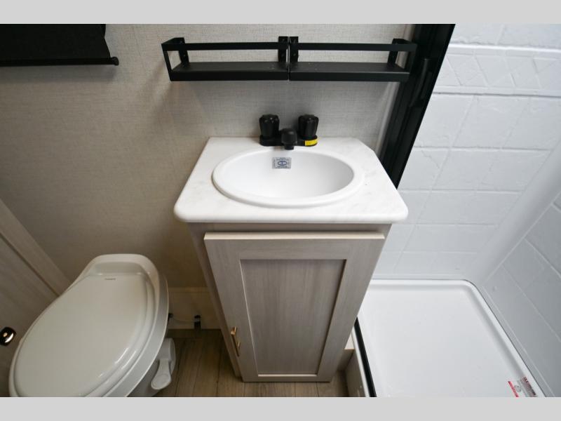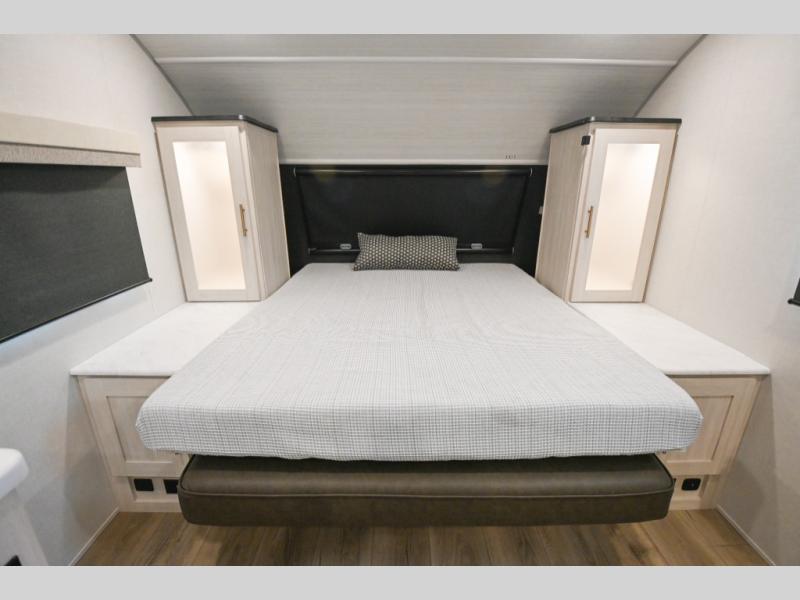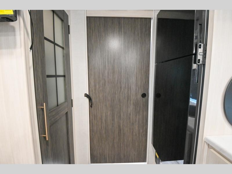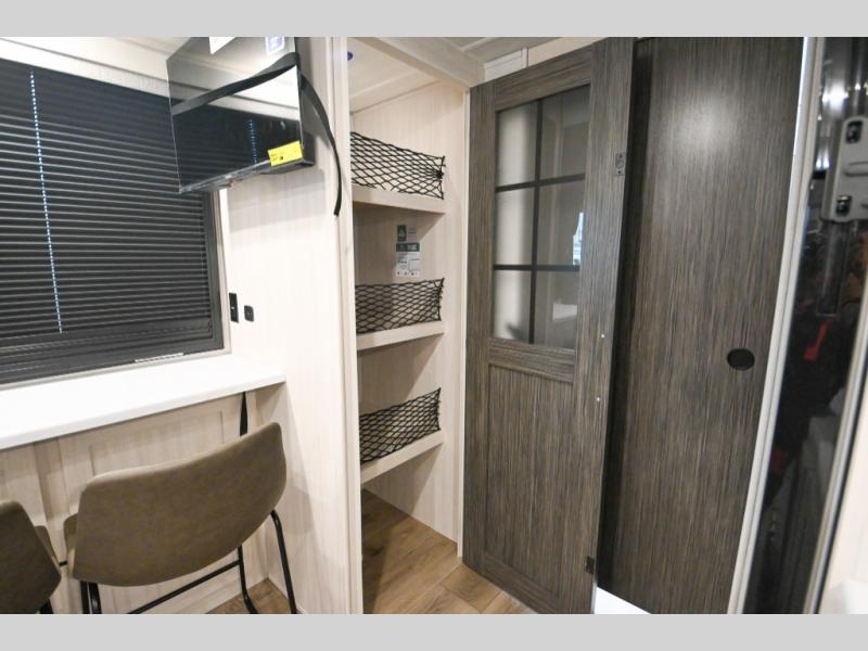 This versatile travel trailer is perfect for two adventure-seeking campers! You will love having a queen-size Murphy bed up front since you can fold it away during the day and relax on the sofa. There are also dual wardrobes to keep your clothes out of the way plus dual end end tables to set your coffee or book on. A full kitchen includes a convection microwave, 12V black glass refrigerator, and a counter with two chairs where you can dine each day. You will also love the flip-up window above the table, along with a 12V TV to keep you entertained, plus a pantry to keep food stocked. Head to the full rear bath that includes a large linen closet, a shower, and a night light for added convenience. The exterior is just as accommodating with its large roof mounted solar panel, rear accessory hitch, slam latch cargo doors, and more!