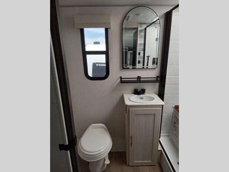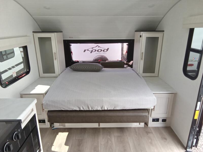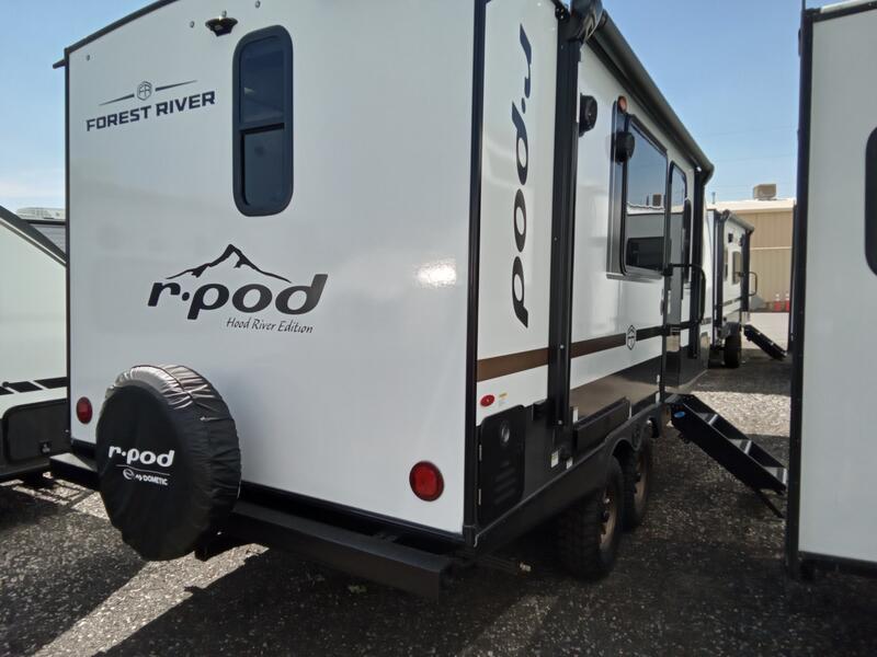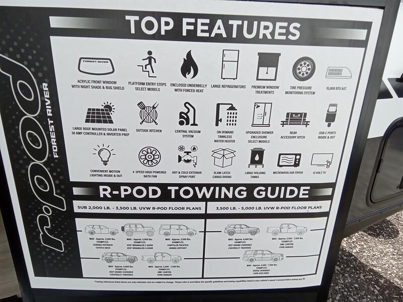 With any R-Pod travel trailer by Forest River, you will enjoy affordable luxury at the lowest tow weight in its class! There is a sealed underbelly with forced heat, a curved dual-pane acrylic front window with a bug screen and night shade, plus a large roof mounted solar panel for off-grid capabilities. The 15K A/C unit will keep you comfortable during the summer camping months, and the tankless water heater will provide endless hot showers after hiking, biking, swimming and more! Each model also includes a black glass friction hinge entrance door, roof ladder prep, exterior motion lighting, plus a hot and cold exterior spray port to wash off sand from the beach. Inside, you'll enjoy seamless Surf-X kitchen countertops, blackout roller shades, and a central vacuum system for hassle-free cleaning!