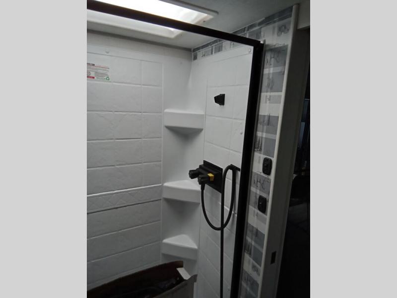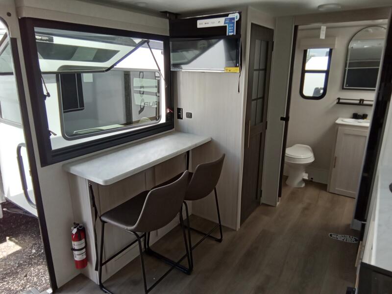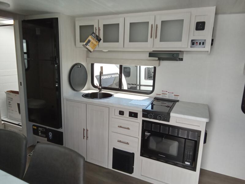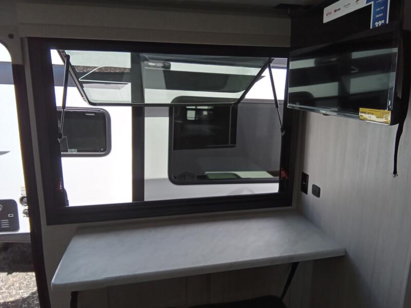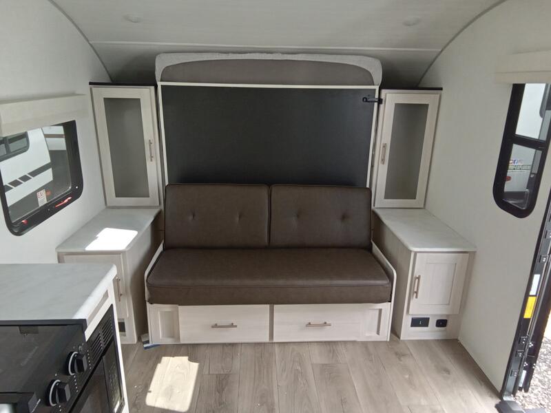 This versatile travel trailer is perfect for two adventure-seeking campers! You will love having a queen-size Murphy bed up front since you can fold it away during the day and relax on the sofa. There are also dual wardrobes to keep your clothes out of the way plus dual end end tables to set your coffee or book on. A full kitchen includes a convection microwave, 12V black glass refrigerator, and a counter with two chairs where you can dine each day. You will also love the flip-up window above the table, along with a 12V TV to keep you entertained, plus a pantry to keep food stocked. Head to the full rear bath that includes a large linen closet, a shower, and a night light for added convenience. The exterior is just as accommodating with its large roof mounted solar panel, rear accessory hitch, slam latch cargo doors, and more!
