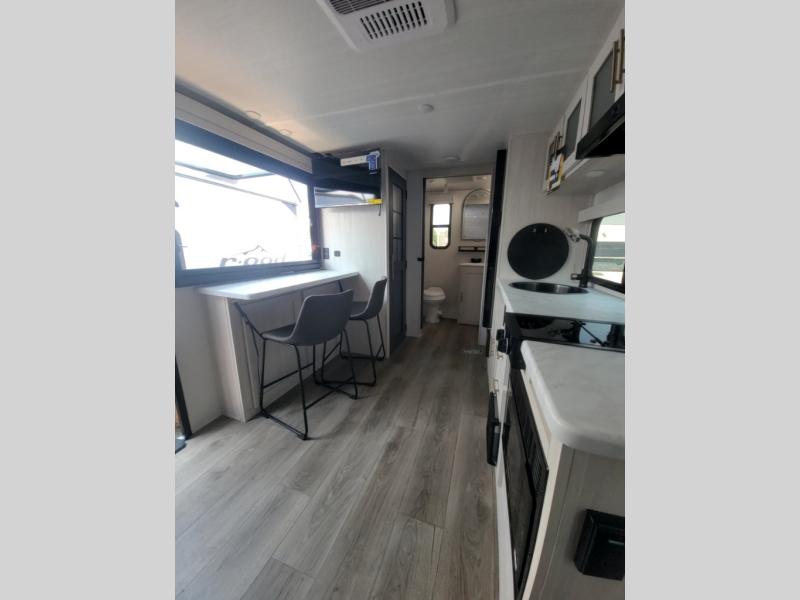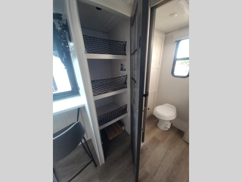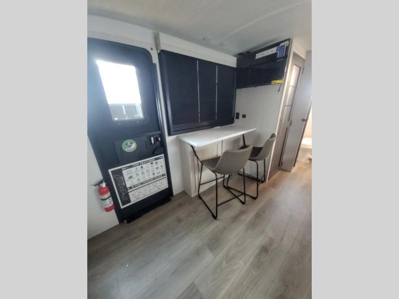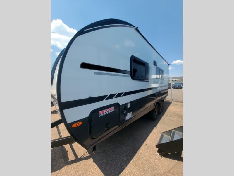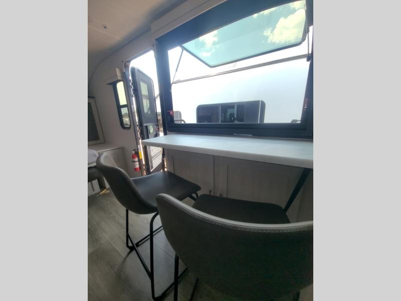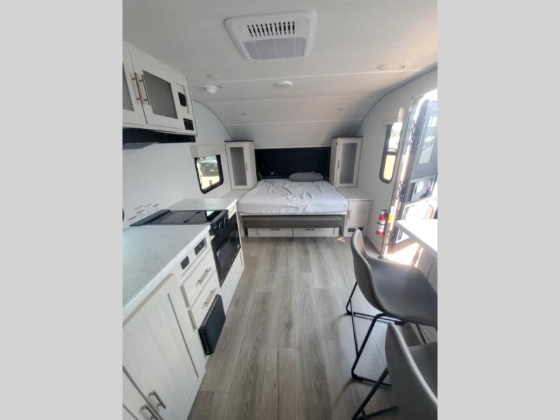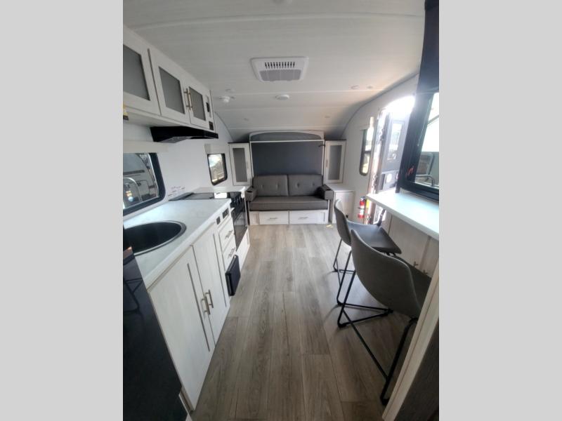 This versatile travel trailer is perfect for two adventure-seeking campers! You will love having a queen-size Murphy bed up front since you can fold it away during the day and relax on the sofa. There are also dual wardrobes to keep your clothes out of the way plus dual end end tables to set your coffee or book on. A full kitchen includes a convection microwave, 12V black glass refrigerator, and a counter with two chairs where you can dine each day. You will also love the flip-up window above the table, along with a 12V TV to keep you entertained, plus a pantry to keep food stocked. Head to the full rear bath that includes a large linen closet, a shower, and a night light for added convenience. The exterior is just as accommodating with its large roof mounted solar panel, rear accessory hitch, slam latch cargo doors, and more!