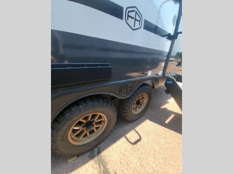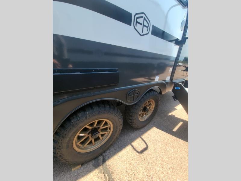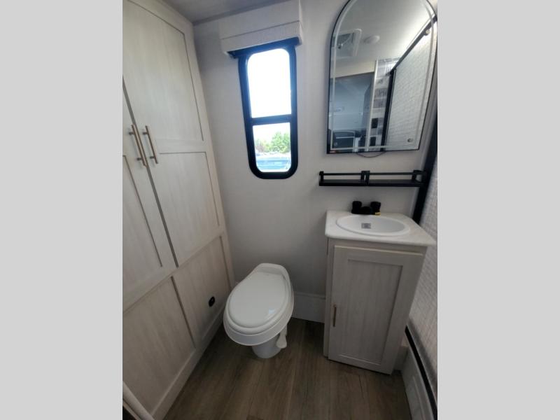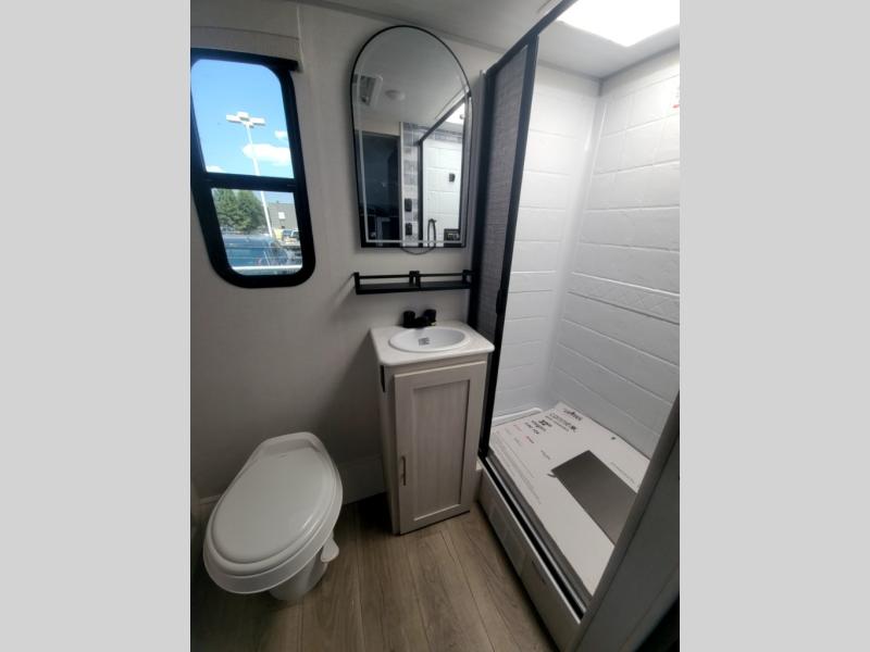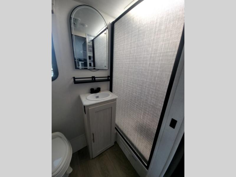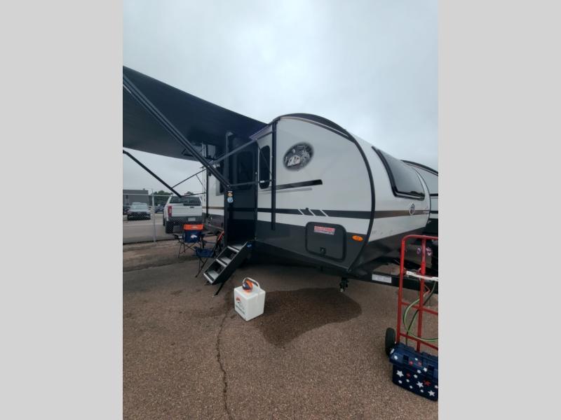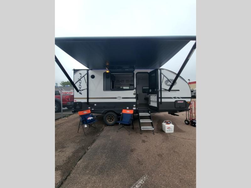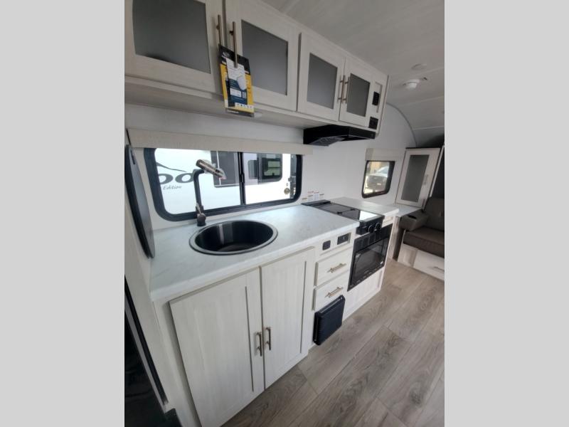 This versatile travel trailer is perfect for two adventure-seeking campers! You will love having a queen-size Murphy bed up front since you can fold it away during the day and relax on the sofa. There are also dual wardrobes to keep your clothes out of the way plus dual end end tables to set your coffee or book on. A full kitchen includes a convection microwave, 12V black glass refrigerator, and a counter with two chairs where you can dine each day. You will also love the flip-up window above the table, along with a 12V TV to keep you entertained, plus a pantry to keep food stocked. Head to the full rear bath that includes a large linen closet, a shower, and a night light for added convenience. The exterior is just as accommodating with its large roof mounted solar panel, rear accessory hitch, slam latch cargo doors, and more!