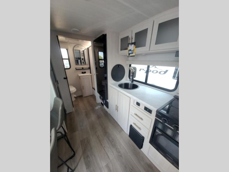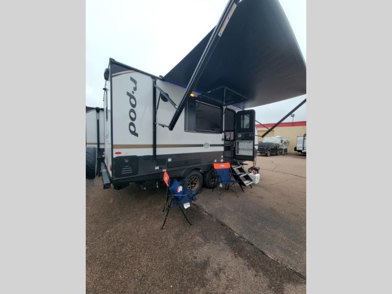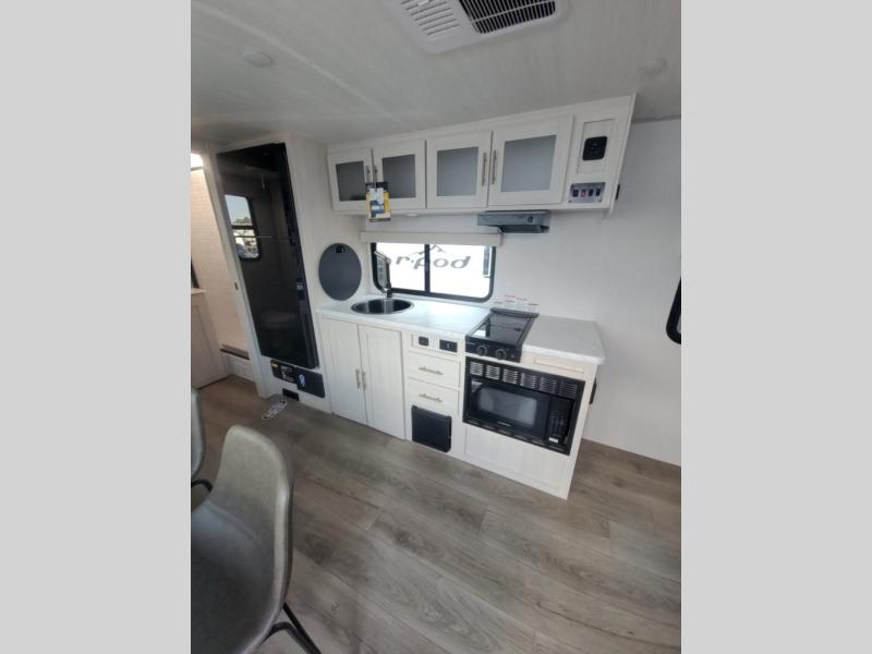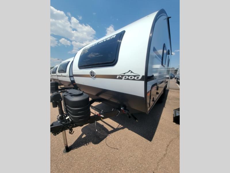 With any R-Pod travel trailer by Forest River, you will enjoy affordable luxury at the lowest tow weight in its class! There is a sealed underbelly with forced heat, a curved dual-pane acrylic front window with a bug screen and night shade, plus a large roof mounted solar panel for off-grid capabilities. The 15K A/C unit will keep you comfortable during the summer camping months, and the tankless water heater will provide endless hot showers after hiking, biking, swimming and more! Each model also includes a black glass friction hinge entrance door, roof ladder prep, exterior motion lighting, plus a hot and cold exterior spray port to wash off sand from the beach. Inside, you'll enjoy seamless Surf-X kitchen countertops, blackout roller shades, and a central vacuum system for hassle-free cleaning!