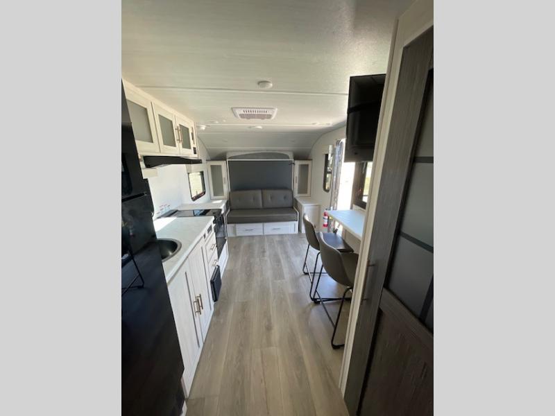 This versatile travel trailer is perfect for two adventure-seeking campers! You will love having a queen-size Murphy bed up front since you can fold it away during the day and relax on the sofa. There are also dual wardrobes to keep your clothes out of the way plus dual end end tables to set your coffee or book on. A full kitchen includes a convection microwave, 12V black glass refrigerator, and a counter with two chairs where you can dine each day. You will also love the flip-up window above the table, along with a 12V TV to keep you entertained, plus a pantry to keep food stocked. Head to the full rear bath that includes a large linen closet, a shower, and a night light for added convenience. The exterior is just as accommodating with its large roof mounted solar panel, rear accessory hitch, slam latch cargo doors, and more!