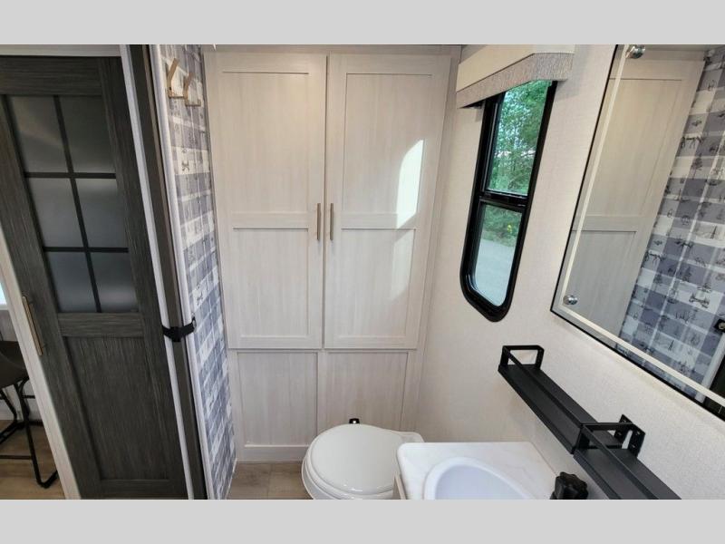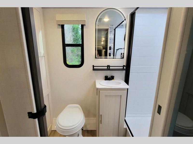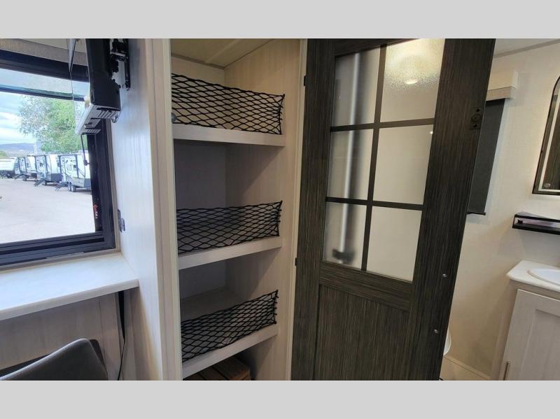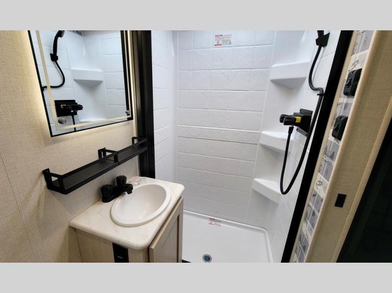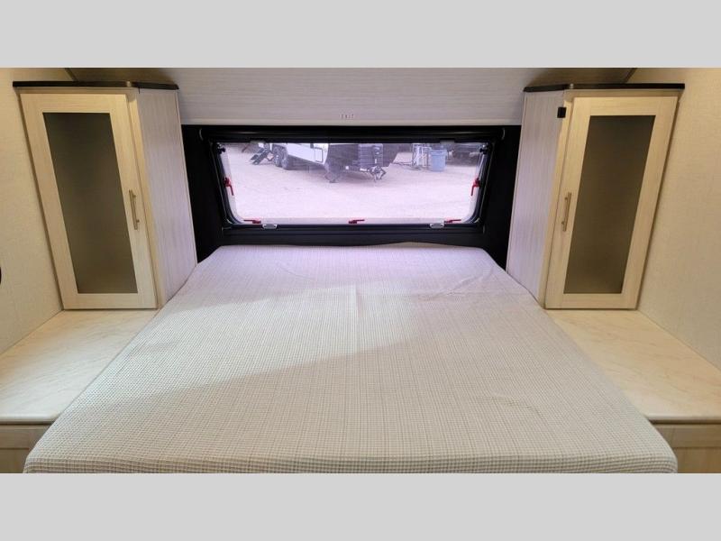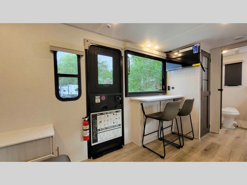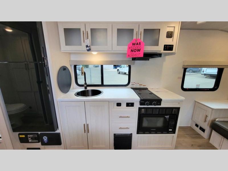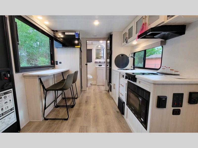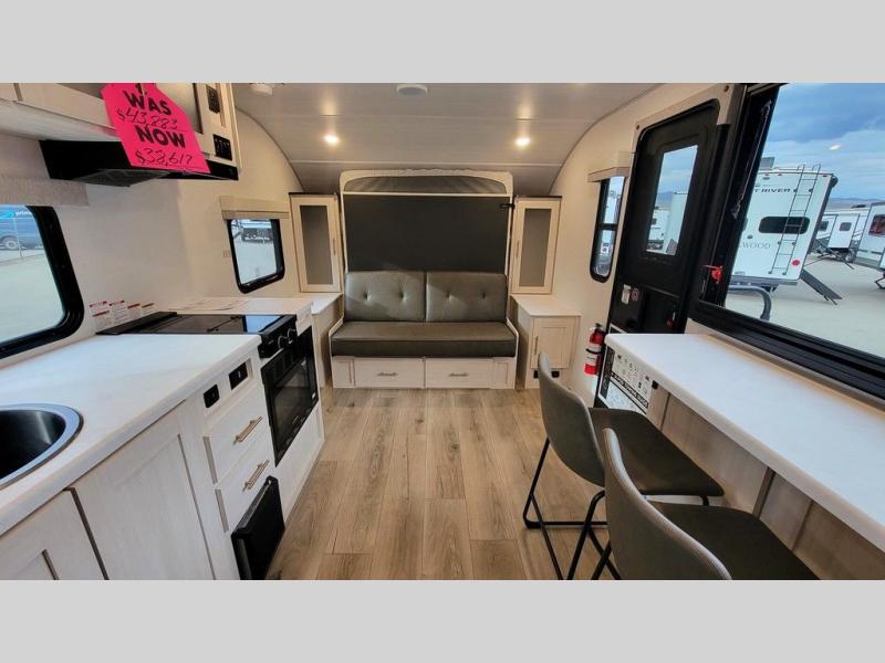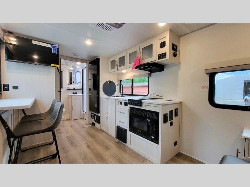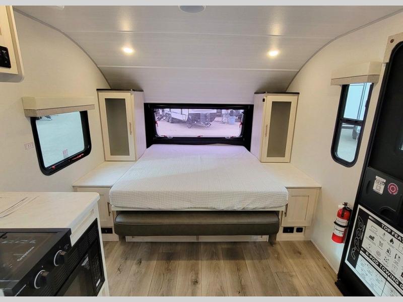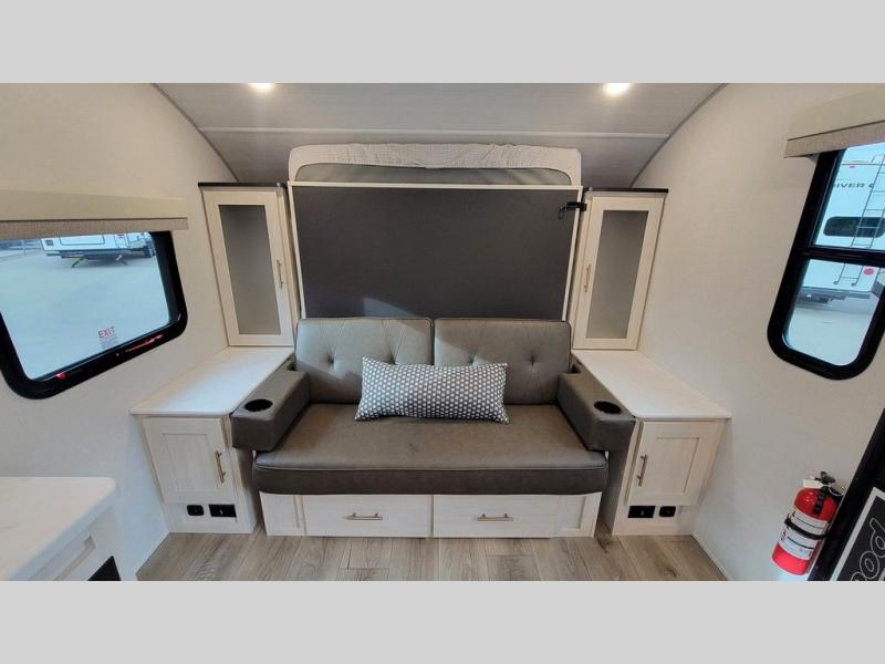 This versatile travel trailer is perfect for two adventure-seeking campers! You will love having a queen-size Murphy bed up front since you can fold it away during the day and relax on the sofa. There are also dual wardrobes to keep your clothes out of the way plus dual end end tables to set your coffee or book on. A full kitchen includes a convection microwave, 12V black glass refrigerator, and a counter with two chairs where you can dine each day. You will also love the flip-up window above the table, along with a 12V TV to keep you entertained, plus a pantry to keep food stocked. Head to the full rear bath that includes a large linen closet, a shower, and a night light for added convenience. The exterior is just as accommodating with its large roof mounted solar panel, rear accessory hitch, slam latch cargo doors, and more. This model also includes the Hood River Edition that comes with Mud Legend all terrain tires with TPMS, a MaxxAir vent cover, and 12V tank heaters!