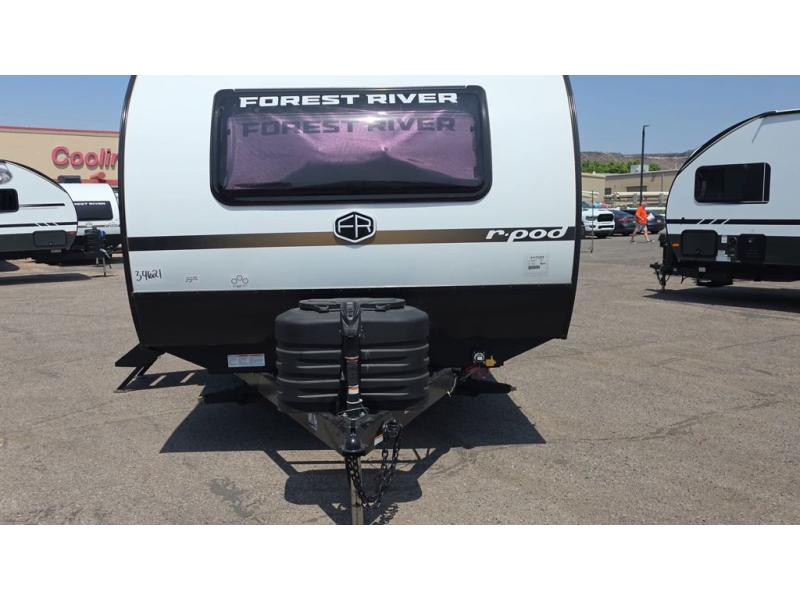 With any R-Pod travel trailer by Forest River, you will enjoy affordable luxury at the lowest tow weight in its class! There is a sealed underbelly with forced heat, a curved dual-pane acrylic front window with a bug screen and night shade, plus a large roof mounted solar panel for off-grid capabilities. The 15K A/C unit will keep you comfortable during the summer camping months, and the tankless water heater will provide endless hot showers after hiking, biking, swimming and more! Each model also includes a black glass friction hinge entrance door, roof ladder prep, exterior motion lighting, plus a hot and cold exterior spray port to wash off sand from the beach. Inside, you'll enjoy seamless Surf-X kitchen countertops, blackout roller shades, and a central vacuum system for hassle-free cleaning!