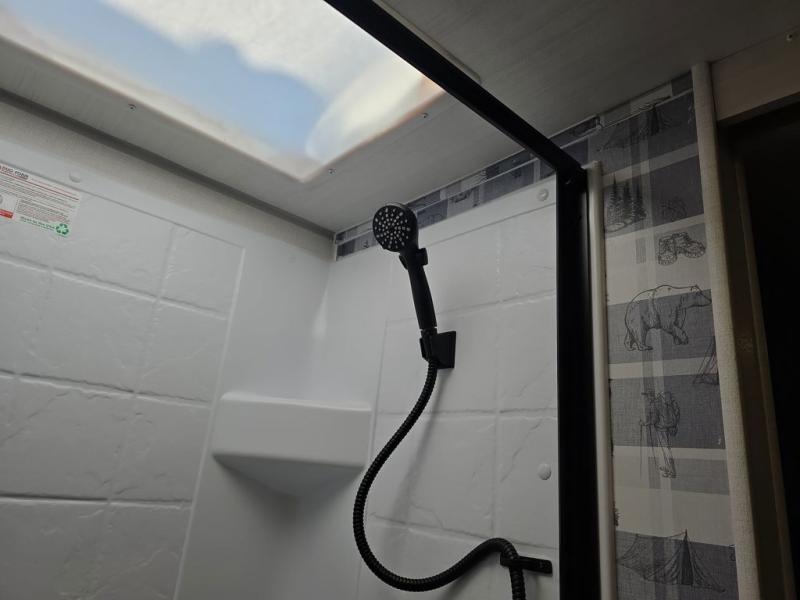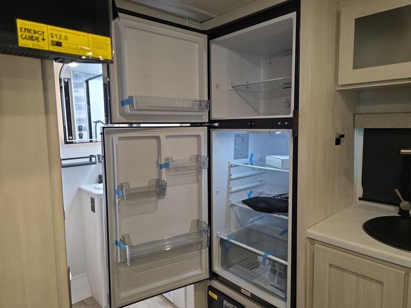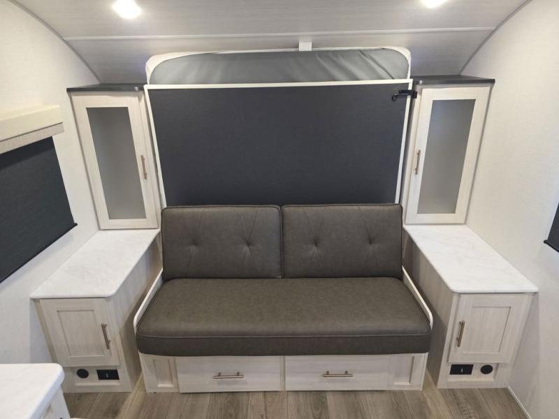 This versatile travel trailer is perfect for two adventure-seeking campers! You will love having a queen-size Murphy bed up front since you can fold it away during the day and relax on the sofa. There are also dual wardrobes to keep your clothes out of the way plus dual end end tables to set your coffee or book on. A full kitchen includes a convection microwave, 12V black glass refrigerator, and a counter with two chairs where you can dine each day. You will also love the flip-up window above the table, along with a 12V TV to keep you entertained, plus a pantry to keep food stocked. Head to the full rear bath that includes a large linen closet, a shower, and a night light for added convenience. The exterior is just as accommodating with its large roof mounted solar panel, rear accessory hitch, slam latch cargo doors, and more!