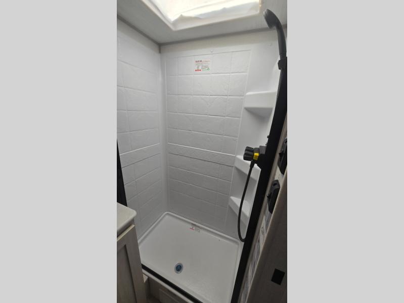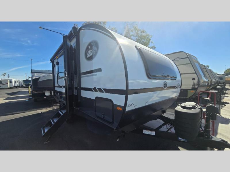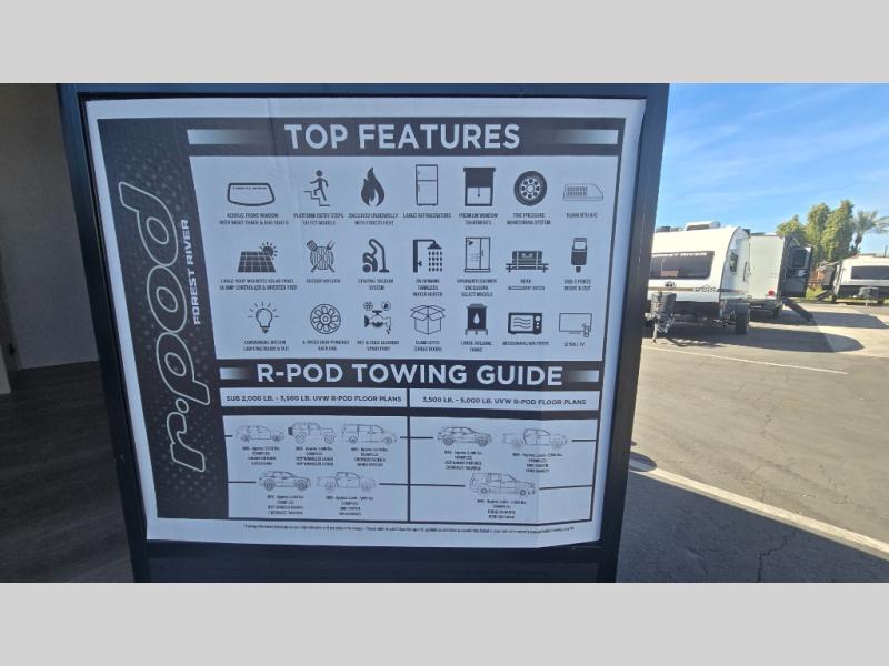 With any R-Pod travel trailer by Forest River, you will enjoy affordable luxury at the lowest tow weight in its class! There is a sealed underbelly with forced heat, a curved dual-pane acrylic front window with a bug screen and night shade, plus a large roof mounted solar panel for off-grid capabilities. The 15K A/C unit will keep you comfortable during the summer camping months, and the tankless water heater will provide endless hot showers after hiking, biking, swimming and more! Each model also includes a black glass friction hinge entrance door, roof ladder prep, exterior motion lighting, plus a hot and cold exterior spray port to wash off sand from the beach. Inside, you'll enjoy seamless Surf-X kitchen countertops, blackout roller shades, and a central vacuum system for hassle-free cleaning!