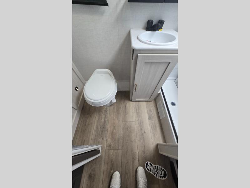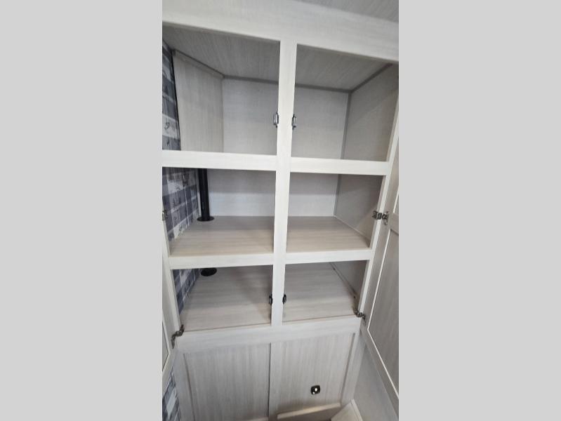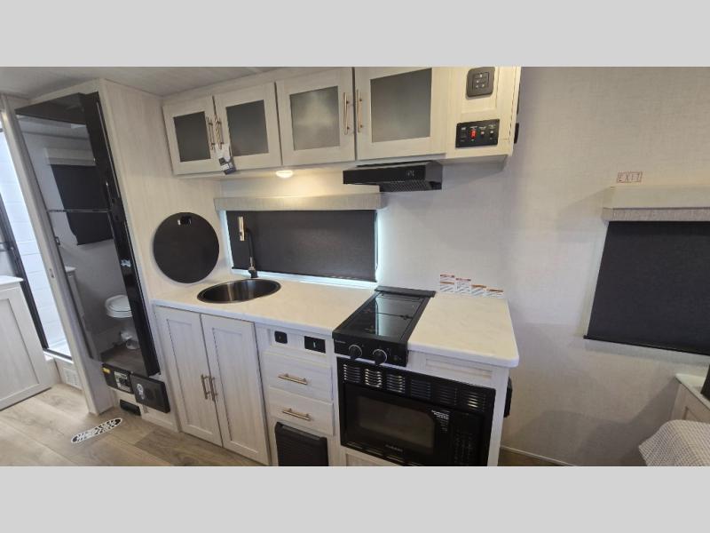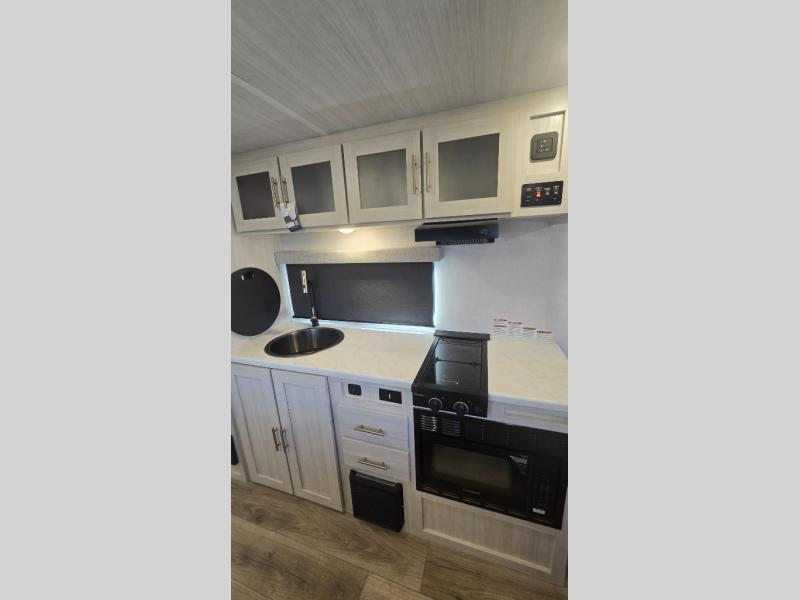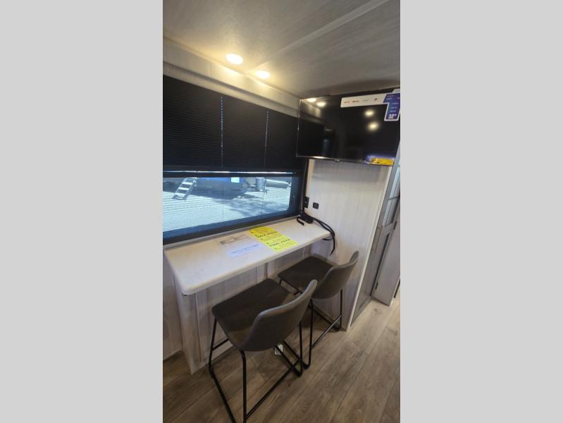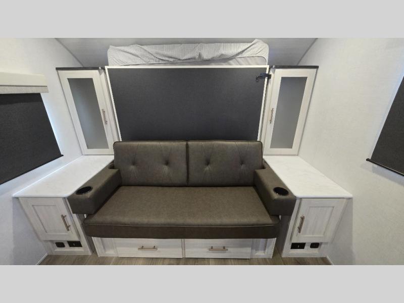 This versatile travel trailer is perfect for two adventure-seeking campers! You will love having a queen-size Murphy bed up front since you can fold it away during the day and relax on the sofa. There are also dual wardrobes to keep your clothes out of the way plus dual end end tables to set your coffee or book on. A full kitchen includes a convection microwave, 12V black glass refrigerator, and a counter with two chairs where you can dine each day. You will also love the flip-up window above the table, along with a 12V TV to keep you entertained, plus a pantry to keep food stocked. Head to the full rear bath that includes a large linen closet, a shower, and a night light for added convenience. The exterior is just as accommodating with its large roof mounted solar panel, rear accessory hitch, slam latch cargo doors, and more. This model also includes the Hood River Edition that comes with Mud Legend all terrain tires with TPMS, a MaxxAir vent cover, and 12V tank heaters!