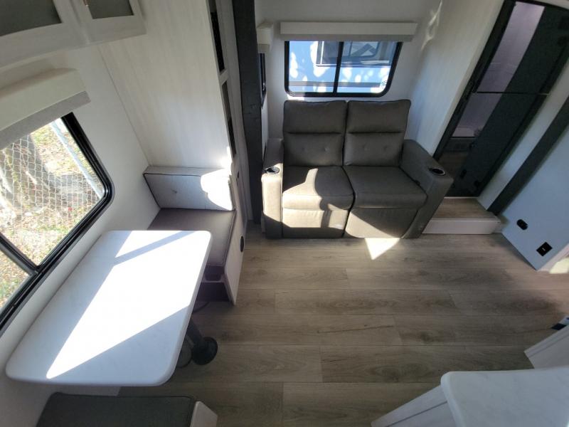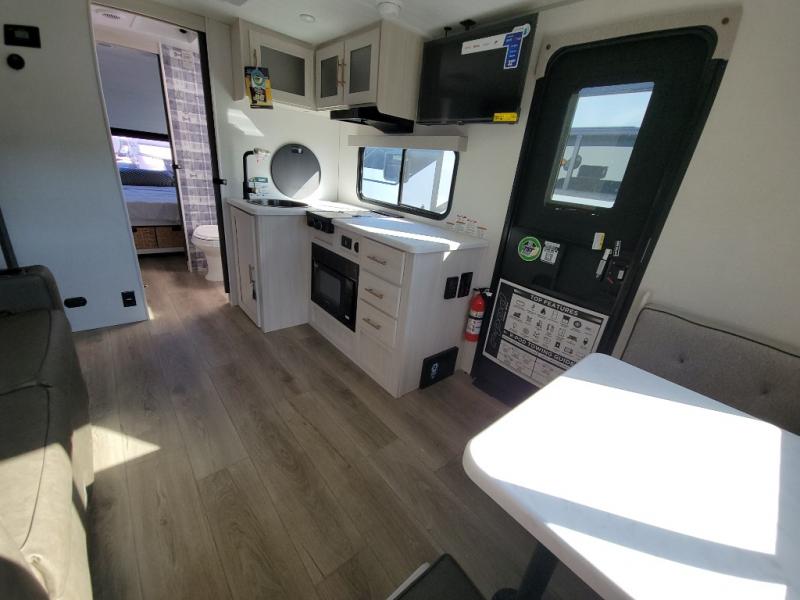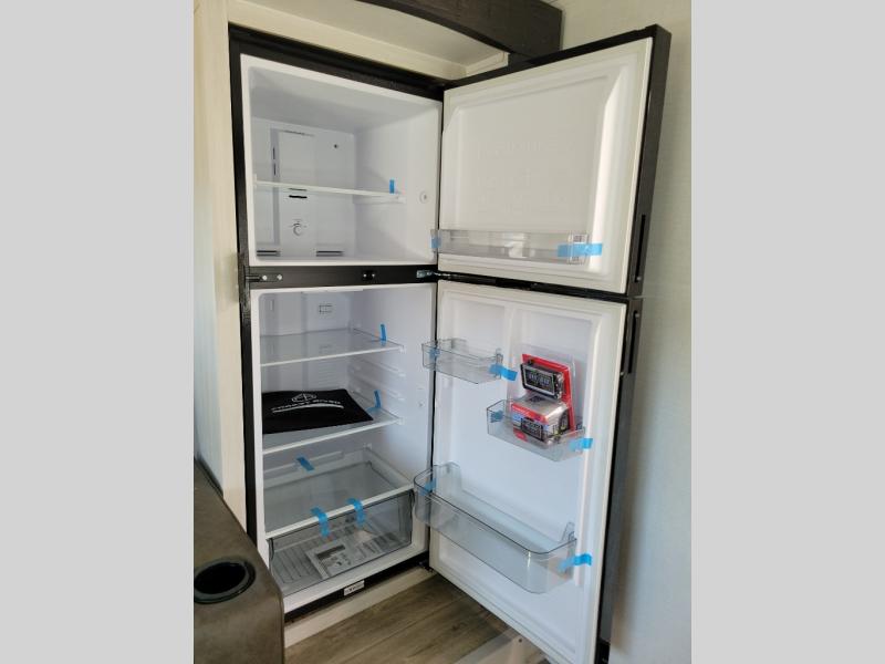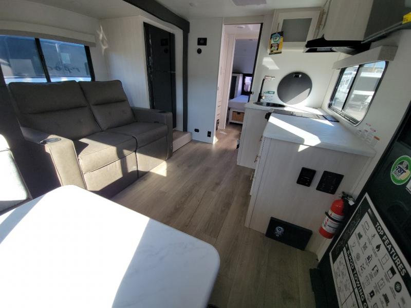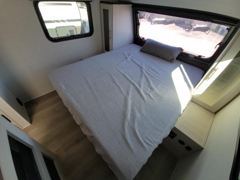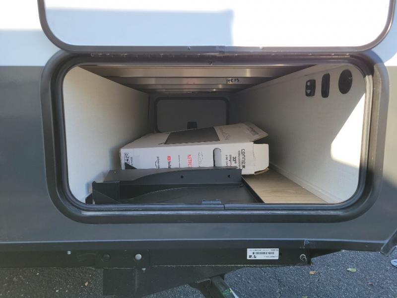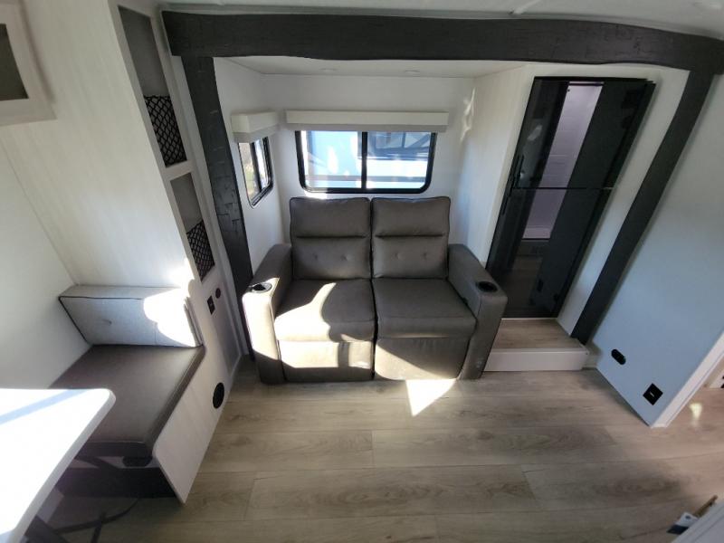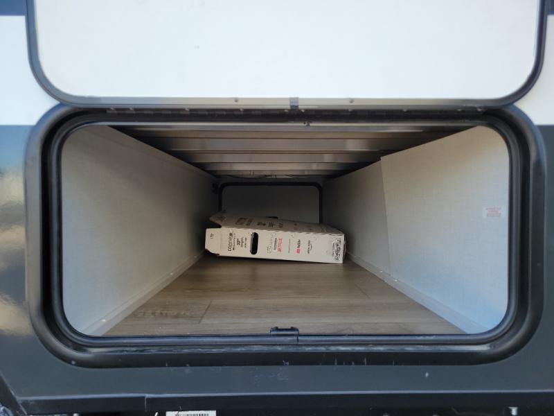 Whether you spend your days at the lake or in the woods, you'll be met with comfort in this spacious travel trailer. There is a rear dinette where you can enjoy your meals together, a 56" theater seat across from a 12V TV, and a slide out for added space. The walk-thru bath includes a night light for easy nighttime use, and the front master bedroom includes a queen bed just like at home. There are also dual wardrobes and end tables plus an entertainment center if you want to add a TV. Outside, you'll find a rear accessory hitch, a 14' awning, and a slam latch cargo doors to keep your gear secure. This model also includes the Hood River Edition that comes with Mud Legend all terrain tires with TPMS, a MaxxAir vent cover, and 12V tank heaters!