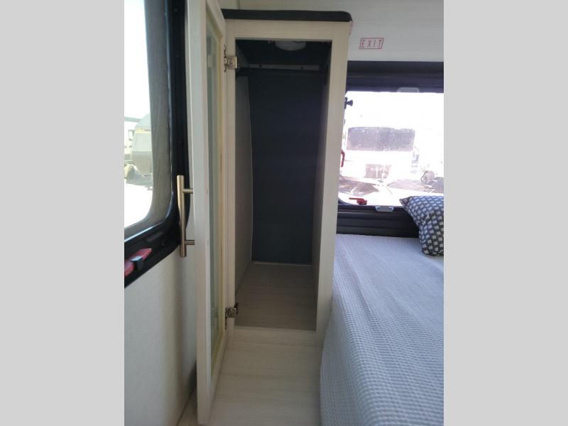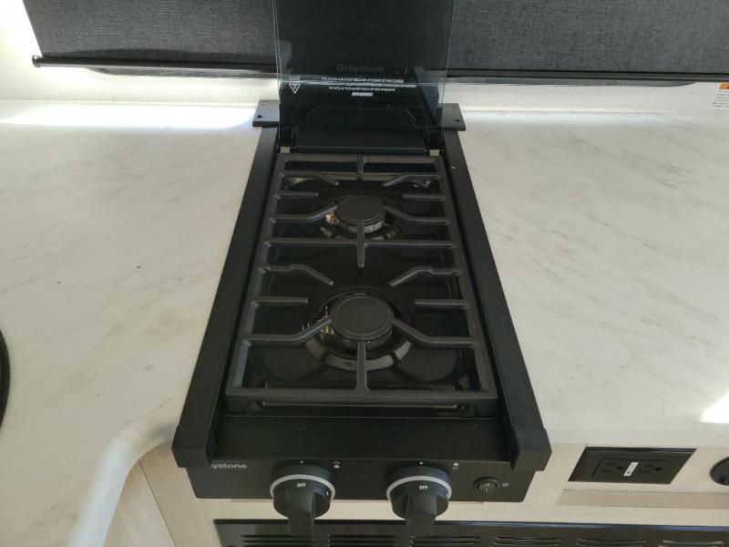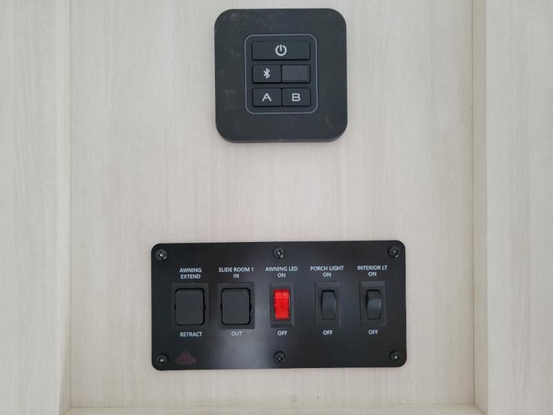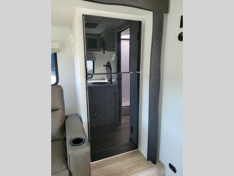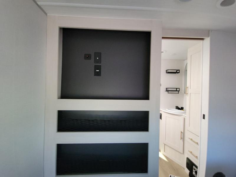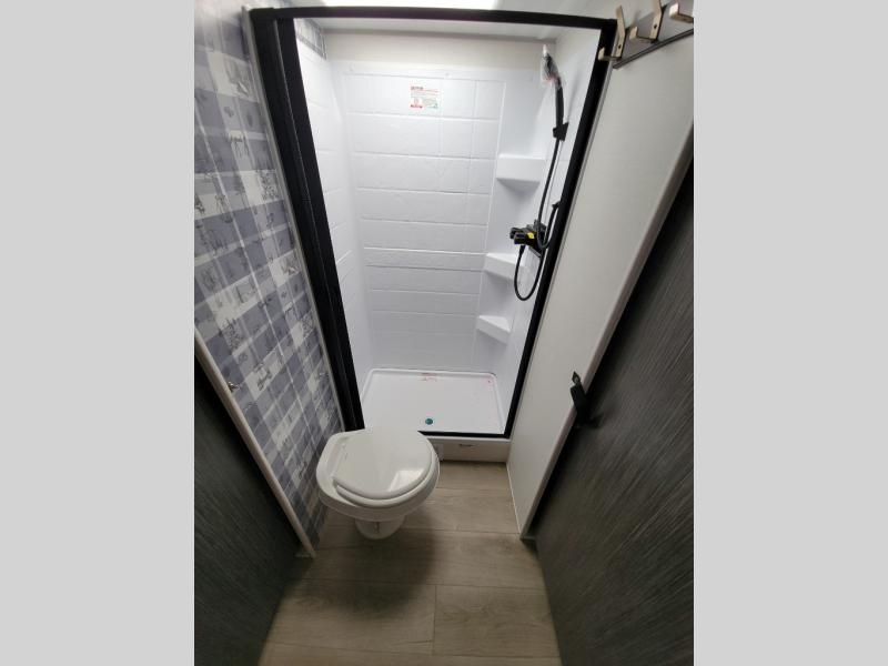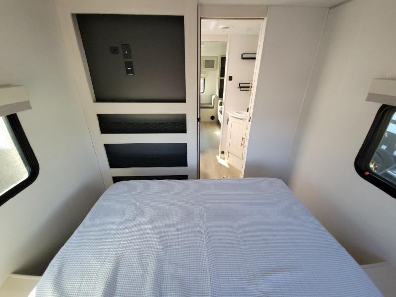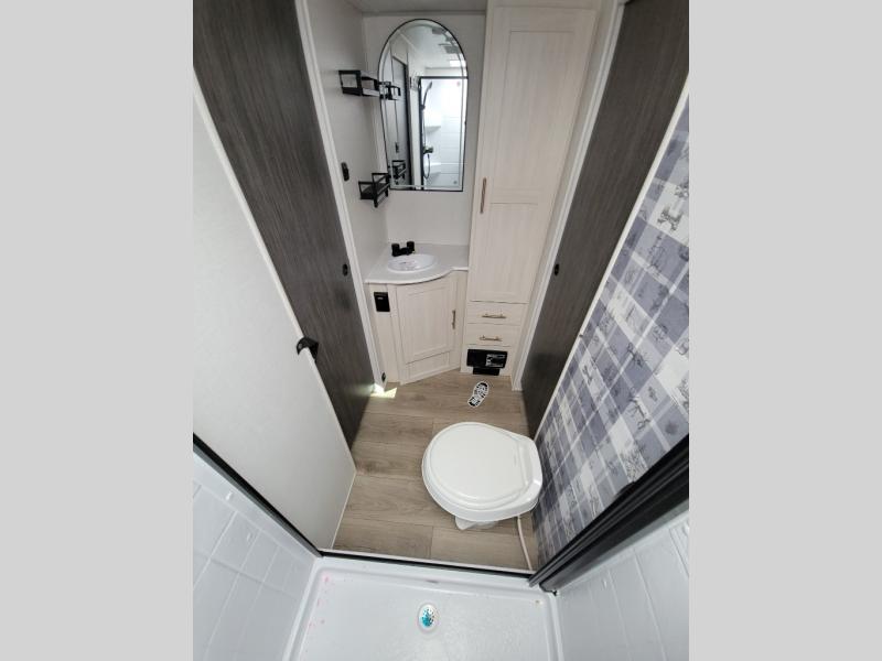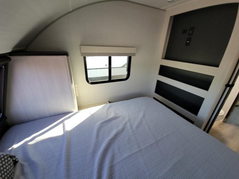 Whether you spend your days at the lake or in the woods, you'll be met with comfort in this spacious travel trailer. There is a rear dinette where you can enjoy your meals together, a 56" theater seat across from a 12V TV, and a slide out for added space. The walk-thru bath includes a night light for easy nighttime use, and the front master bedroom includes a queen bed just like at home. There are also dual wardrobes and end tables plus an entertainment center if you want to add a TV. Outside, you'll find a rear accessory hitch, a 14' awning, and a slam latch cargo doors to keep your gear secure. This model also includes the Hood River Edition that comes with Mud Legend all terrain tires with TPMS, a MaxxAir vent cover, and 12V tank heaters!