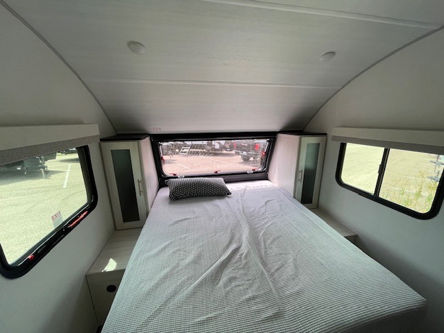 Whether you spend your days at the lake or in the woods, you'll be met with comfort in this spacious travel trailer. There is a rear dinette where you can enjoy your meals together, a 56" theater seat across from a 12V TV, and a slide out for added space. The walk-through bath includes a night light for easy nighttime use, and the front master bedroom includes a queen bed just like at home. There are also dual wardrobes and end tables plus an entertainment center if you want to add a TV. Outside, you'll find a rear accessory hitch, upgraded tires with TPMS, a 14' awning, and a slam latch cargo doors to keep your gear secure.