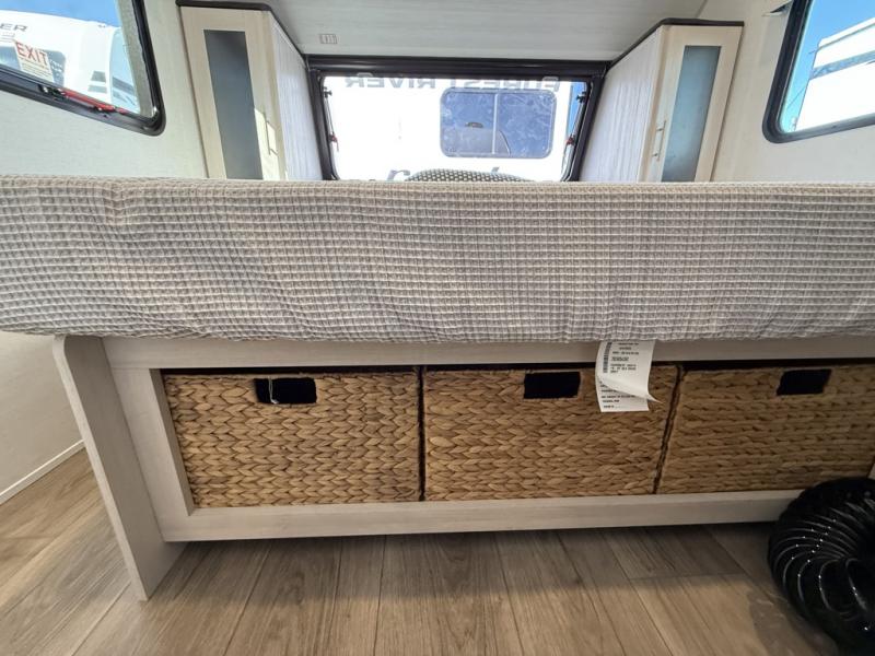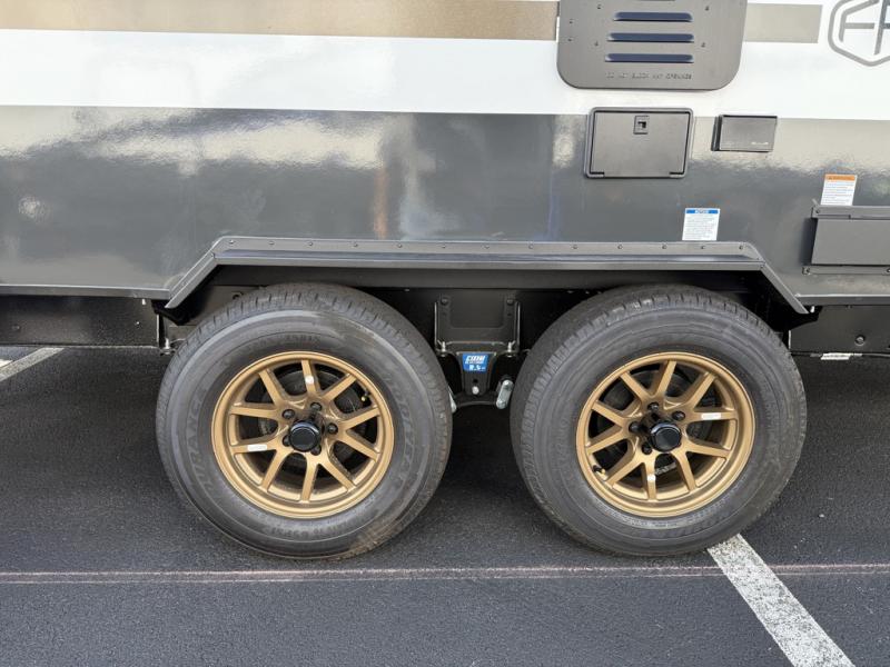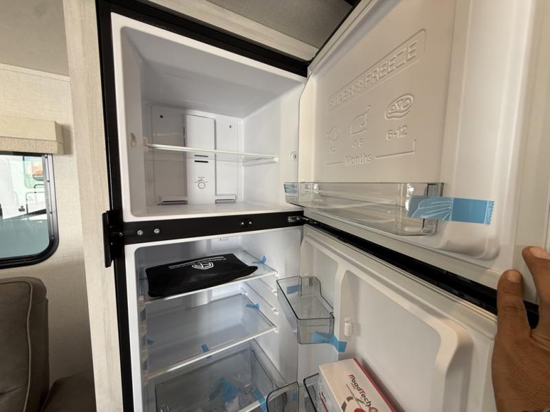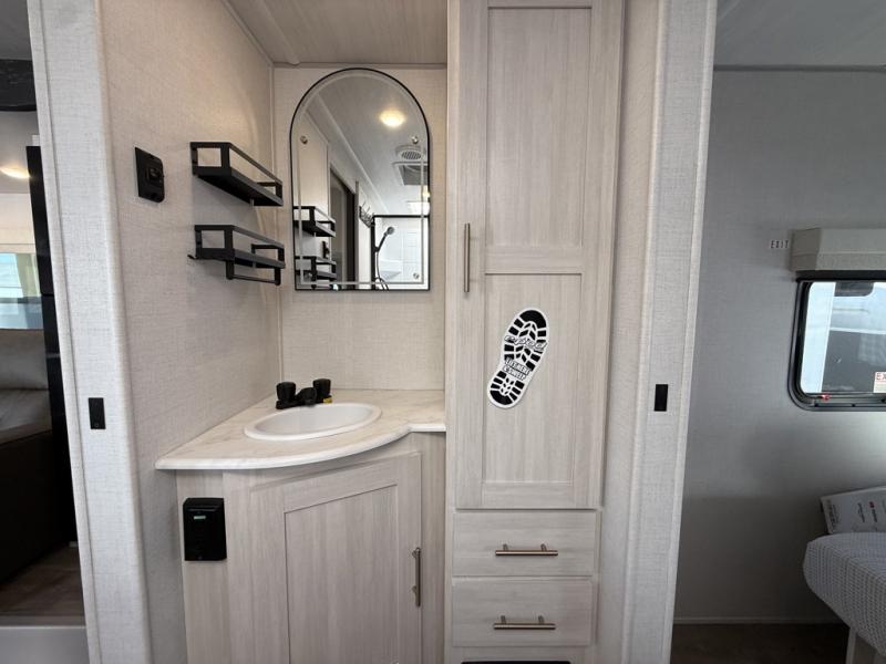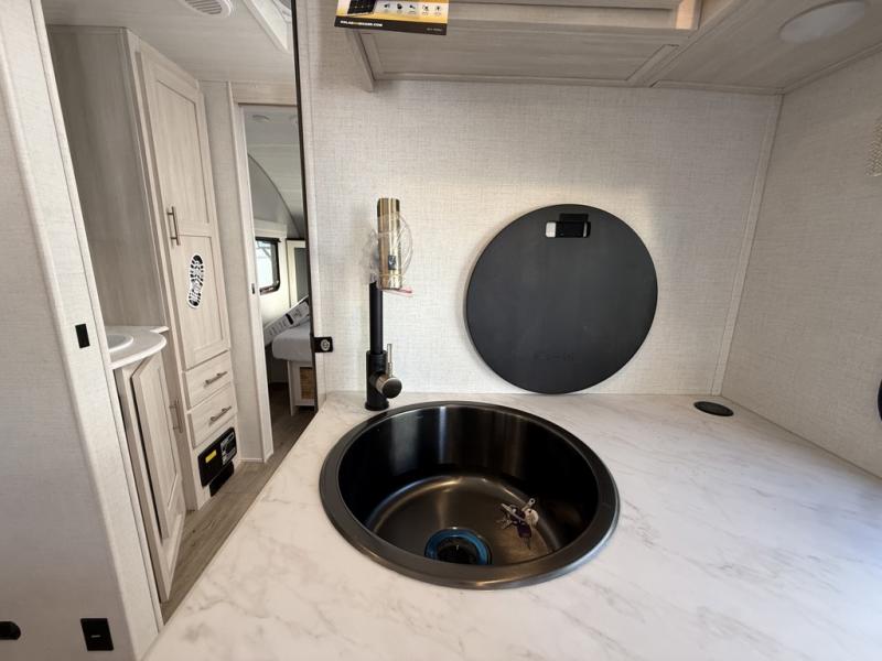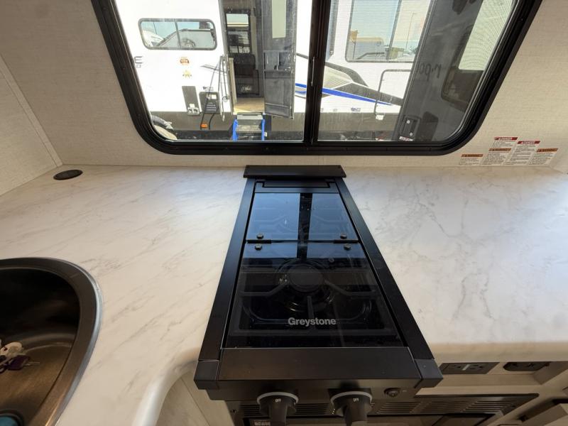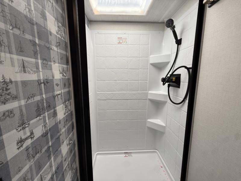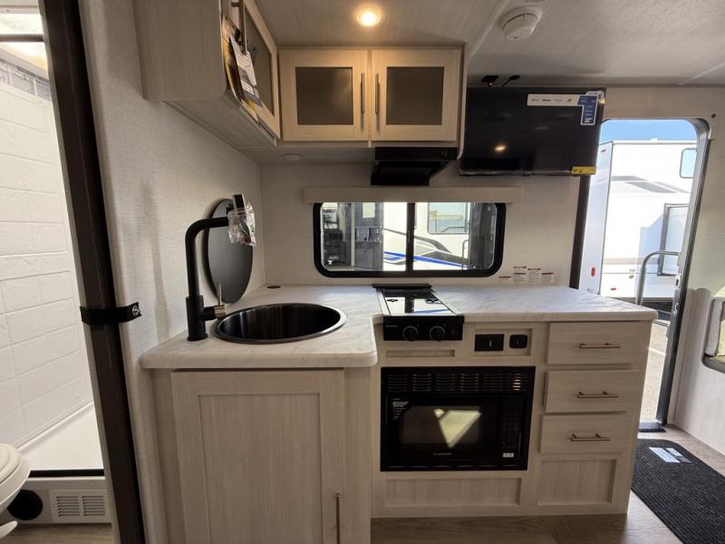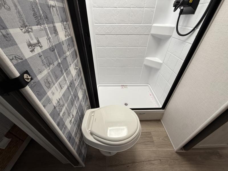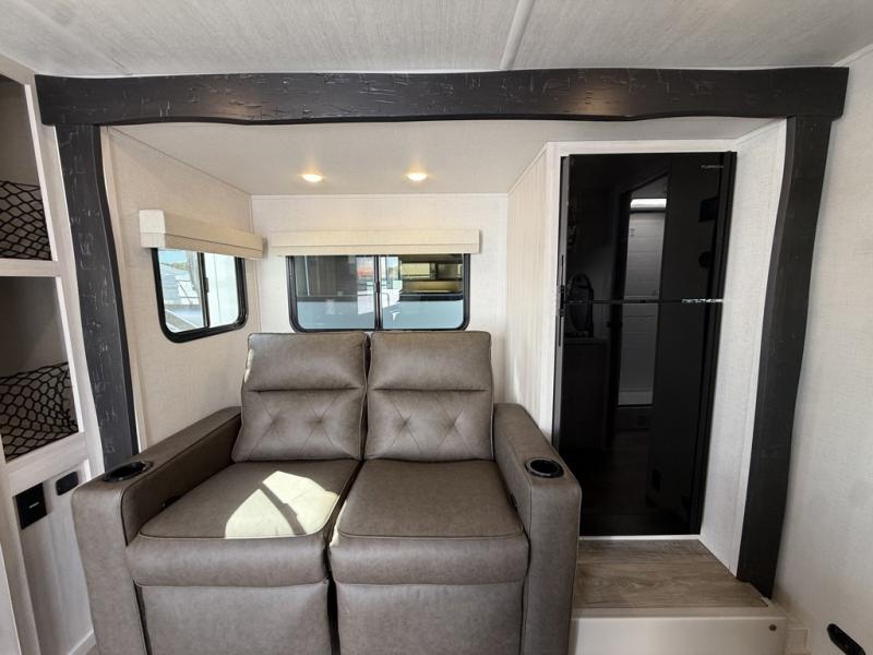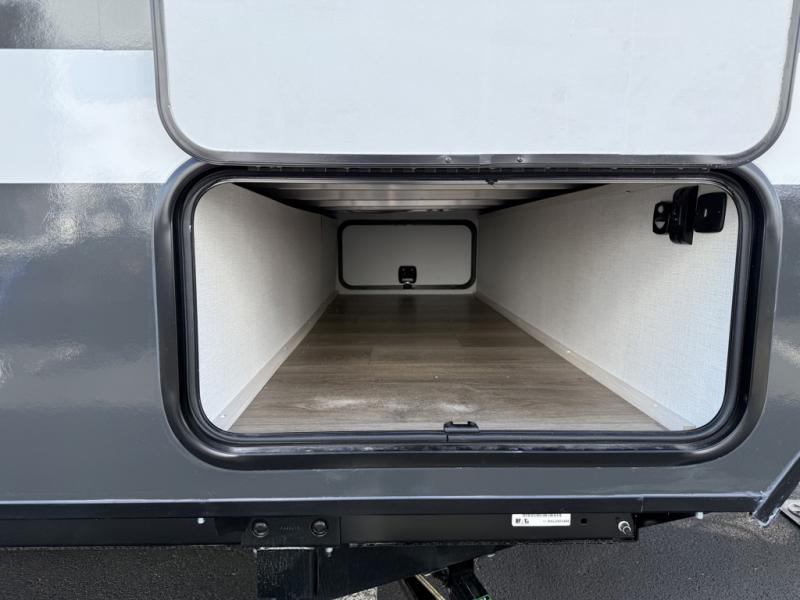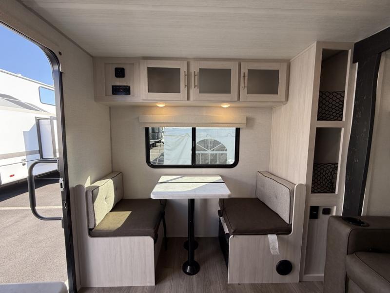 Whether you spend your days at the lake or in the woods, you'll be met with comfort in this spacious travel trailer. There is a rear dinette where you can enjoy your meals together, a 56" theater seat across from a 12V TV, and a slide out for added space. The walk-through bath includes a night light for easy nighttime use, and the front master bedroom includes a queen bed just like at home. There are also dual wardrobes and end tables plus an entertainment center if you want to add a TV. Outside, you'll find a rear accessory hitch, upgraded tires with TPMS, a 14' awning, and a slam latch cargo doors to keep your gear secure.