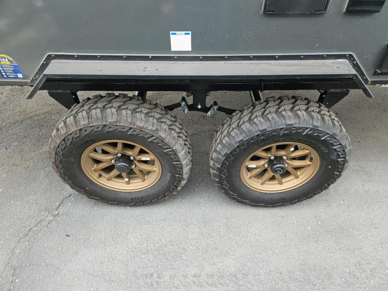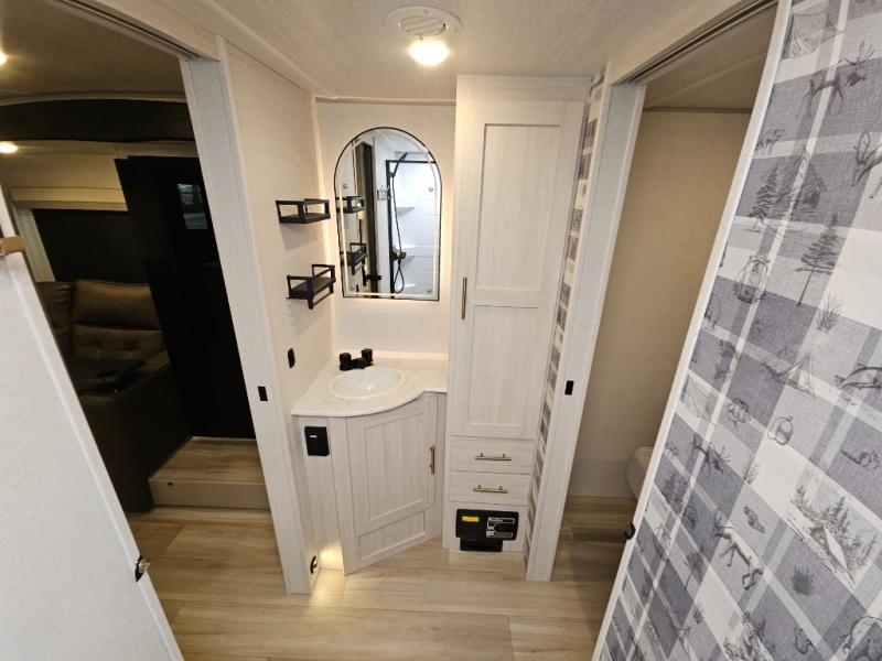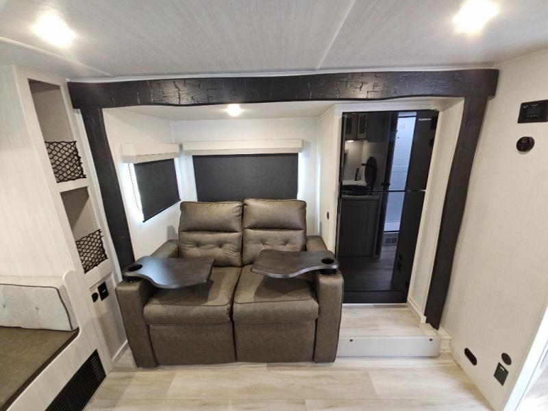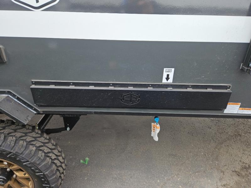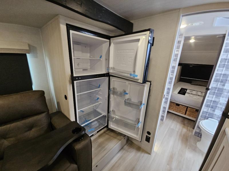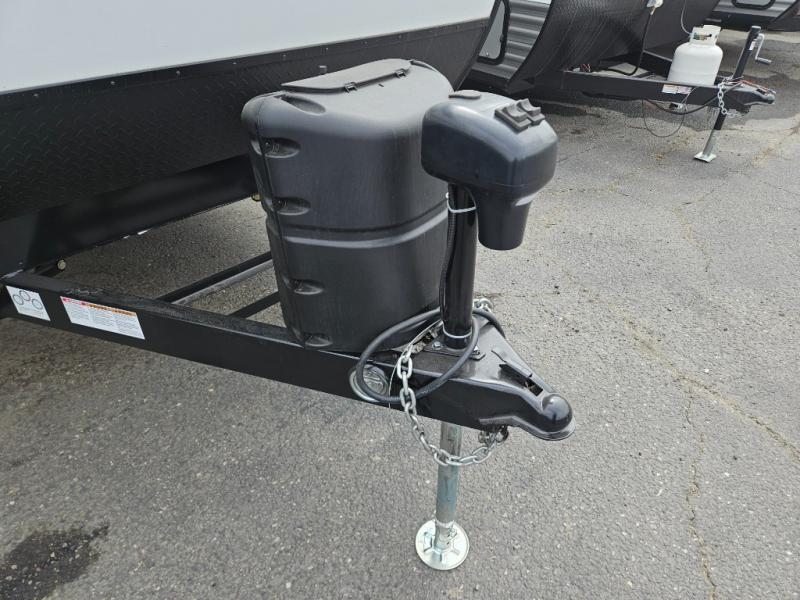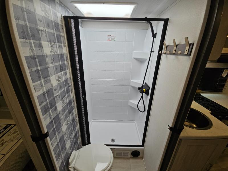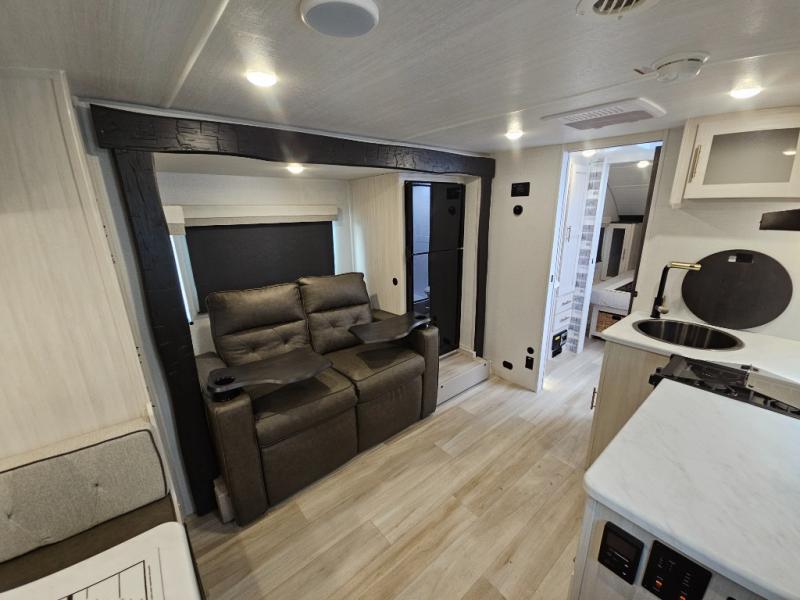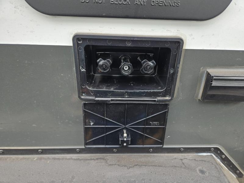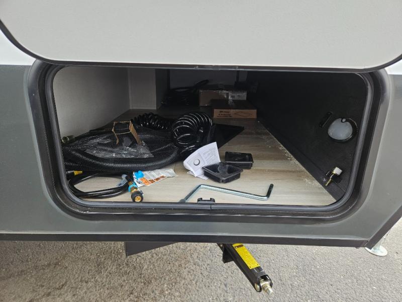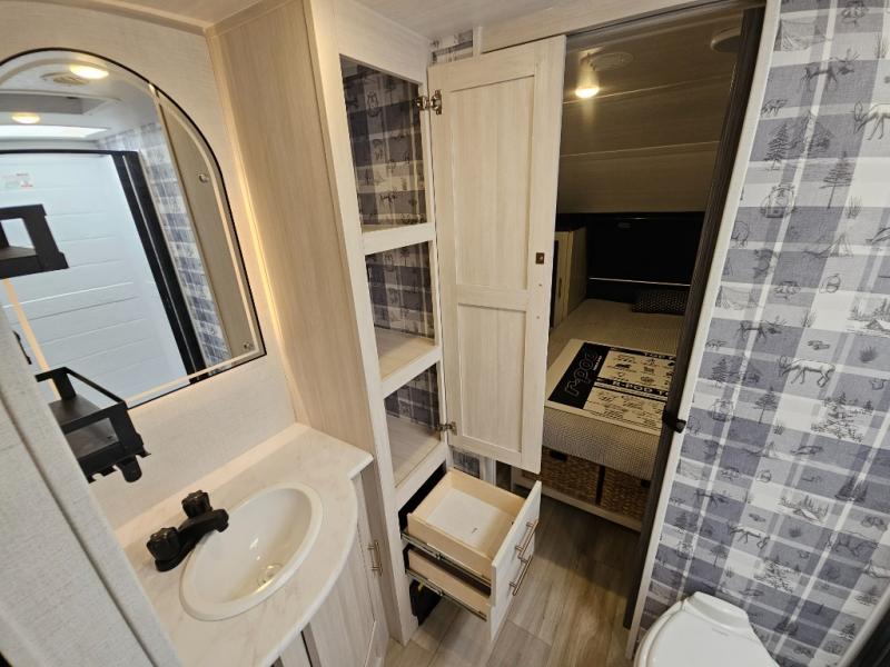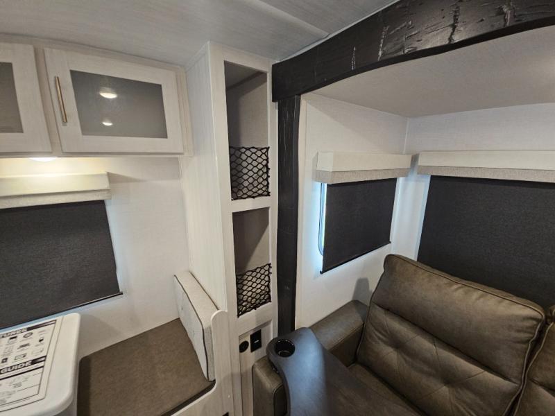 Whether you spend your days at the lake or in the woods, you'll be met with comfort in this spacious travel trailer. There is a rear dinette where you can enjoy your meals together, a 56" theater seat across from a 12V TV, and a slide out for added space. The walk-thru bath includes a night light for easy nighttime use, and the front master bedroom includes a queen bed just like at home. There are also dual wardrobes and end tables plus an entertainment center if you want to add a TV. Outside, you'll find a rear accessory hitch, a 14' awning, and a slam latch cargo doors to keep your gear secure. This model also includes the Hood River Edition that comes with Mud Legend all terrain tires with TPMS, a MaxxAir vent cover, and 12V tank heaters!