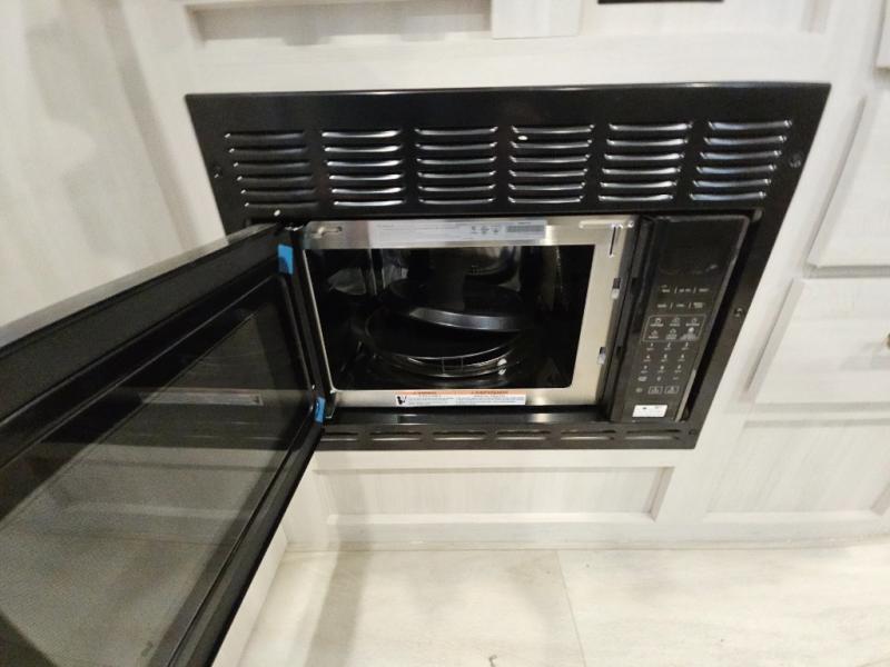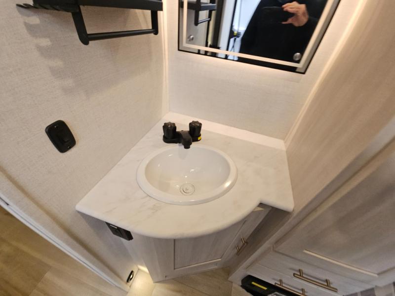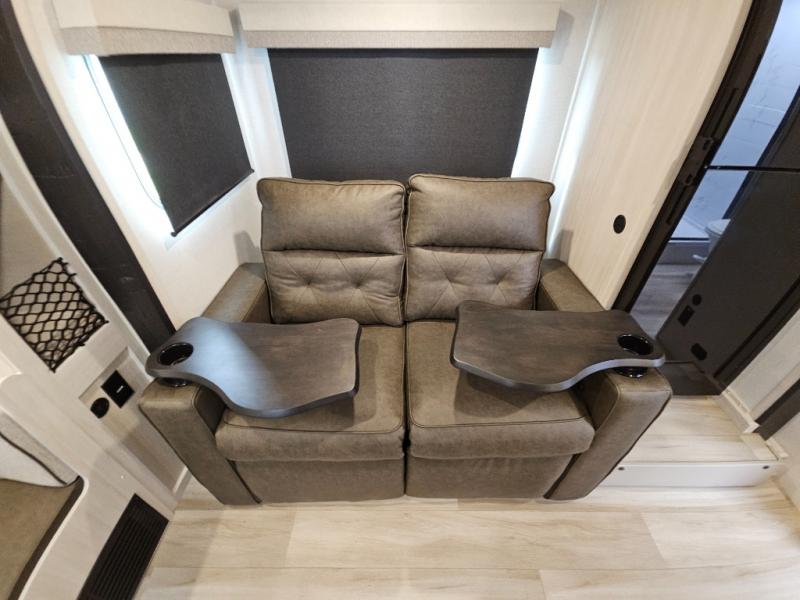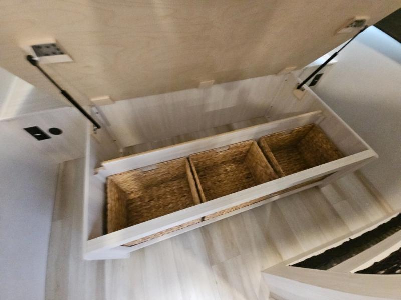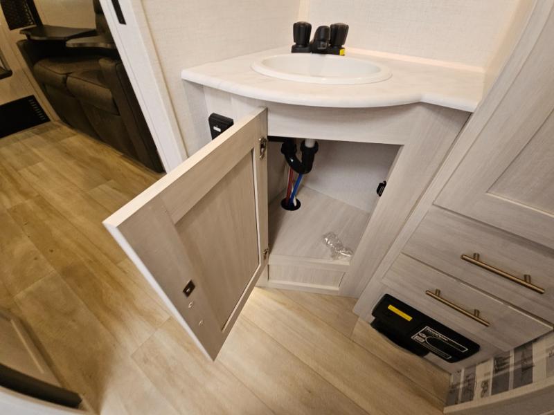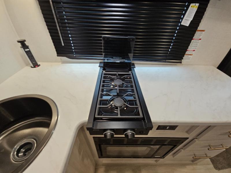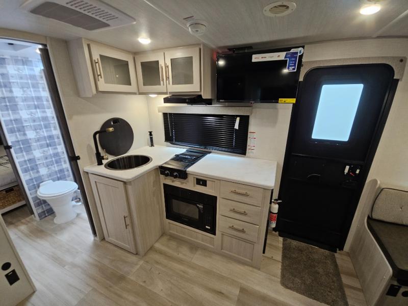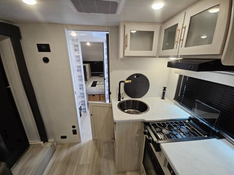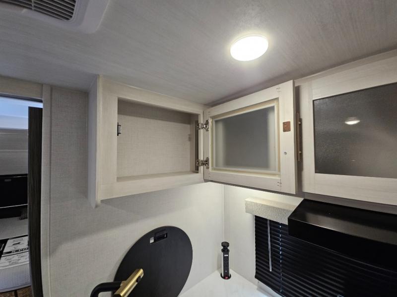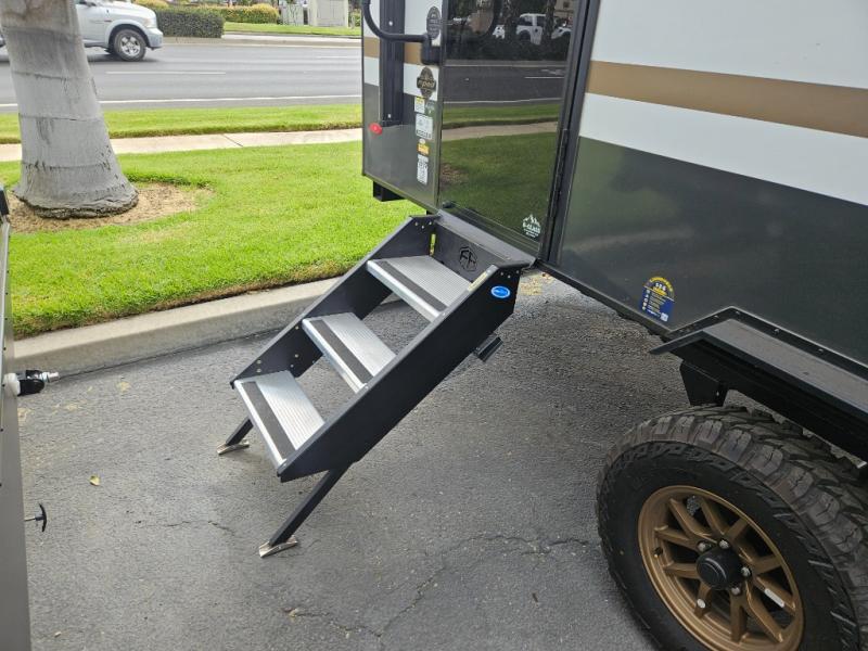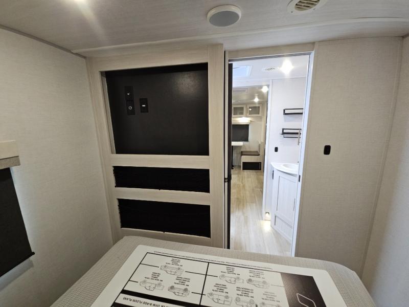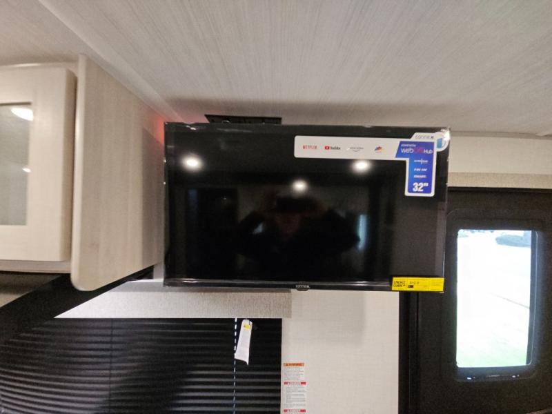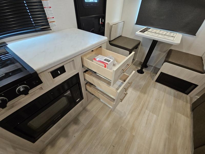 Whether you spend your days at the lake or in the woods, you'll be met with comfort in this spacious travel trailer. There is a rear dinette where you can enjoy your meals together, a 56" theater seat across from a 12V TV, and a slide out for added space. The walk-thru bath includes a night light for easy nighttime use, and the front master bedroom includes a queen bed just like at home. There are also dual wardrobes and end tables plus an entertainment center if you want to add a TV. Outside, you'll find a rear accessory hitch, a 14' awning, and a slam latch cargo doors to keep your gear secure. This model also includes the Hood River Edition that comes with Mud Legend all terrain tires with TPMS, a MaxxAir vent cover, and 12V tank heaters!