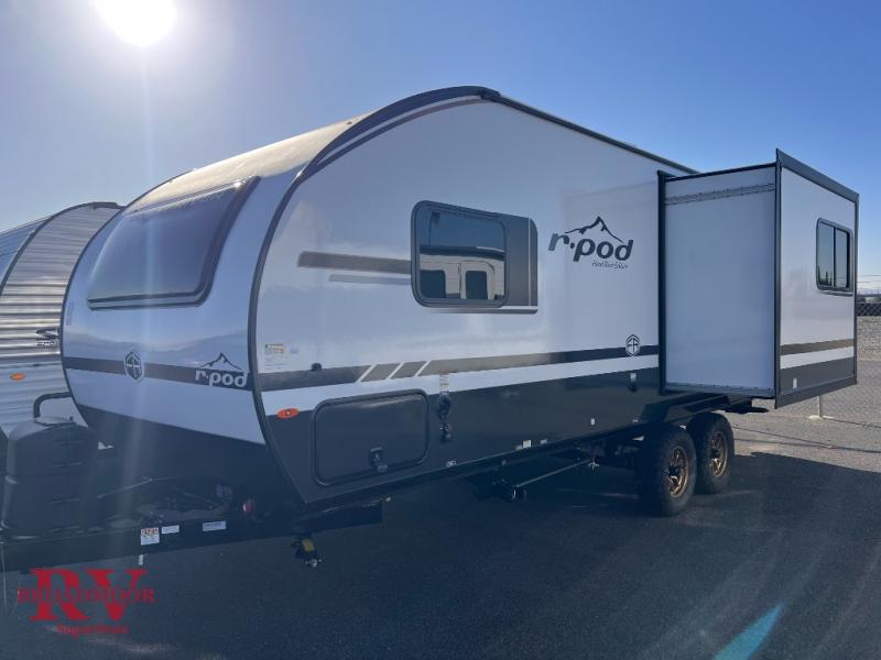 With any R-Pod travel trailer by Forest River, you will enjoy affordable luxury at the lowest tow weight in its class! There is a sealed underbelly with forced heat, a curved dual-pane acrylic front window with a bug screen and night shade, plus a large roof mounted solar panel for off-grid capabilities. The 15K A/C unit will keep you comfortable during the summer camping months, and the tankless water heater will provide endless hot showers after hiking, biking, swimming and more! Each model also includes a black glass friction hinge entrance door, roof ladder prep, exterior motion lighting, plus a hot and cold exterior spray port to wash off sand from the beach. Inside, you'll enjoy seamless Surf-X kitchen countertops, blackout roller shades, and a central vacuum system for hassle-free cleaning!